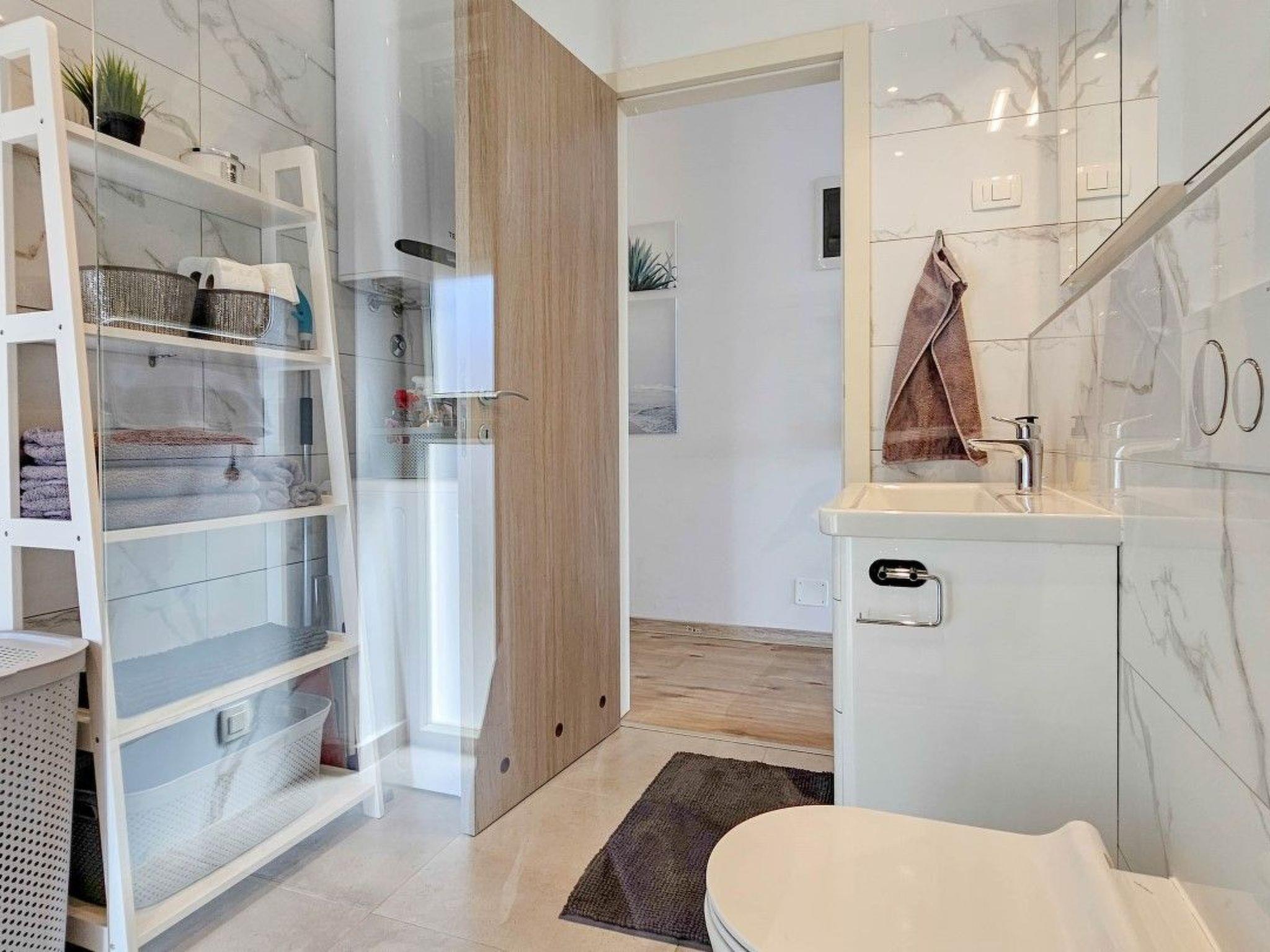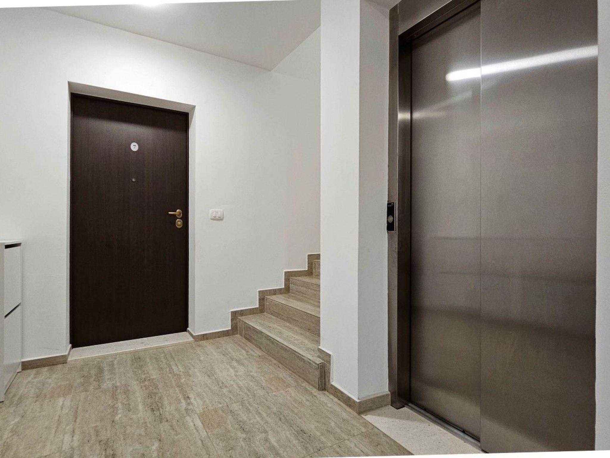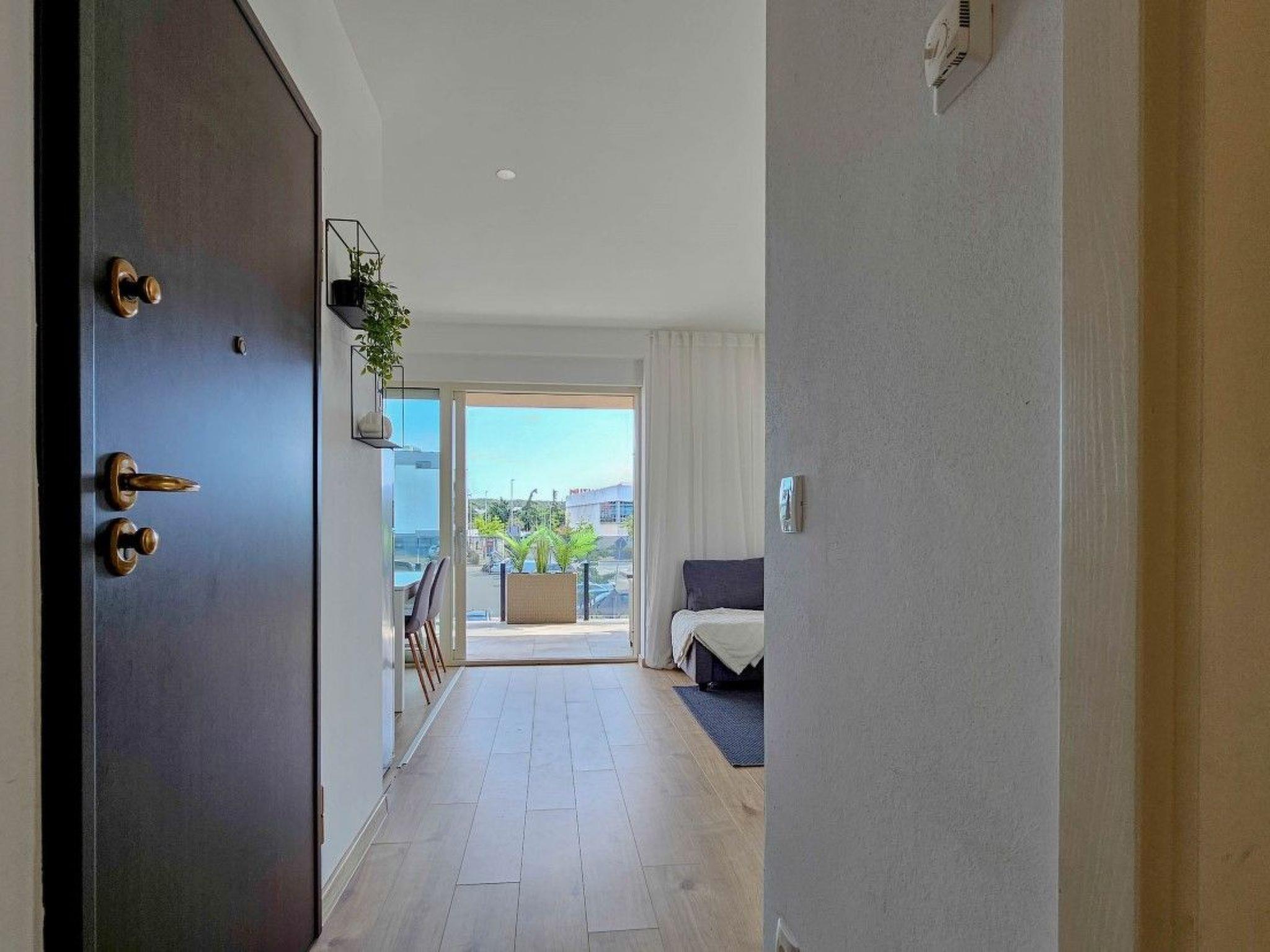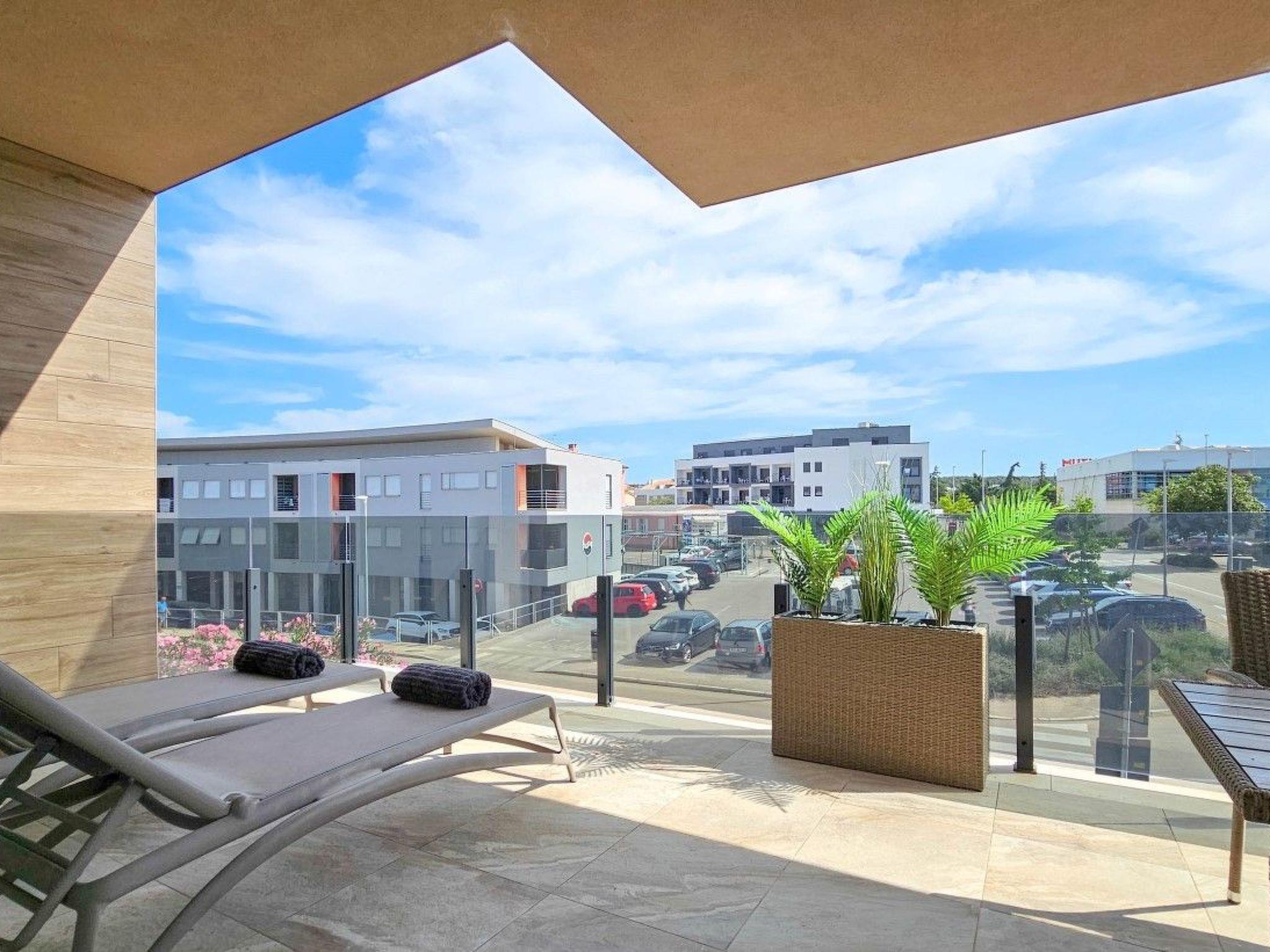 Guests have access to two balconies, one connected to the bedroom, and the other has an exit from the living room and is equipped with sun loungers, a parasol and a comfortable seating area.