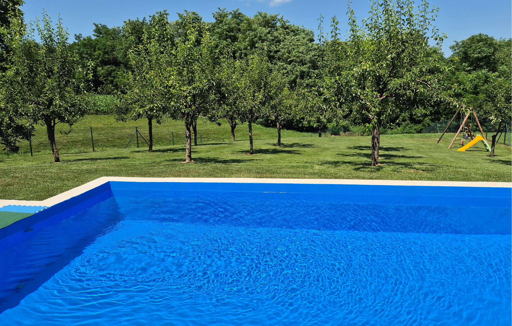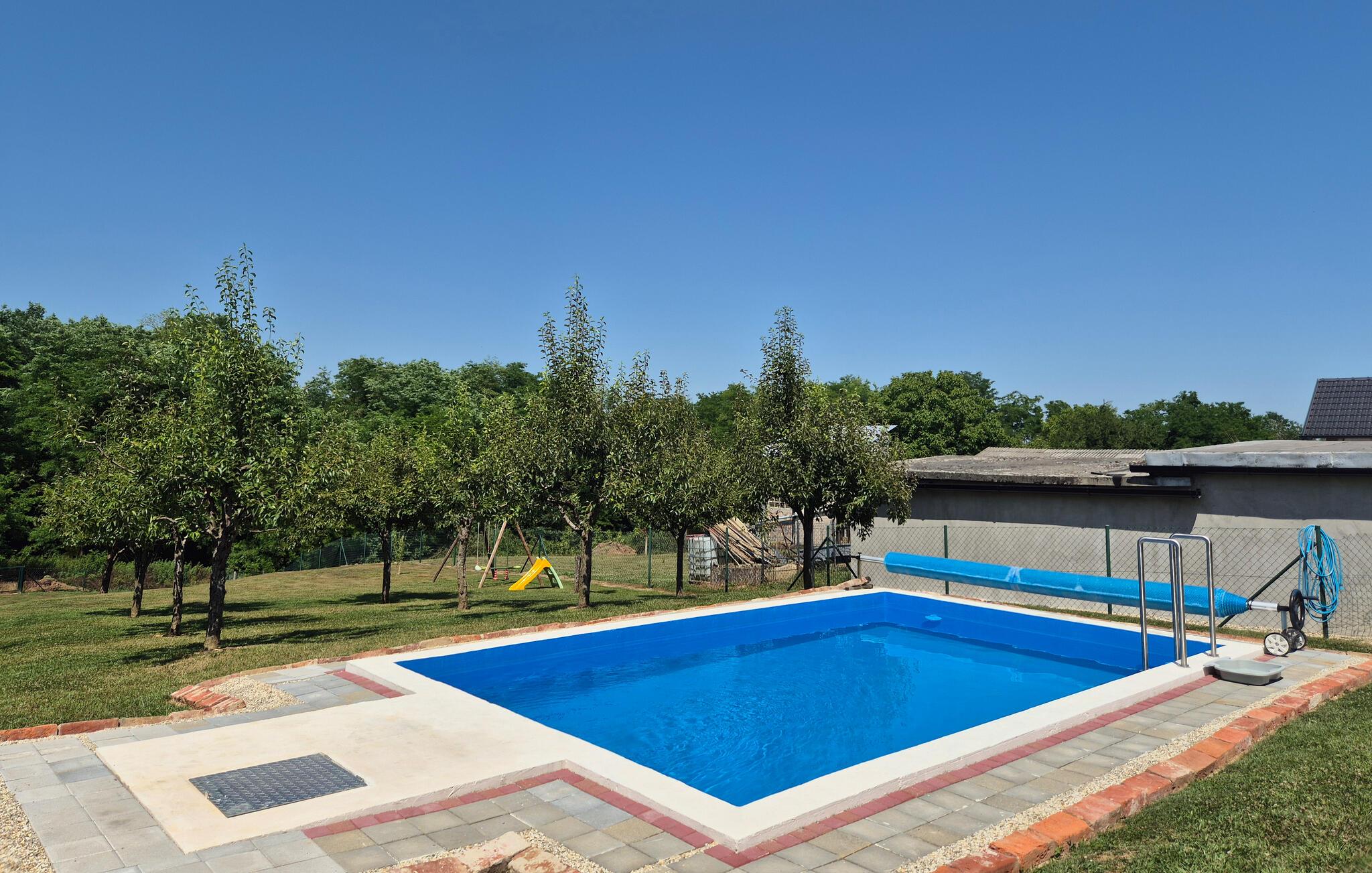 Auf dem schönen Naturgrundstück können Sie in bequemen Liegestühlen entspannen oder ein paar Runden im Pool schwimmen, während die Kinder ausgelassen schaukeln. Später versammelt sich die ganze Familie zu einem leckeren Abendessen vom Grill, lassen Sie einen herrlichen Urlaubstag unter freiem Himmel ausklingen.