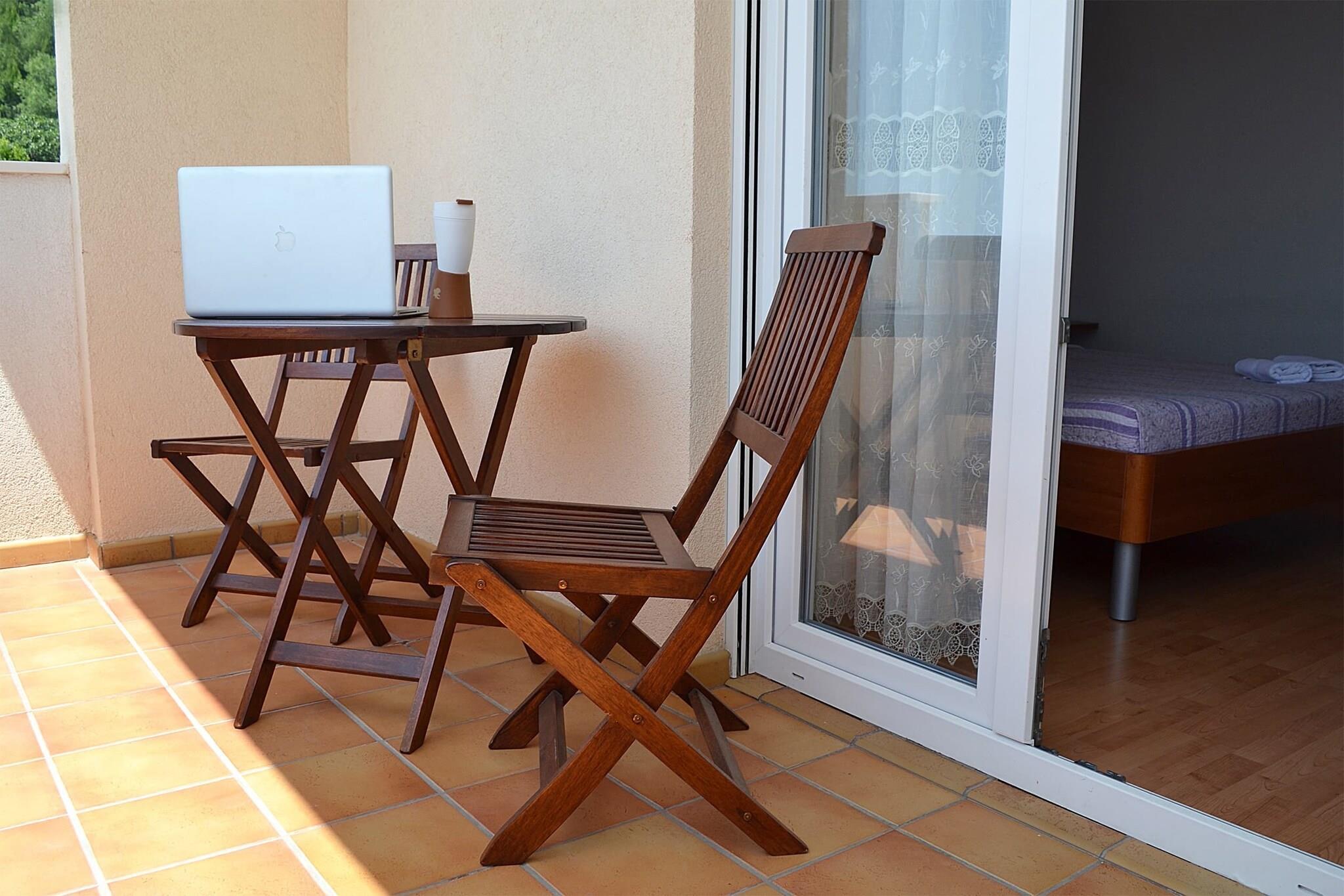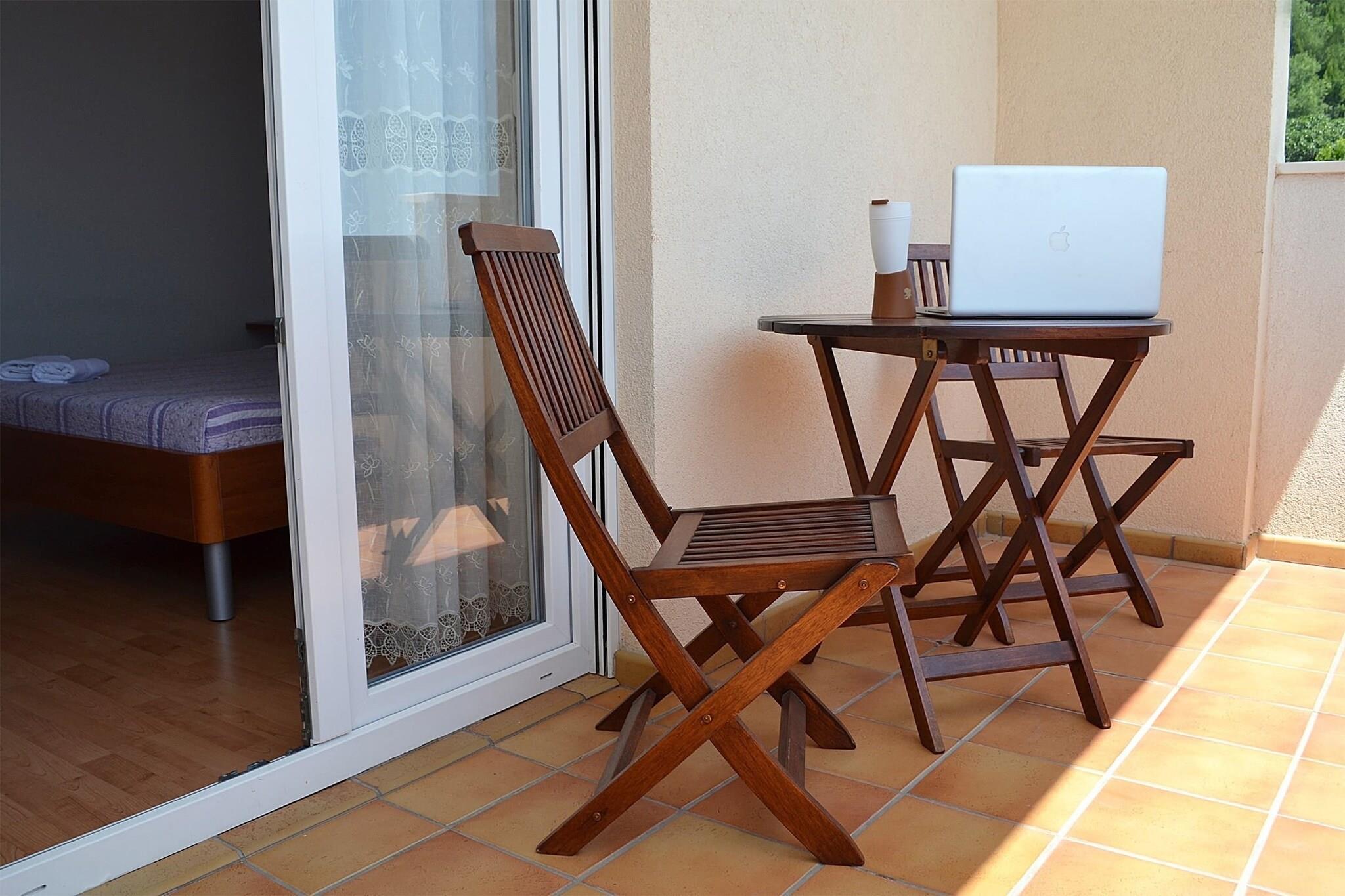 On the 2nd floor: Kitchen(dining table(4 persons), electric kettle, cooker(2 ring stoves, induction), fridge-freezer), bedroom(double bed(180 x 200 cm), TV(flatscreen, satellite), balcony, air conditioning, safety deposit box), bedroom(2x single bed(90 x 200 cm), balcony, air conditioning), bathroom(shower, washbasin, toilet), fridge, freezer(shared with other guests), washing machine(shared with other guests), garden furniture, BBQ(shared with other guests), parking, swimming pool(shared with other guests, heated, 9 x 4 m.)