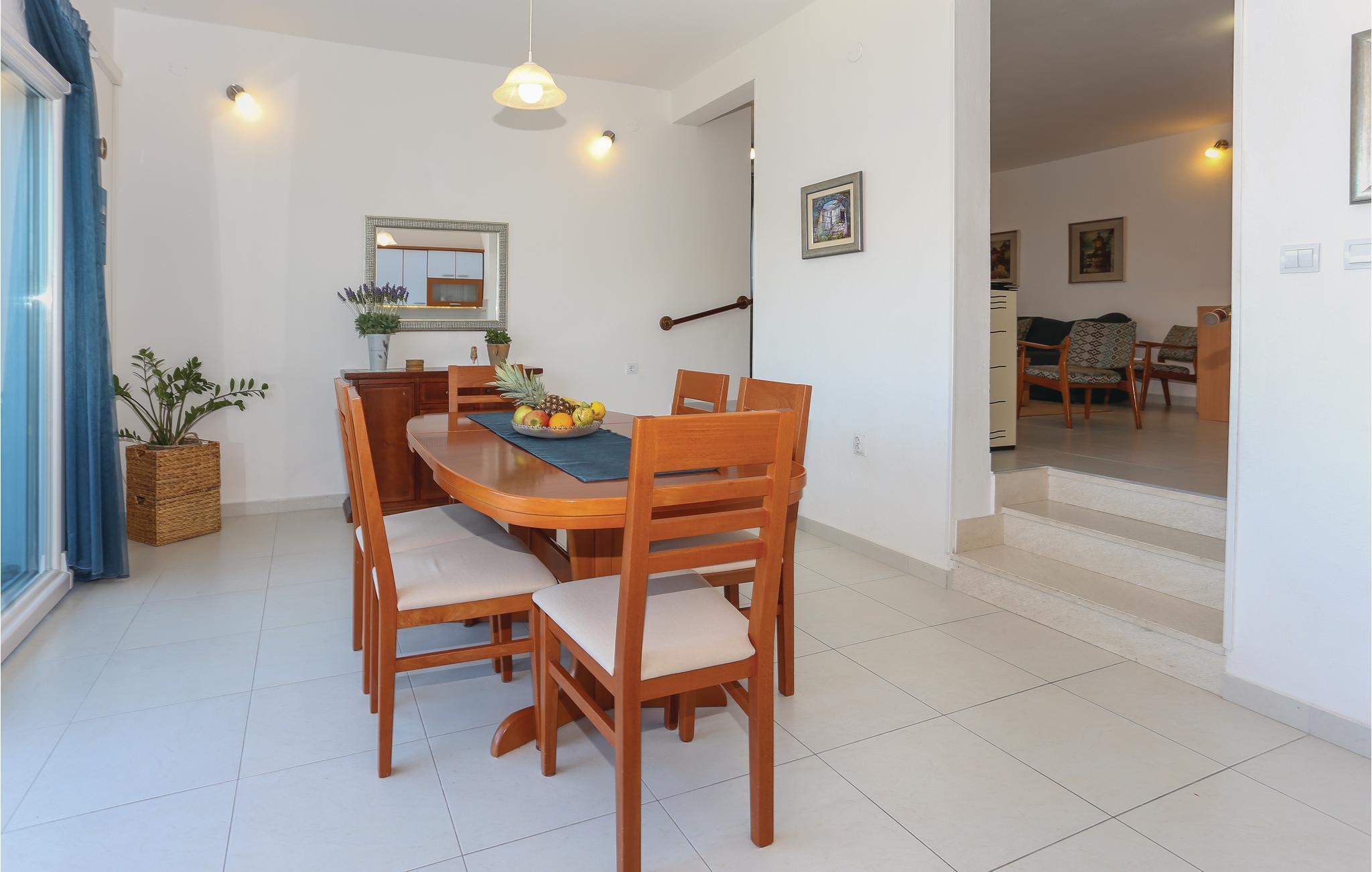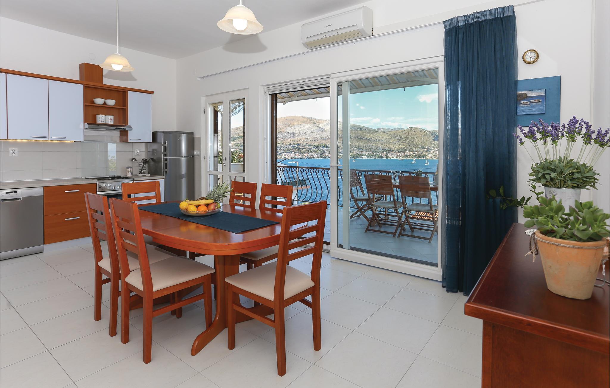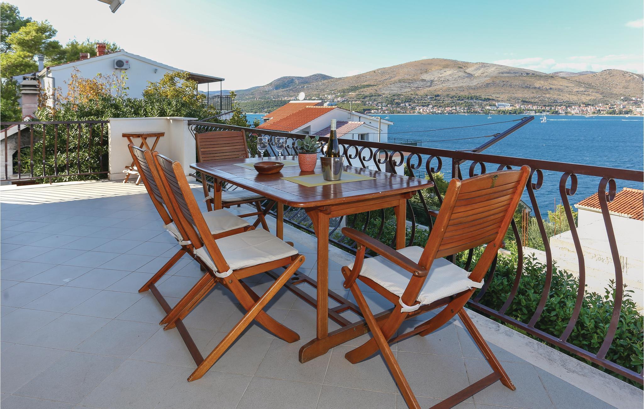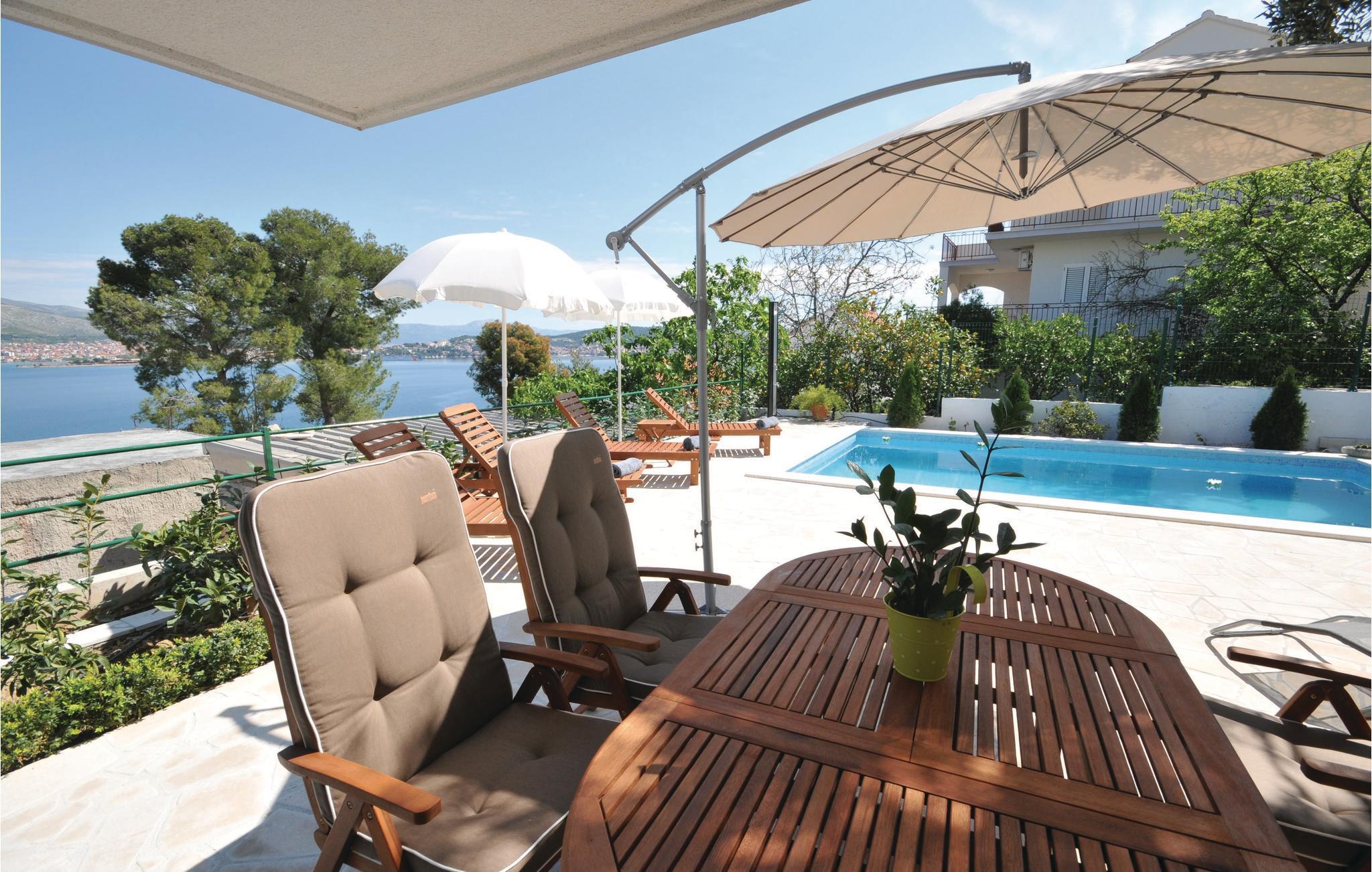 Dieses praktische Ferienhaus befindet sich in einem kleinen Küstenort und ist ideal für den Urlaub befreundeter Familien geeignet, da die drei Wohneinheiten auf drei Etagen verteilt sind. Jede Etage ist eine Wohnung für sich und hat auch einen eigenen Außeneingang. So können Sie viel gemeinsame Zeit verbringen, doch genießen auch Privatsphäre als Familie. Das Haus hat schöne Terrassen, die Blick auf das Meer und schöne Berge bieten. Erfrischung können Sie im Pool vor dem Haus oder im 100 m entferntem Meer finden, wohin Sie ein steiler Fußweg und 100 Stufen führen. Zum UNESCO Weltkulturerbe Trogir sind es ca. 8 km. Dort finden Sie Unterhaltung für Groß und Klein.