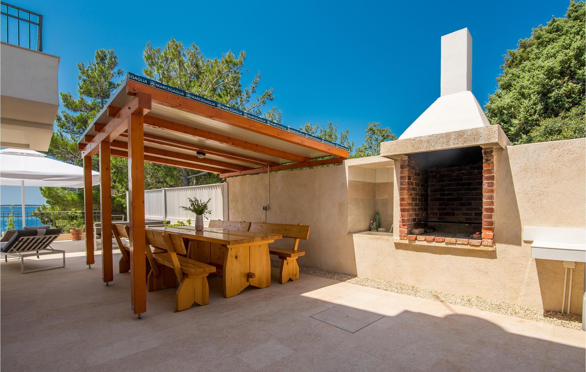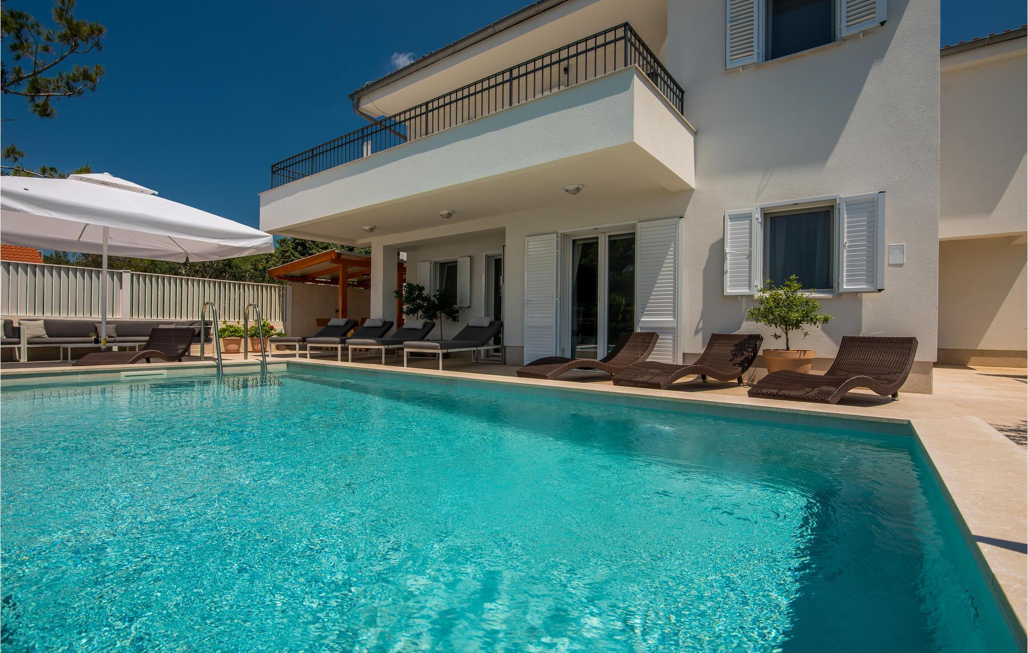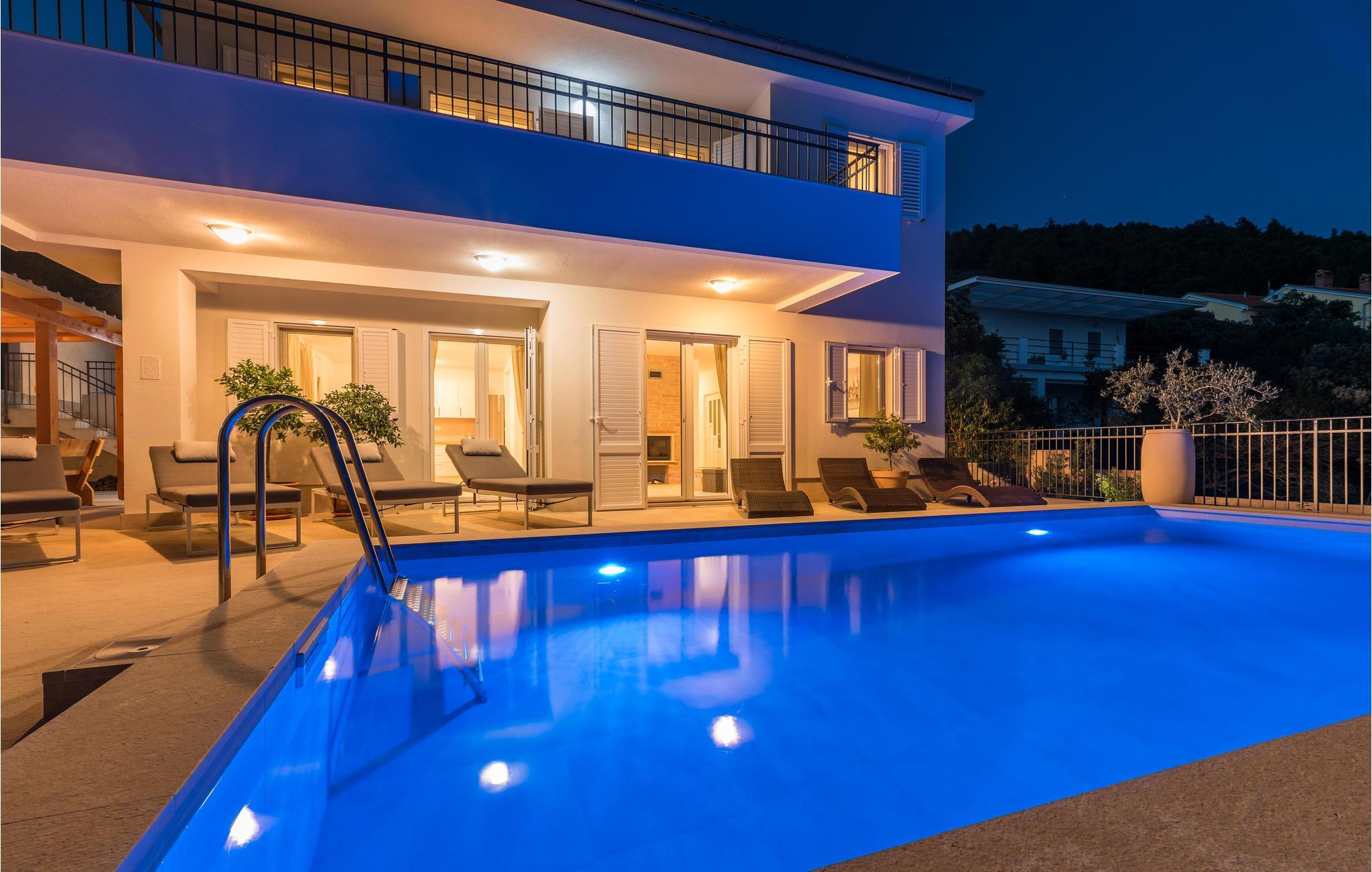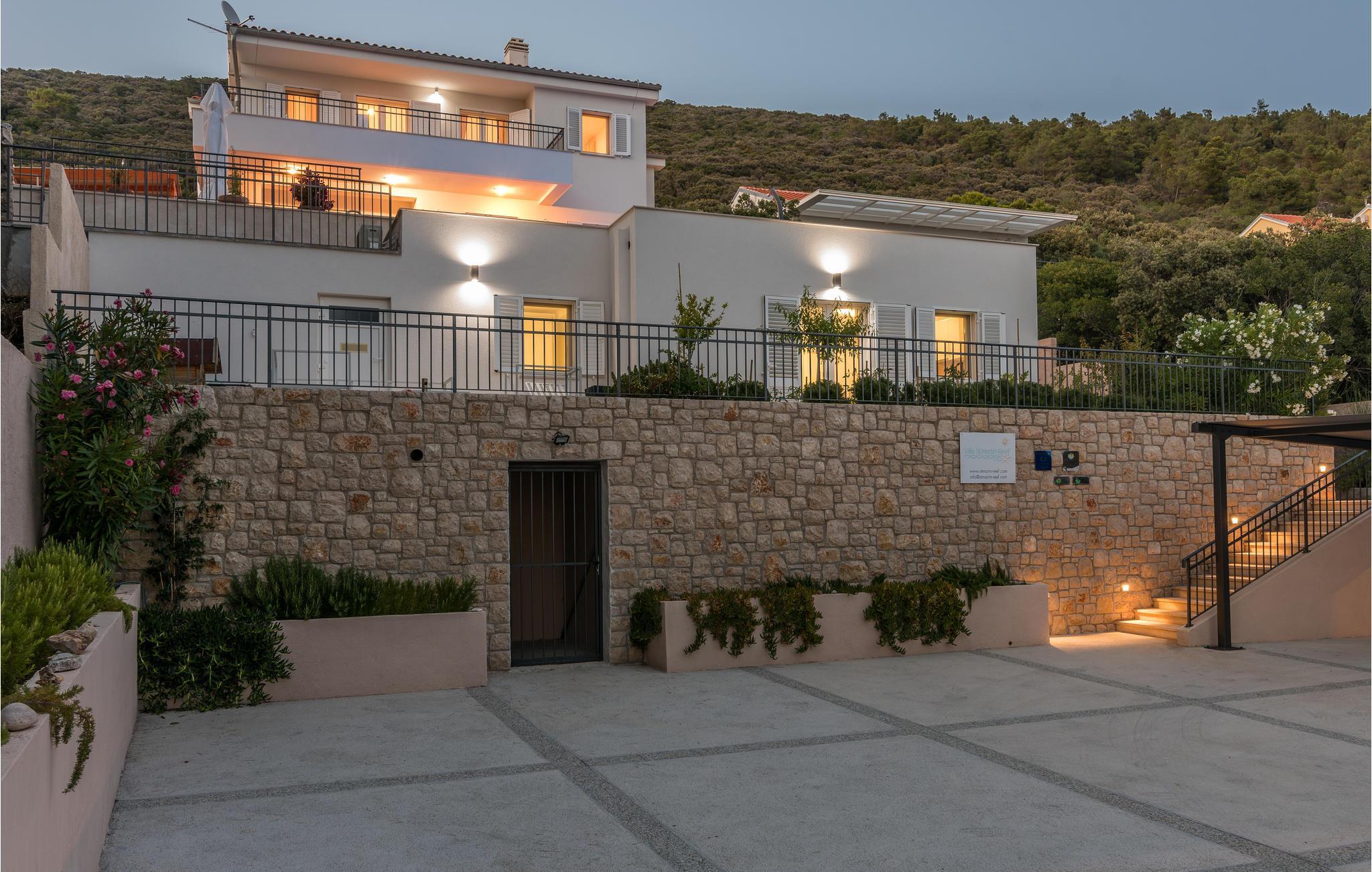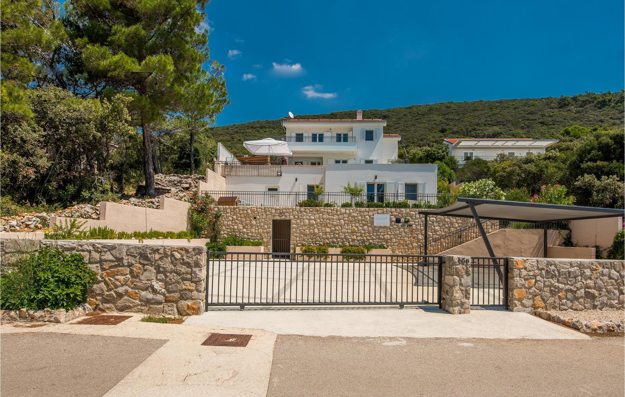Das Erdgeschoss verfügt über einen offenes Wohnzimmer mit Küche und Essbereich und im Obergeschoss sind 4 Schlafzimmer mit en-suite Bädern. Vom Wohnzimmer haben Sie direkten Zugang auf die wunderschöne Terrasse mit Pool, Liegestühlen, Loungebereich und überdachter Terrasse mit Grill, die zum Speisen im Freien einlädt. Hinter dem Haus erwartet Aktivurlauber ein Outdoor-Fitnessbereich. Auf dem unteren Teil des Grundstück befindet sich ein Haus, in dem die Eigentümer wohnen. Entdecken Sie die Insel Cres und genießen dessen Vorzüge, die wunderschönen Strände, gutes Essen, Bootsfahrten sowie Rad- und Wandertouren.