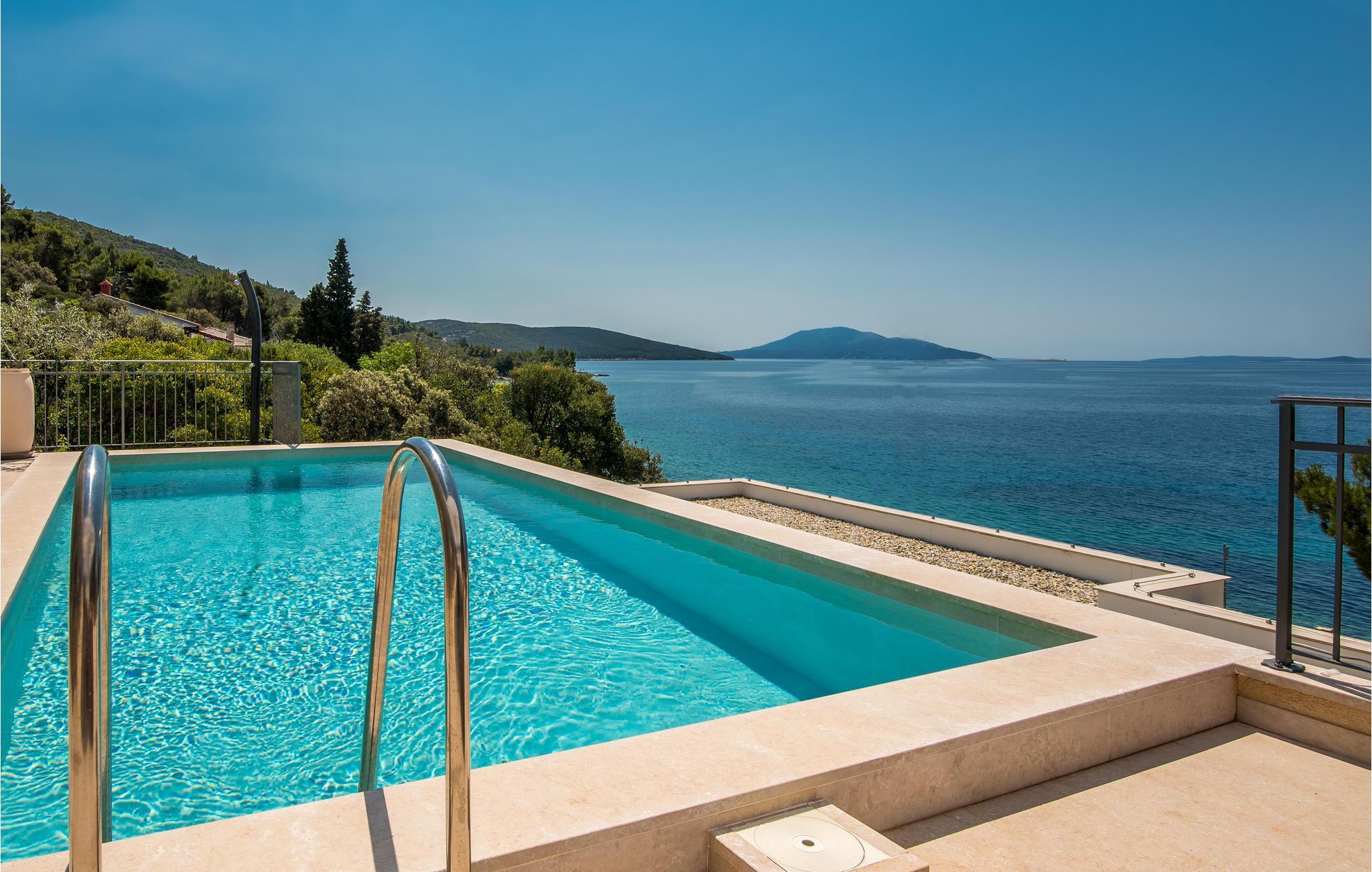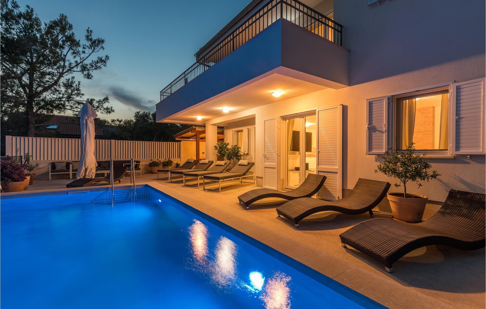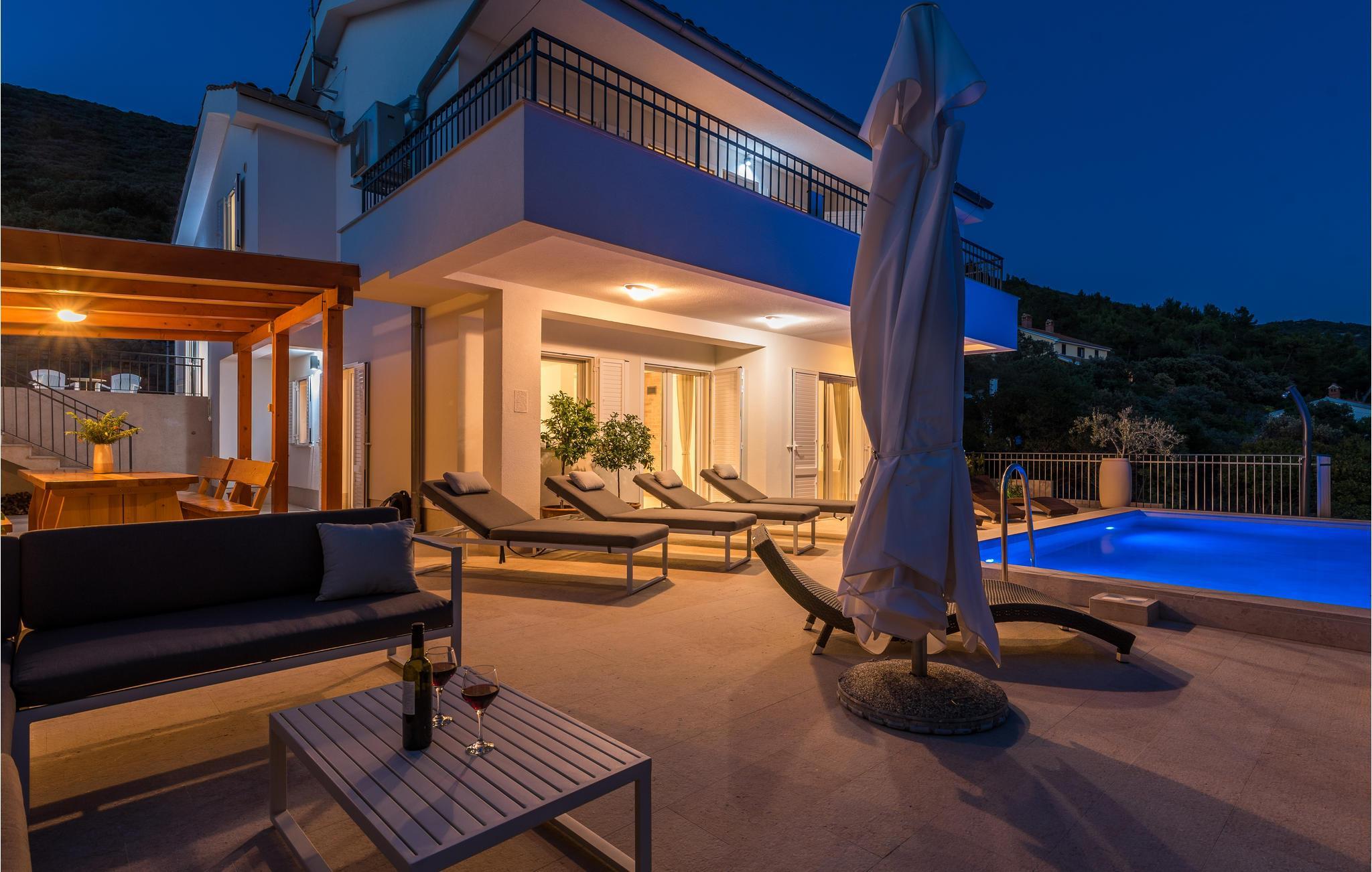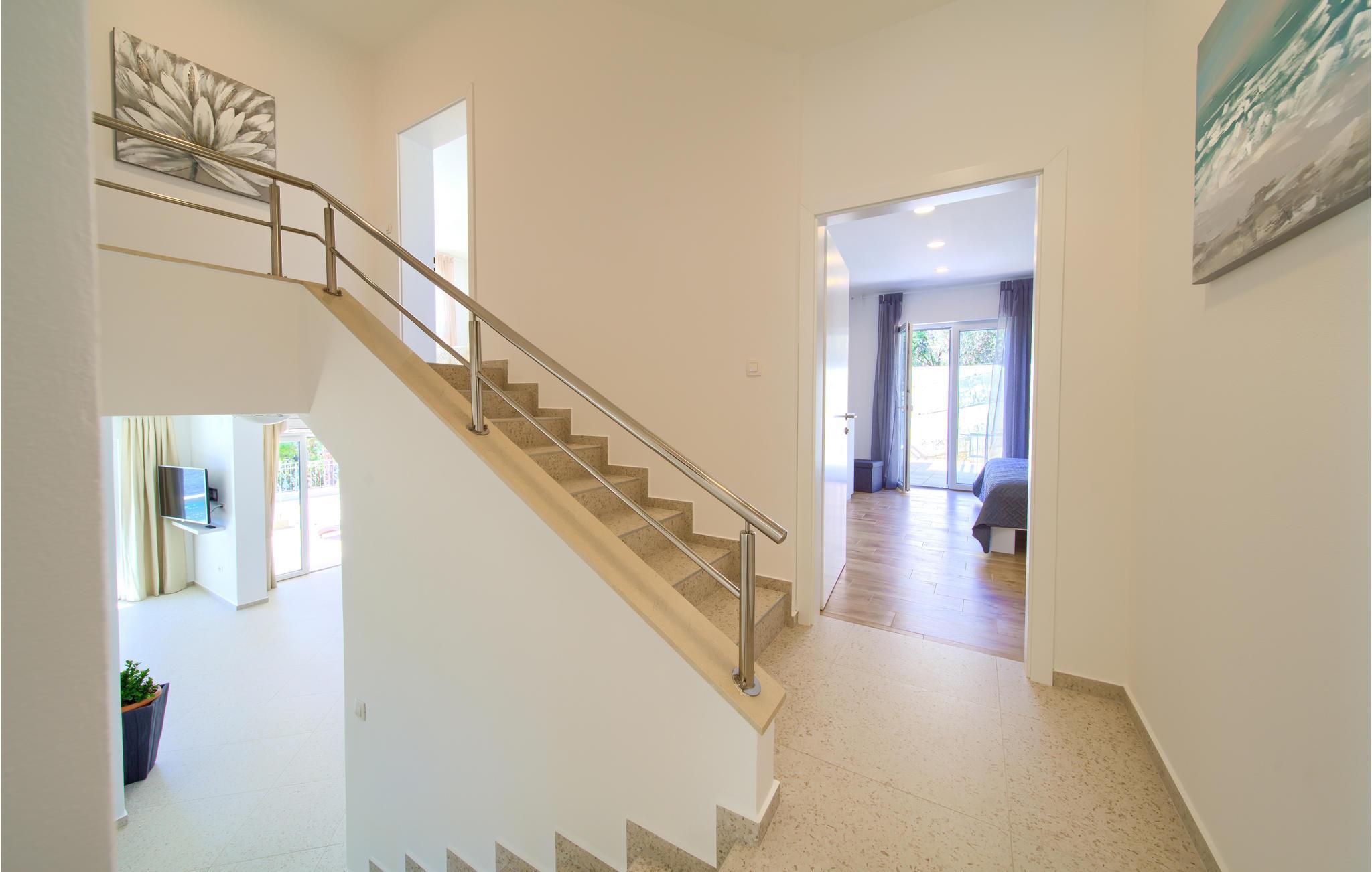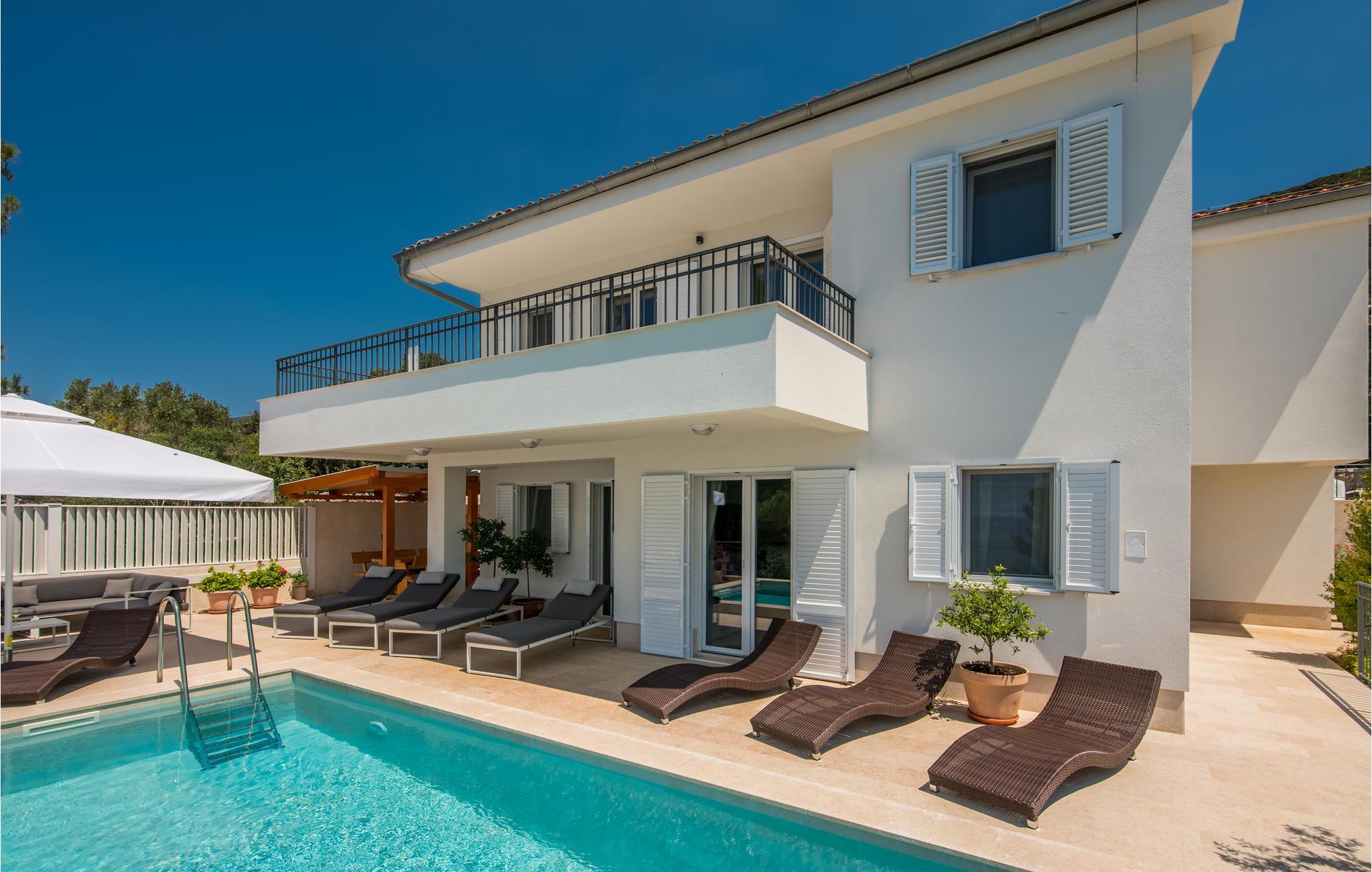 Das Erdgeschoss verfügt über einen offenes Wohnzimmer mit Küche und Essbereich und im Obergeschoss sind 4 Schlafzimmer mit en-suite Bädern. Vom Wohnzimmer haben Sie direkten Zugang auf die wunderschöne Terrasse mit Pool, Liegestühlen, Loungebereich und überdachter Terrasse mit Grill, die zum Speisen im Freien einlädt. Hinter dem Haus erwartet Aktivurlauber ein Outdoor-Fitnessbereich. Auf dem unteren Teil des Grundstück befindet sich ein Haus, in dem die Eigentümer wohnen. Entdecken Sie die Insel Cres und genießen dessen Vorzüge, die wunderschönen Strände, gutes Essen, Bootsfahrten sowie Rad- und Wandertouren.