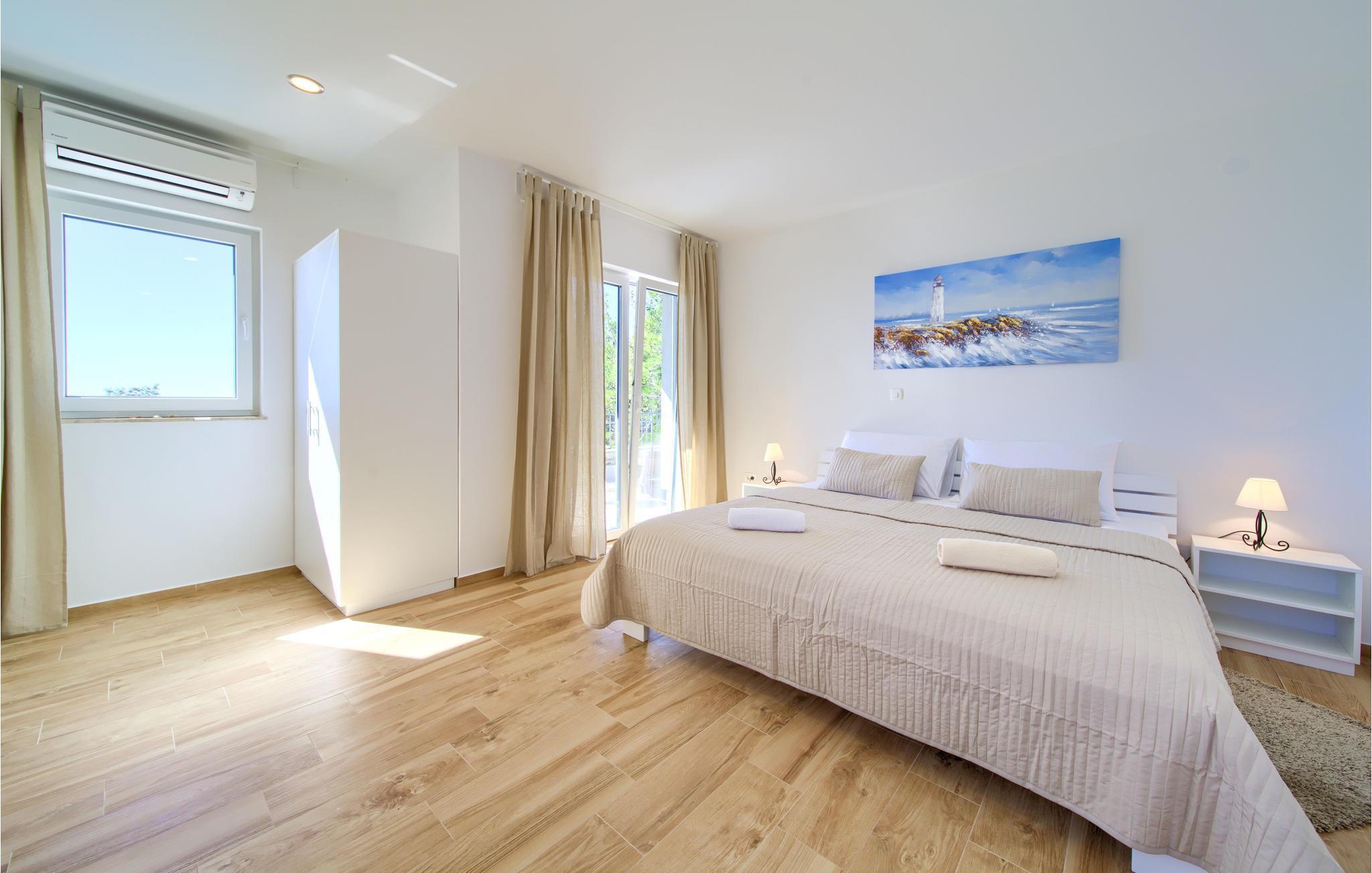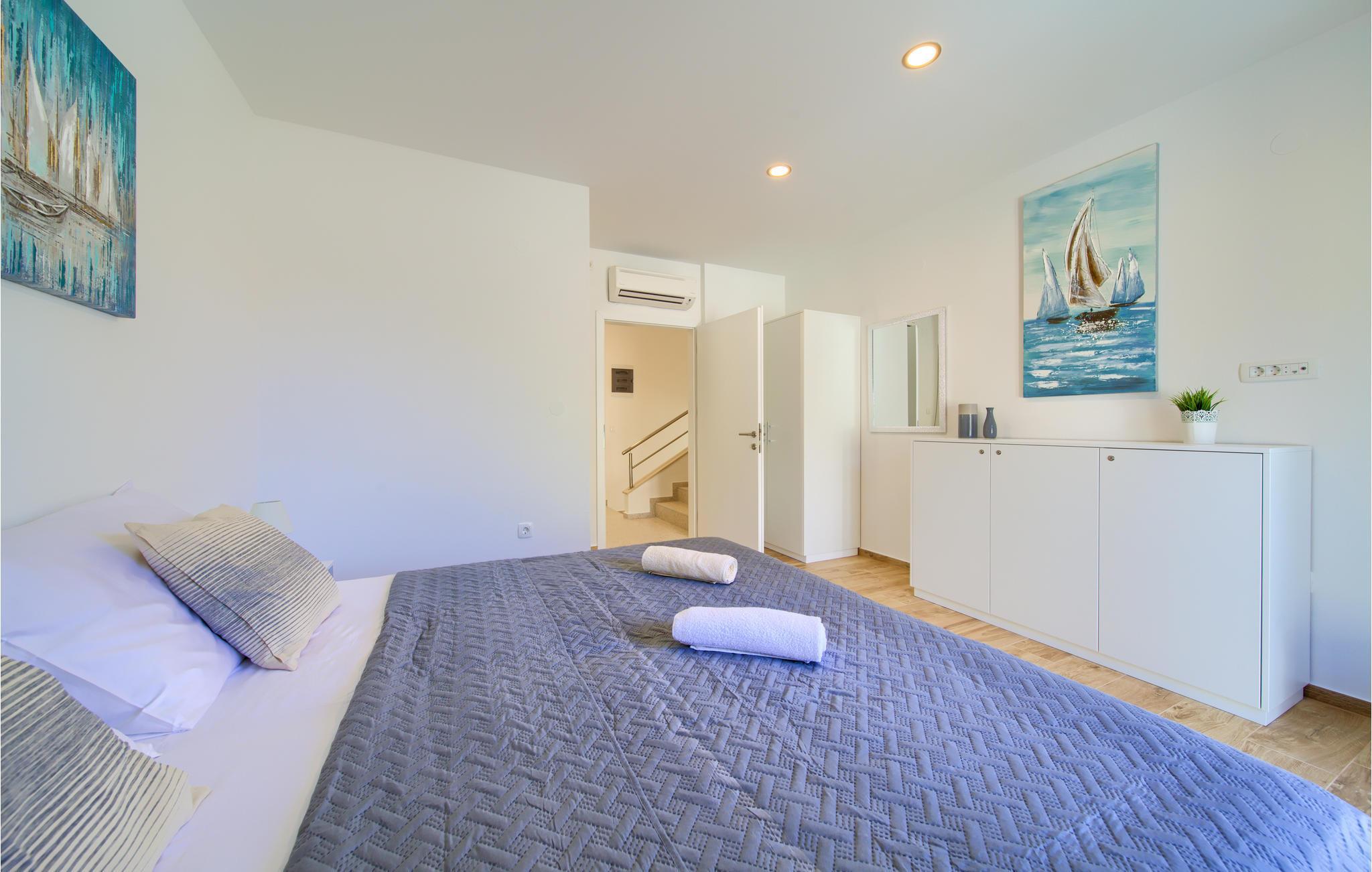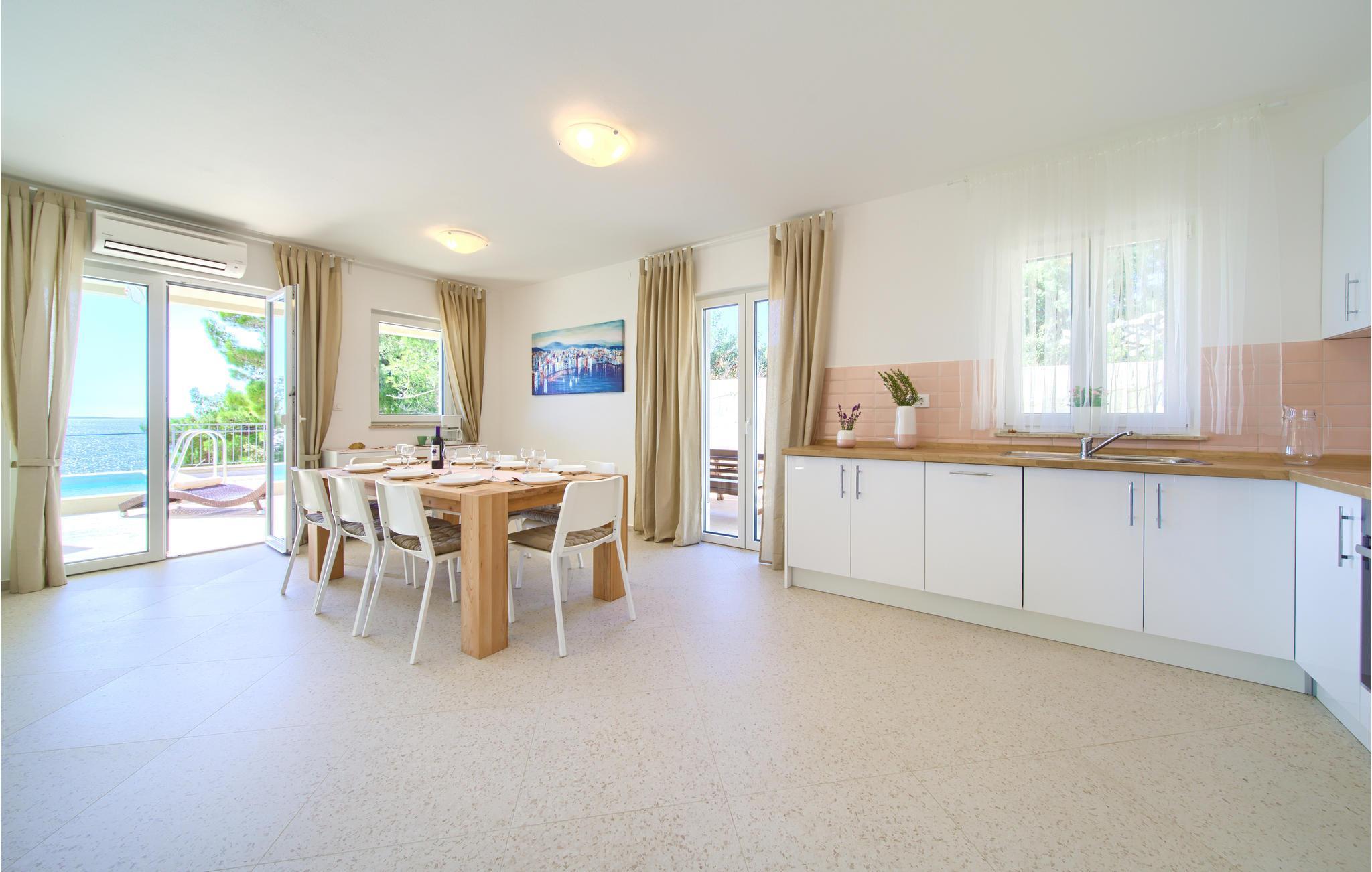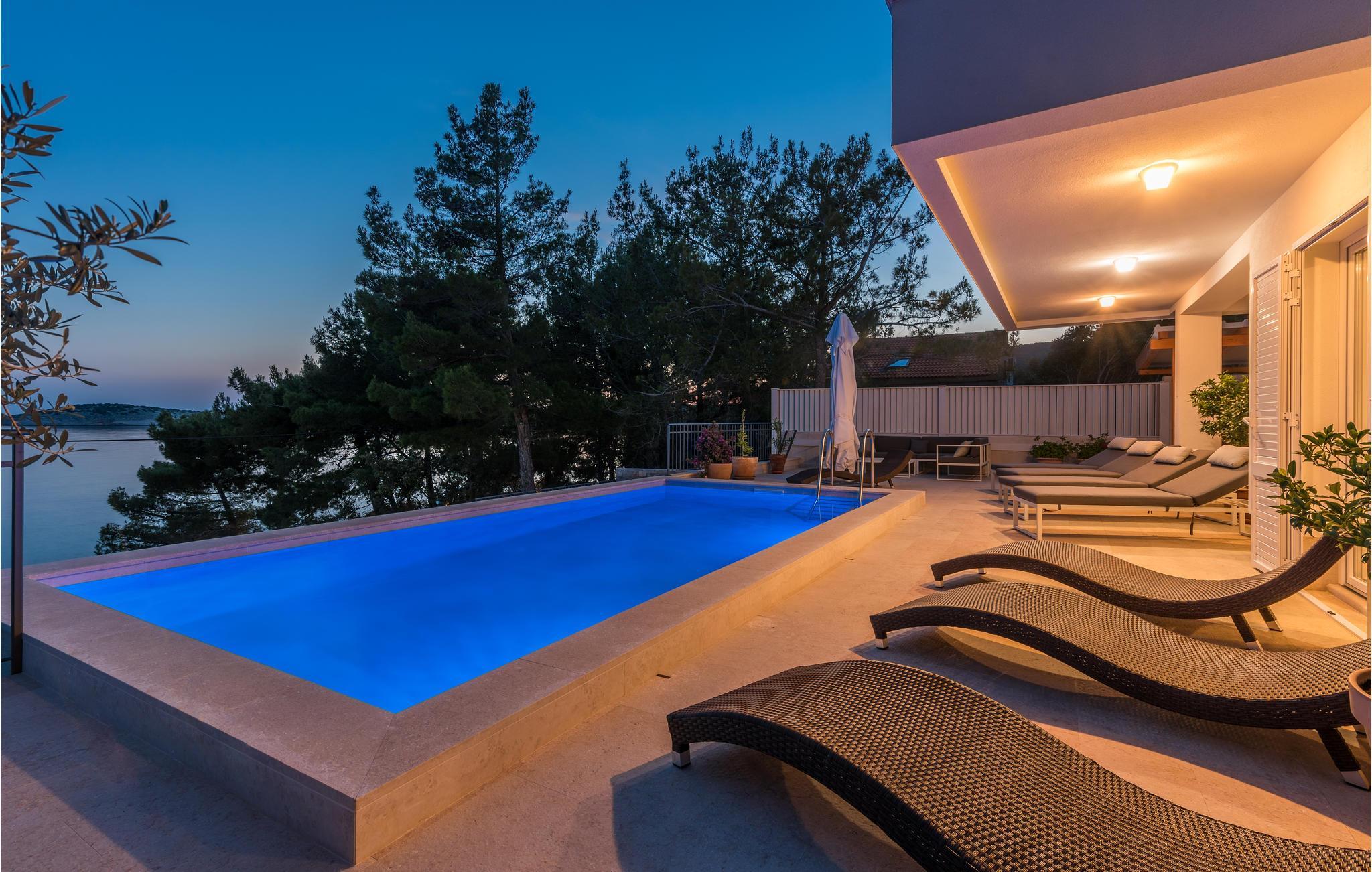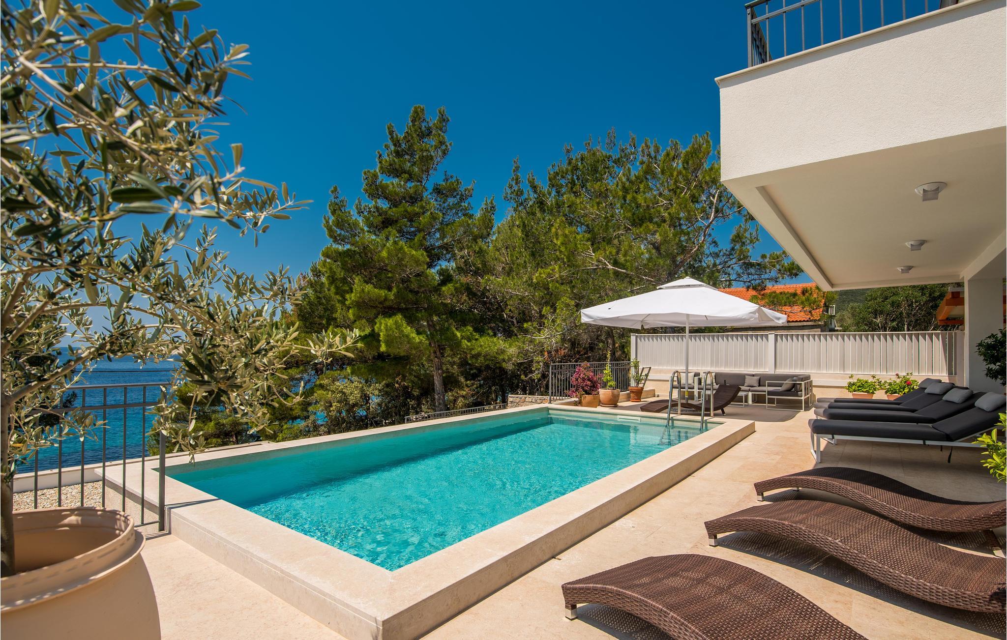 Das Erdgeschoss verfügt über einen offenes Wohnzimmer mit Küche und Essbereich und im Obergeschoss sind 4 Schlafzimmer mit en-suite Bädern. Vom Wohnzimmer haben Sie direkten Zugang auf die wunderschöne Terrasse mit Pool, Liegestühlen, Loungebereich und überdachter Terrasse mit Grill, die zum Speisen im Freien einlädt. Hinter dem Haus erwartet Aktivurlauber ein Outdoor-Fitnessbereich. Auf dem unteren Teil des Grundstück befindet sich ein Haus, in dem die Eigentümer wohnen. Entdecken Sie die Insel Cres und genießen dessen Vorzüge, die wunderschönen Strände, gutes Essen, Bootsfahrten sowie Rad- und Wandertouren.