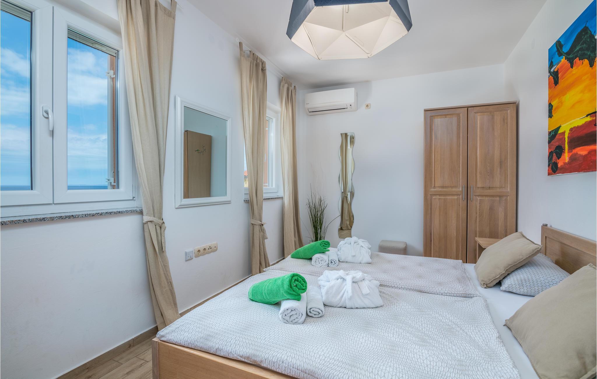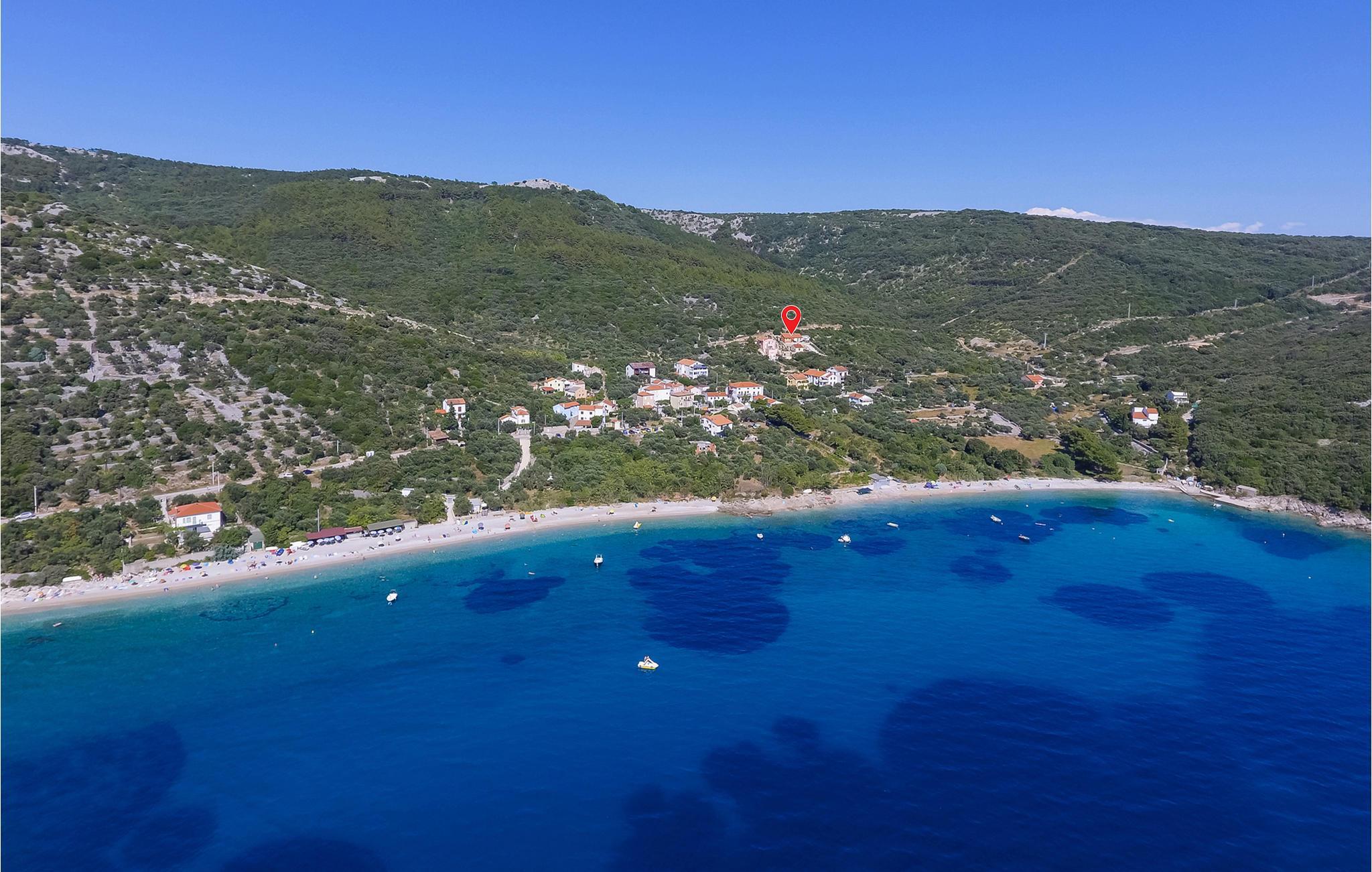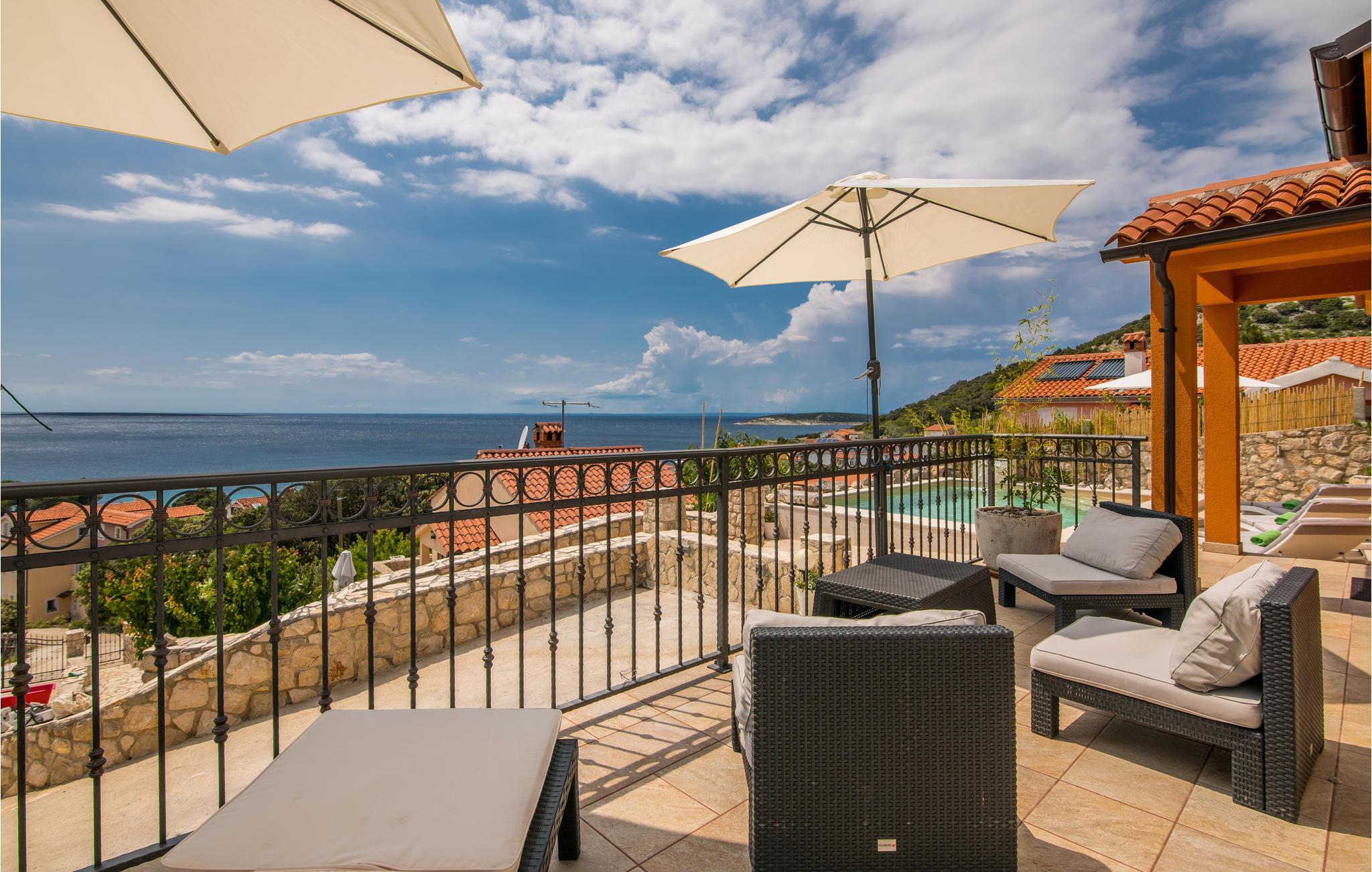 Auf der Insel Cres, in dem kleinen ruhigen Küstenort Miholascica, befindet sich dieses komfortable Ferienhaus mit Pool. Das geräumige Haus erstreckt sich über zwei Etagen und verfügt im Dachgeschoss über Dachschrägen, die auf ca. 120 cm heruntergehen. Im Erdgeschoss sind das offene Wohnzimmer mit Küche und Essbereich sowie zwei Schlafzimmer, während im Obergeschoss zwei weitere Schlafzimmer sind. Die Innenräume sind einzigartig dekoriert und strahlen einen besonderen Charme aus, der sich durch die Vermischung verschiedener Stile ergibt. Die Küche ist komplett ausgestattet und die Räume sind klimatisiert. Vom Erdgeschoss haben Sie direkten Zugang zur Terrasse und dem Sonnenbereich mit Pool und großem Whirlpool. Hier werden Sie bestimmt viele angenehme Stunden mit Meerespanorama dem Duft der umgebenden mediterranen Pflanzen verbringen. Genießen Sie die ruhige Lage. Wenn Sie in kristallklarem Meer schwimmen möchten, dann gehen Sie bergab zum schönen Strand, der zu Fuß nur wenige Minuten entfernt liegt.