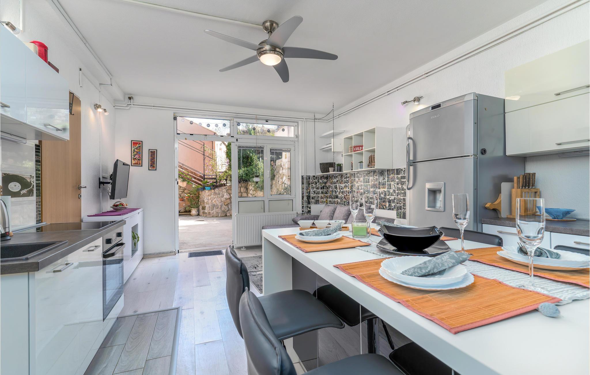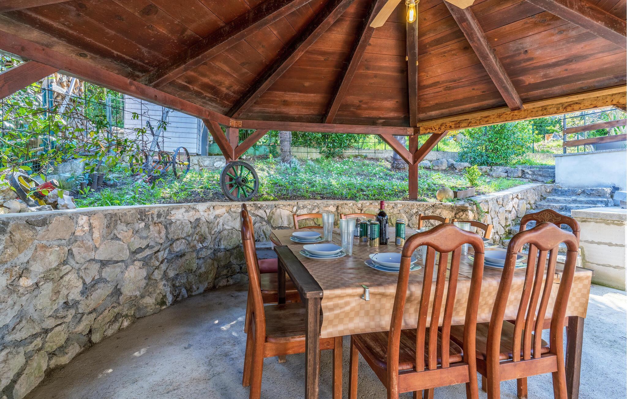 Treten Sie ein in eine taghelle einladende Ferienwohnung mit gemütlicher Möblierung und herzlichen Details. Die Bauweise und Struktur mit natürlicher Steinwand des Hauses bieten dem ganzen Wohnraum ein behagliches naturnahes Flair. Hier können Sie sich mit Ihrer Familie oder FreundInnen besonders wohlfühlen, und den Urlaub in Kroatien genießen, wobei die Seele baumeln lassen an erster Stelle steht. Im Freien stehen Ihnen eine eigene Terrasse zur Verfügung, sowie ein großer Garten mit Pavillon und Gemeinschaftsgrill, den Sie mit CKA326 teilen. Hier können Sie sich in der Sonne ins Grüne legen, Ihre Zeit in einen Roman investieren, oder Ihre Abende beim Grill ausklingen lassen.