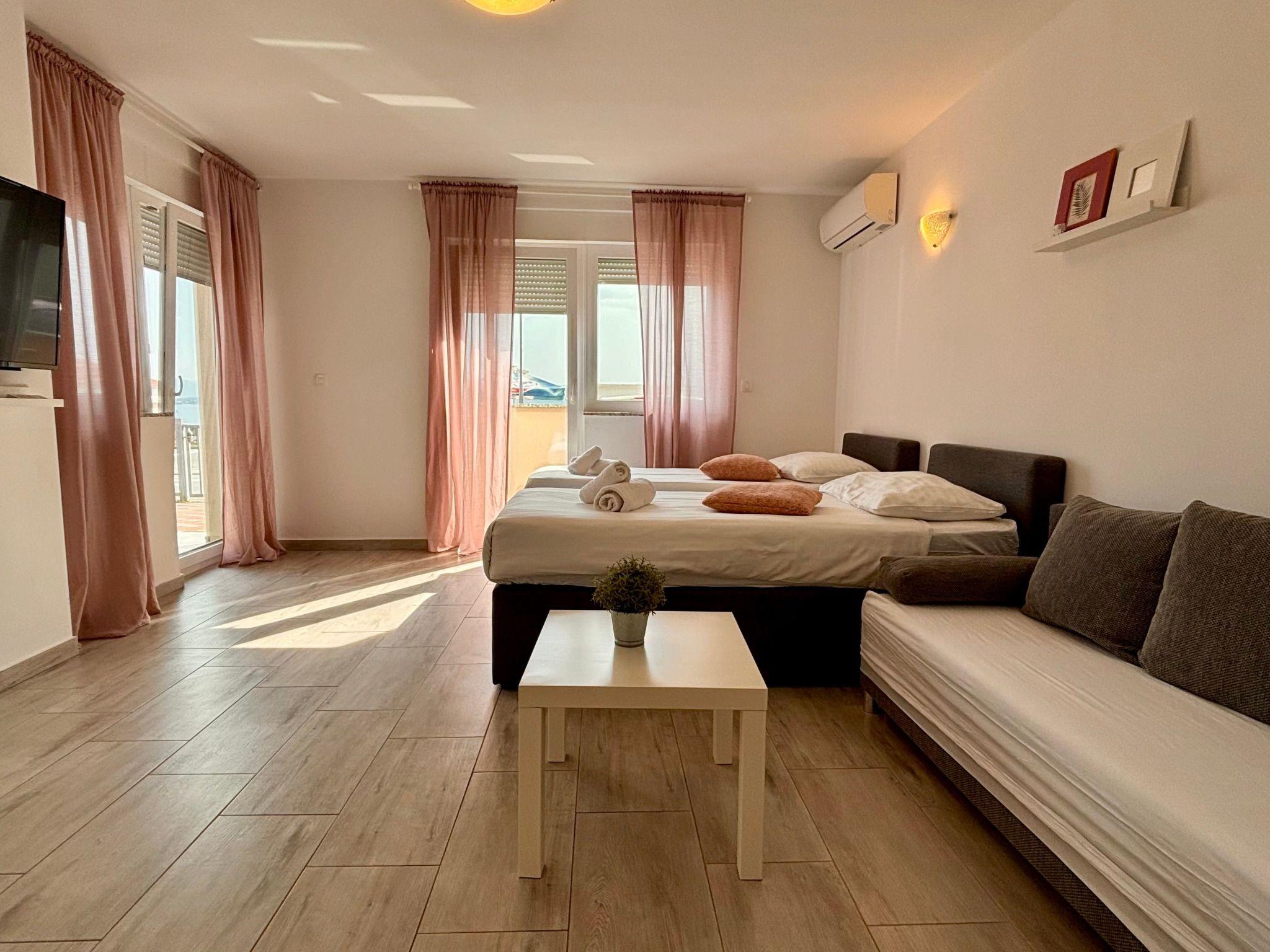 This apartment can accommodate up to 6 people and has 2 bedrooms. One bedroom is air-conditioned and has a double bed and access to the terrace. The second is the living room. There are 2 single beds and a sofa bed for up to 2 people. Access to the living room is separated from the kitchen by a sliding door.