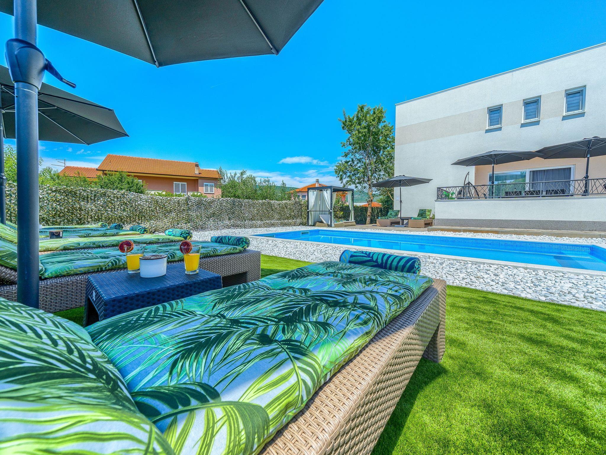 Haus bietet Platz für 10 Gäste. Die Betten sind in Schlafzimmern, die es 5 gibt, und in Wohnzimmer, innerhalb einer Gesamtfläche von 170m2, angeordnet. Die Gäste haben eine eigene Terrasse zur Verfügung, auf der sie in warmen Sommernächten genießen können. Für vollen Genuss und Entspannung gibt es einen privaten Grill für Gäste dieser Unterkunft. Während ihres Aufenthalts können sich Gäste im privaten Schwimmbad entspannen. IM PREIS INBEGRIFFEN: Kurtaxe, Endreinigung, Klimatisierung, Pool, Parkplatz, Garage, Internet, Kinderbett, Bügeleisen, Bügelbrett, Föhn. Die Verfügbarkeit zusätzlicher Dienstleistungen in Ihrem reservierten Termin und die Preise derselben (falls nicht aufgeführt) müssen im Voraus überprüft werden. Zusätzliche Dienstleistungen die in der Zahlungsaufforderung nicht aufgeführt sind werden direkt beim Vermieter bezahlt, angenommen der Gast nutzt auch diese. Ermäßigung auf den Grundpreis: Gratistag 14=13 (bei einem Aufenthalt von 14 Tagen oder mehr erhalten Sie einen Gratistag für den Aufenthalt bis 31.12.26).