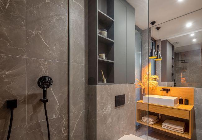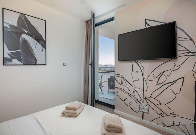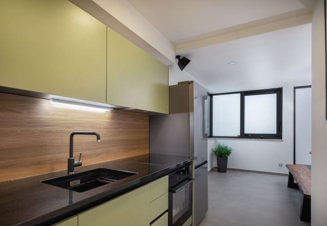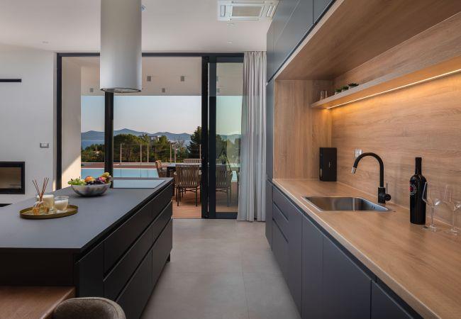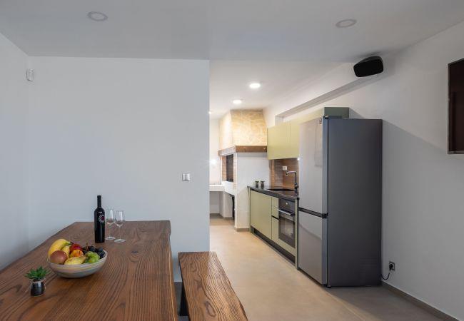 Inside, the villa features a spacious open-plan living room with cozy seating and a Smart TV, seamlessly connected to a fully equipped kitchen and a stylish dining area. On the ground floor, guests can also enjoy a traditional Dalmatian-style tavern with an indoor grill, perfect for relaxed evening gatherings. A guest toilet and laundry room are also available for added convenience.