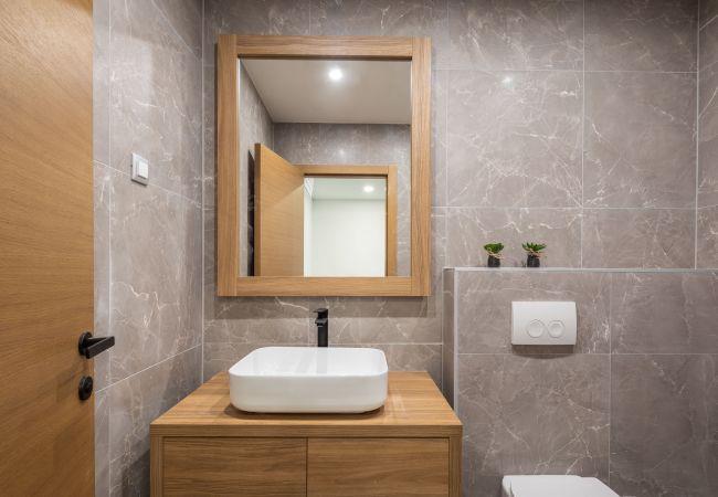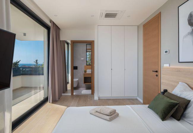 Upstairs, there are four well-appointed bedrooms, each with air conditioning and its own TV. Two of the bedrooms have en-suite bathrooms, while the other two share a large bathroom and an additional separate toilet. From the upper terrace, guests can soak in breathtaking sea views while relaxing in a private jacuzzi, especially magical at sunset. For year-round comfort, the entire villa is fitted with underfloor heating.
