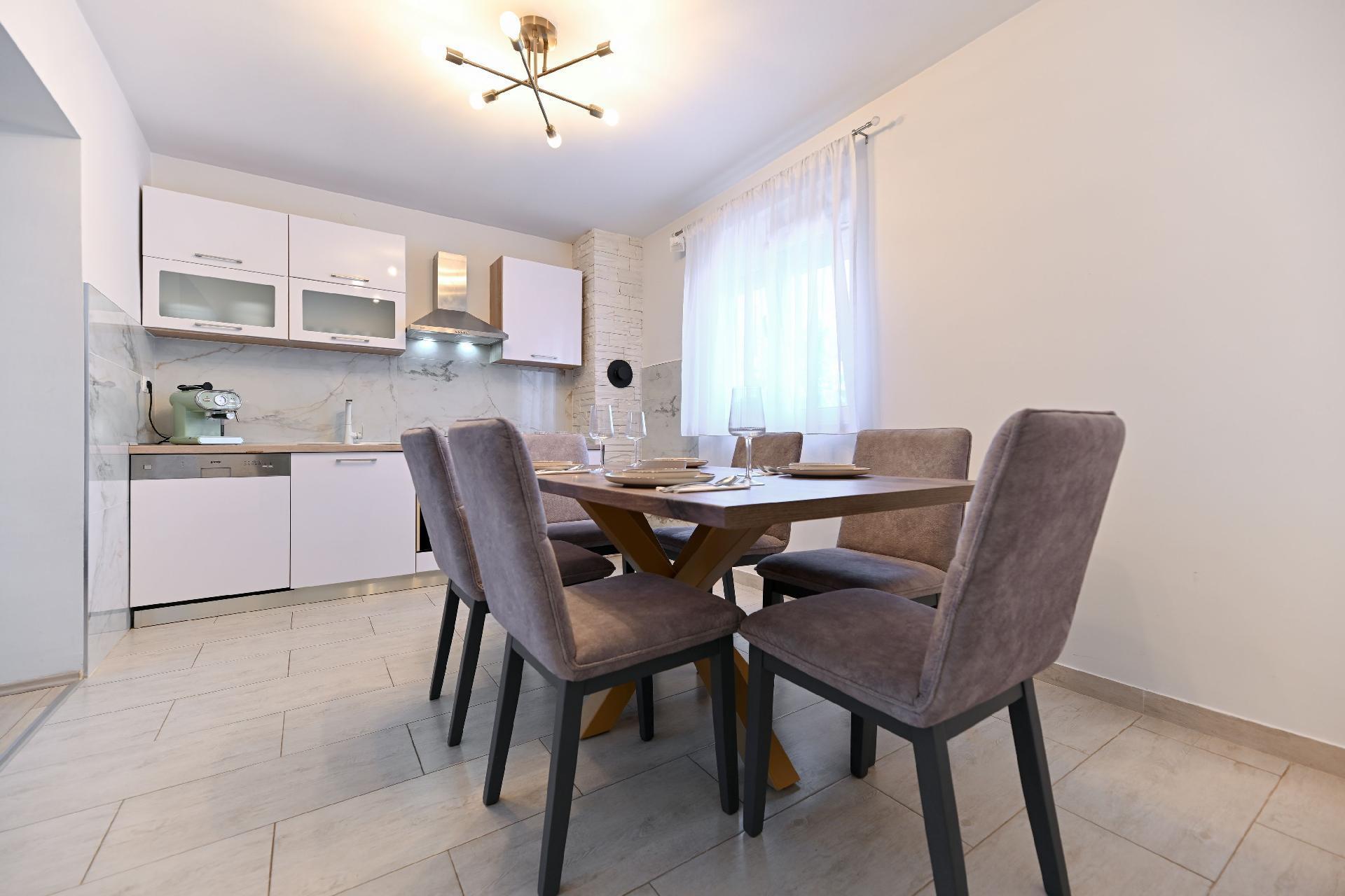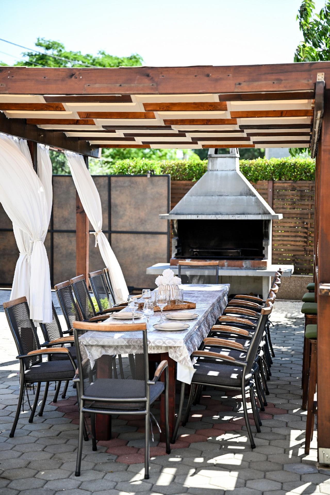This elegant, only recently in 2010 newly built holiday villa is nestled in a green 1,000 square meter plot of land in a rural setting. The nearest beaches are in Sv. Petar and Biograd. Biograd is a town rich in historical heritage and lots of restaurants. The sea and beach is only 3 km away.Fully enclosed, six-bedroom holiday villa with a private illuminated swimming pool and large terrace with a traditional stone grill