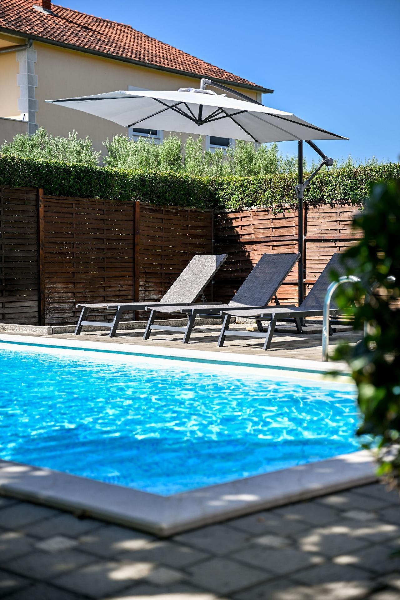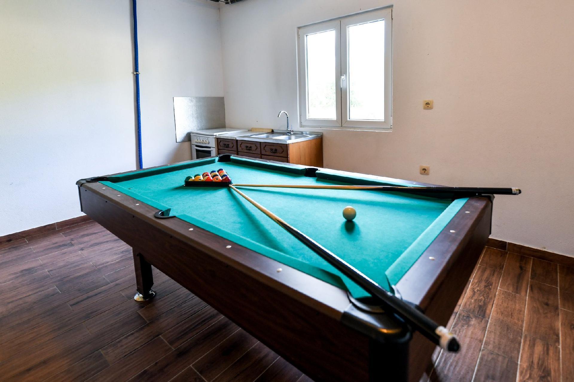 You can relax in the 25 m² pool surrounded by greenery and Dalmatian plants. There are also activities for children in the garden (children's playground with a swing) and a barbecue. There is a covered terrace where you can play table table tennis. Fitness equipment, Wifi, Pilates ball and table football table are available in the vacation home. The pool is open from May to the end of September,