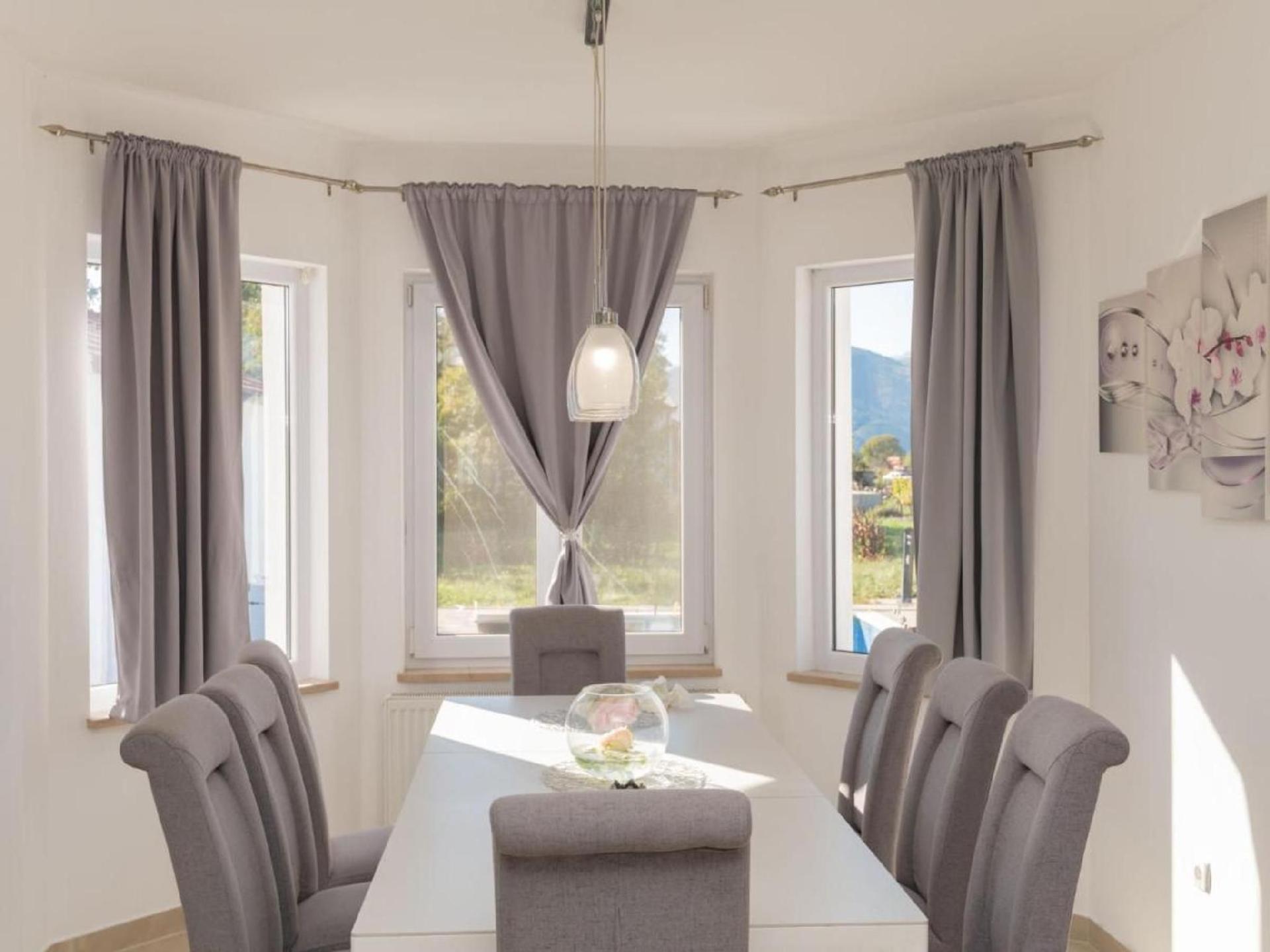 The holiday home Ana has 5 bedrooms, 3 bathrooms and a guest toilet , a spacious kitchen and living room and is ideal for larger groups or families as it can comfortably accommodate 10 people. Two bathrooms and a toilet are in the main house. Next to the house is separate dining room with barbecue, kitchenette and an additional bathroom with shower. The house has a 32 m2 outdoor swimming pool with sun loungers and plenty of space for outdoor fun and recreation. Outside there is a spacious terrace, a barbecue house with dining area, a children's playground and an outdoor shower.
