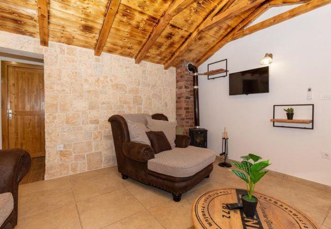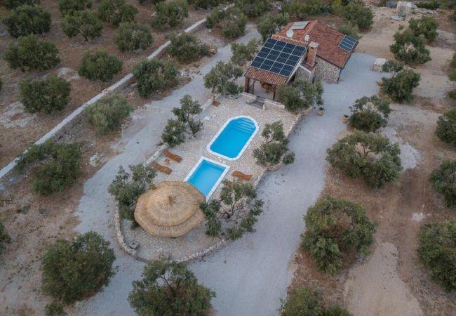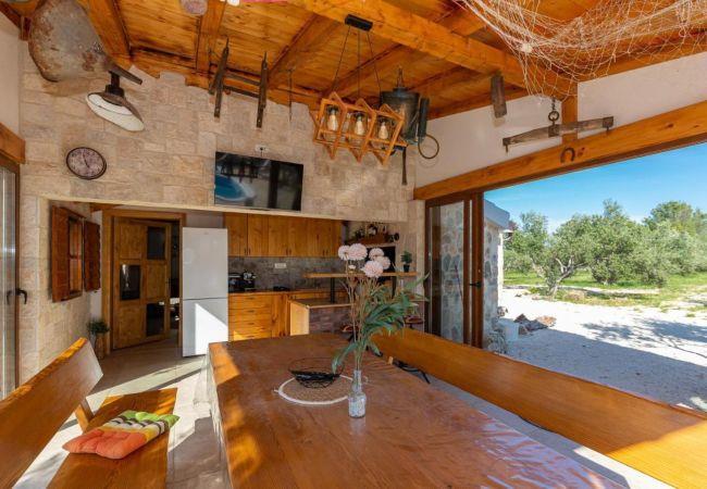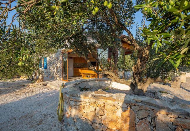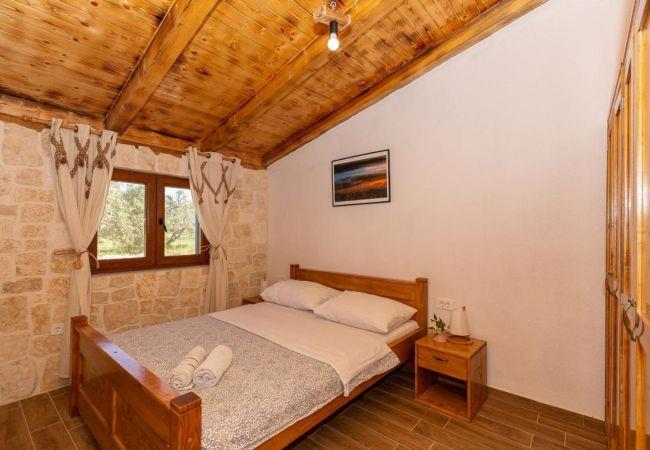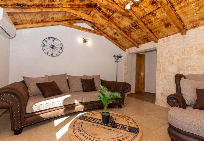 This renovated charming stone Villa is a one-story house in the middle of an olive plantation, containing a living room, dining room and kitchen, as well as two bedrooms. One bedroom has a double bed, and the other has two single beds. Guests have a bathroom with a shower at their disposal. The kitchen and dining room are in a glass enclosed part of the house, allowing you to experience the surroundings even when inside. The living and sleeping quarters are decorated in a way that honors the heritage of the house, filled with rustic stone and wooden elements, creating a warm environment.