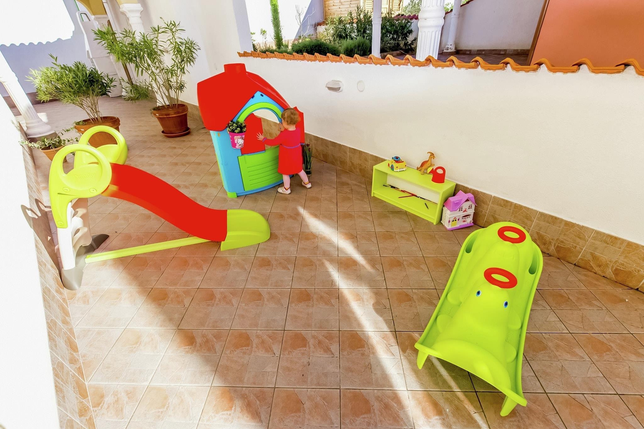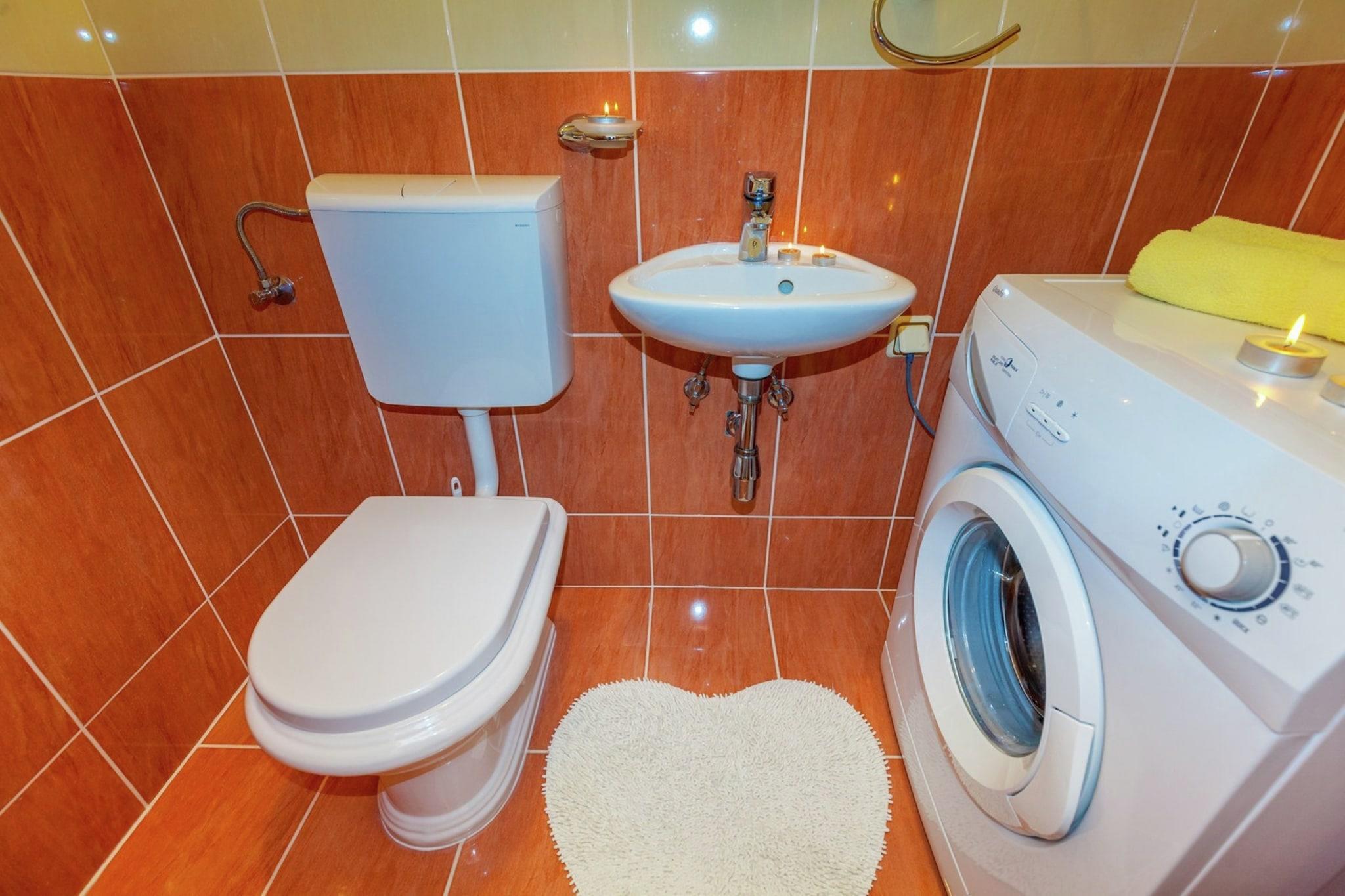 Ground floor: (open kitchen(dining table, electric kettle, cooker, coffee machine, oven, microwave, fridge-freezer), Living/bed room(single sofa bed, double sofa bed, TV, air conditioning), bedroom(double bed), bedroom(double bed or 2 single beds), bathroom(shower, toilet, washing machine, hairdryer), toilet(washbasin, toilet), roof terrace) Bubble bath, parking, swimming pool(shared with other guests)
