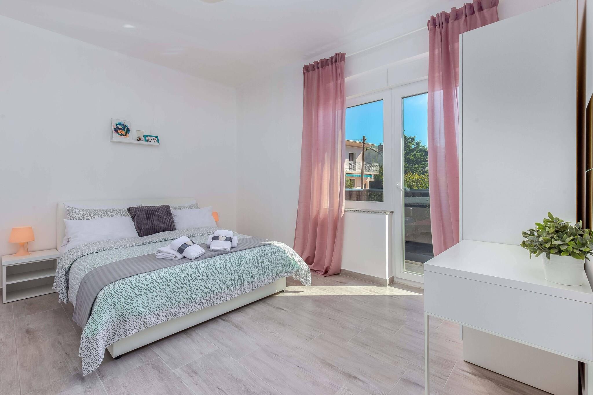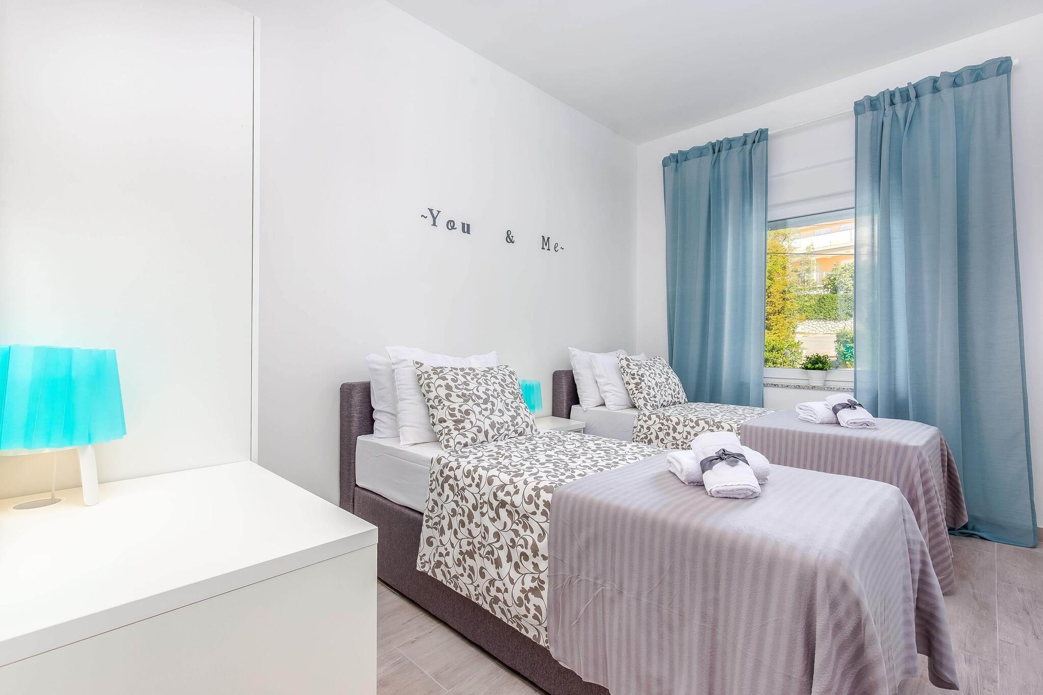 Mezzanine: (Living room(double sofa bed, TV(flatscreen, satellite), dining table), Kitchen(electric kettle, toaster, cooker, coffee machine, microwave, dishwasher, fridge-freezer), bedroom(double bed), bedroom(double bed), bedroom(single bed, single bed, TV(flatscreen, satellite)), bathroom(shower, washbasin, toilet), bathroom(shower, washbasin, toilet, washing machine), toilet(washbasin), balcony) Bubble bath, air conditioning, courtyard(fenced), BBQ(on request, electric), parking, swimming pool(shared with other guests)