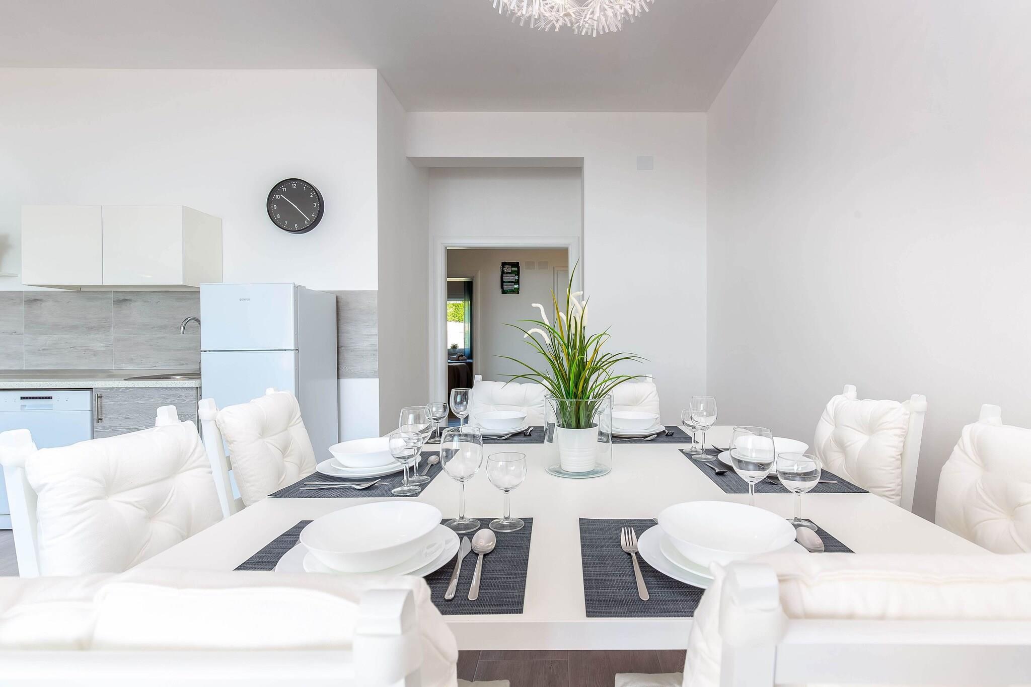 On the 1st floor: (Living room(double sofa bed, TV(flatscreen, satellite), dining table), Kitchen(electric kettle, toaster, cooker, coffee machine, microwave, dishwasher, fridge-freezer), bedroom(double bed), bedroom(double bed), bedroom(single bed, single bed, TV(flatscreen, satellite)), bathroom(shower, washbasin, toilet, washing machine), bathroom(shower, washbasin, toilet), toilet(washbasin), balcony) Bubble bath, air conditioning, courtyard(fenced), BBQ(on request, electric), parking, swimming pool(shared with other guests)