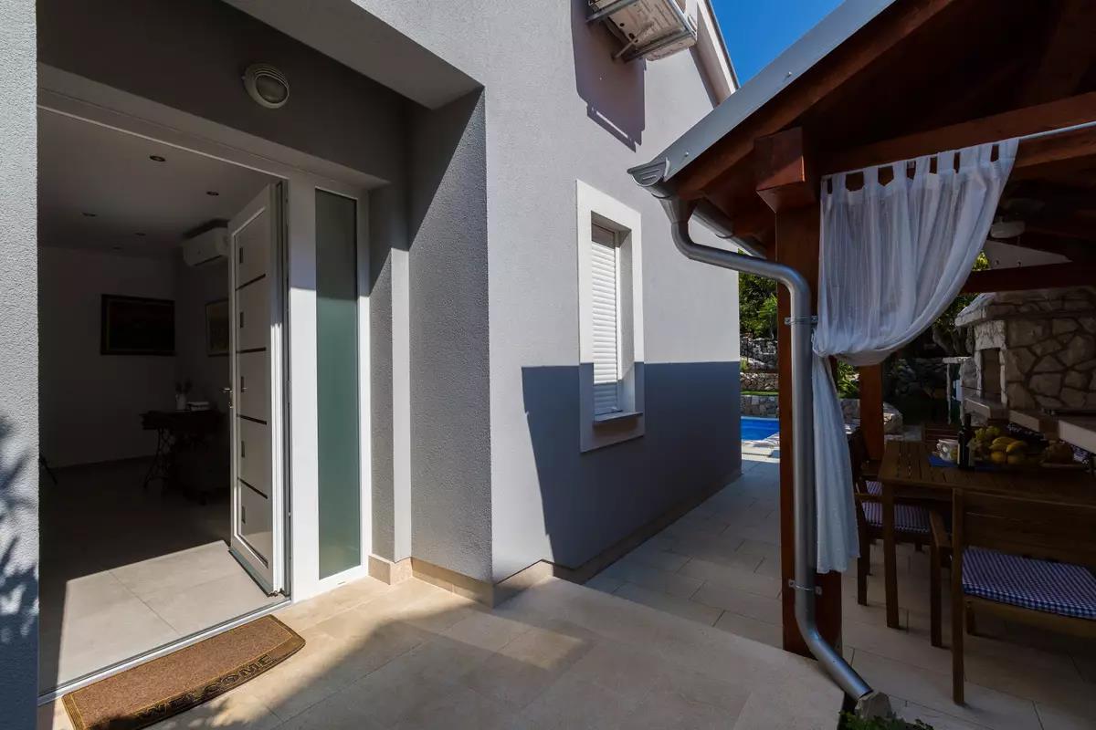 Newly renovated family house with a very well-kept property. The house is located in Dramalj, the suburb of Crikvenica, in a quiet environment.The house consists of the ground floor, the 1st floor and the beautiful outdoor area.Ground floorOn the ground floor of the house is the laundry room, where you can also find board games, which are great for evening gatherings.First floorThe upper floor consists of 1 living / dining room with kitchen, 1 balcony, 3 bedrooms with private bathroom and a separate toilet. The upper floor has a direct access to the pool area.Outdoor areaThe well-kept outdoor area consists of a terrace with barbecue, a garden, the pool area and the beautiful swimming pool itself, which is even heated. The swimming pool heating allows a pleasant use of the pool even in spring and autumn!Living area:Living / dining room and kitchen are in one room, balcony, sea view, tiles, satellite TVKitchen description:Kitchen, dishes, kitchen towels, electric stove, cooking rings: 4, oven, refrigerator with freezer, filter coffee machine, kettle, microwave, toaster, dishwasherBedroom:Double room with double bed, sea view, tilesDouble room with double bed, tilesDouble room with separate beds, tilesBathroom:Bathroom with toilet, showerBathroom with toilet, showerBathroom with toilet, showerBalcony / terrace:Private balcony, partly covered, sea view, chairs, loungers, balcony size: 15 m², own terrace, chairs, loungers, parasol, terrace size: 80 m²Other:Garden for use, barbecue, parking in the yard, swimming pool, swimming pool size: 20 m², pets not allowed, air included in the price, sheets available, towels available, washing machine in the apartment, Internet via W-LAN, safe, babycot and a high chair1 room bike, 2 parking spaces in the courtyard available. All rooms are air conditioned (4 air conditioners), 2 bicycles are available free of charge. The owner lives in the neighborhood.To the sea 300 m, sandy beach 1800 m, fine pebble beach 300 m, pebble beach 300 m, rocky beach 350 m, concrete beach 320 m, center 2500 m, restaurant 200 m, supermarket 100 m, diving center 1800 m, discotheque 2700 m, busy road 100 m.
