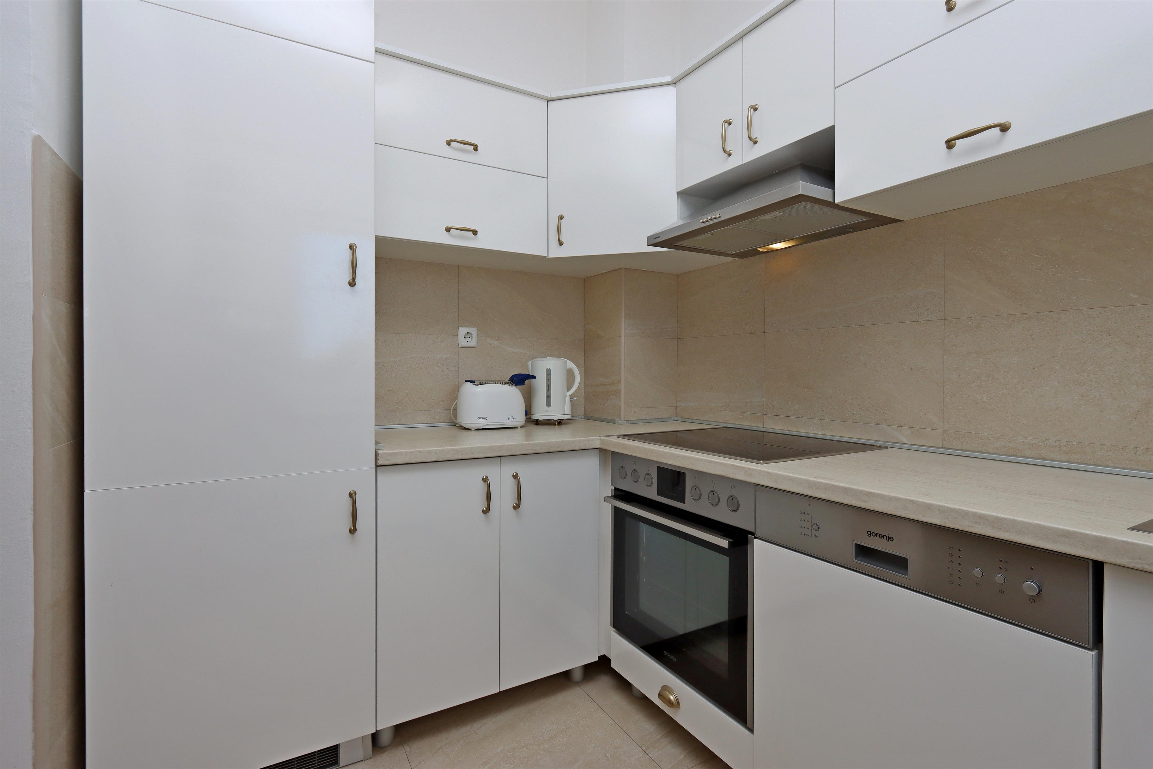 Kitchen (8 m2): Standard equipment: Refrigerator, Stove, Sink, Additional equipment: Combined refrigerator/freezer, Dishwasher, Oven, On request: Microwave oven, Water kettle, Coffee machine, Toaster