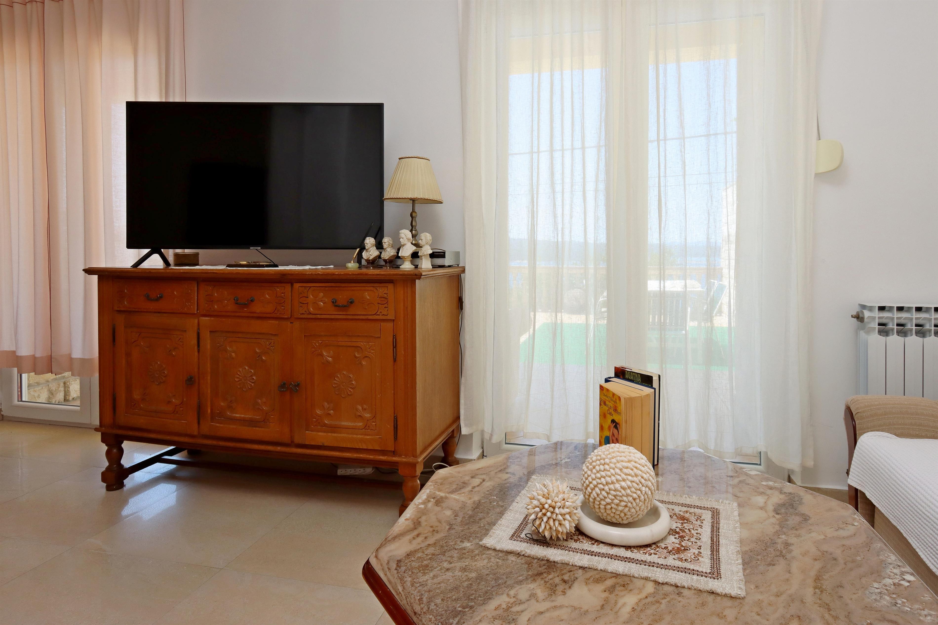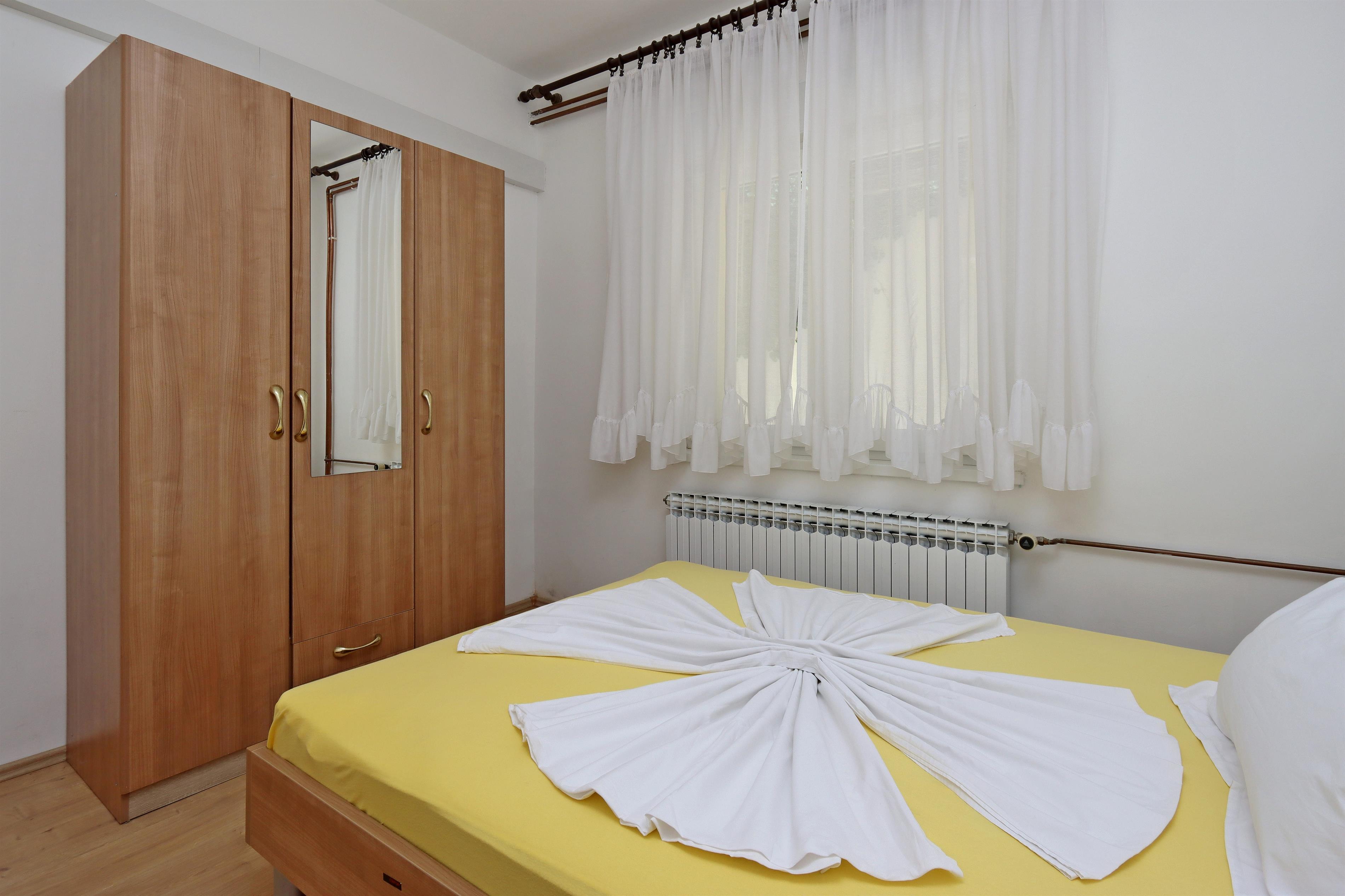 Apartment can accommodate 7 guests. Beds are situated in 2 sleeping rooms, but also in the living room, within 74m2. Guests can use a private terrace to enjoy the warm summer evenings. The apartment offers the sea view. Food can be prepared using barbecue which is shared with other guests too.