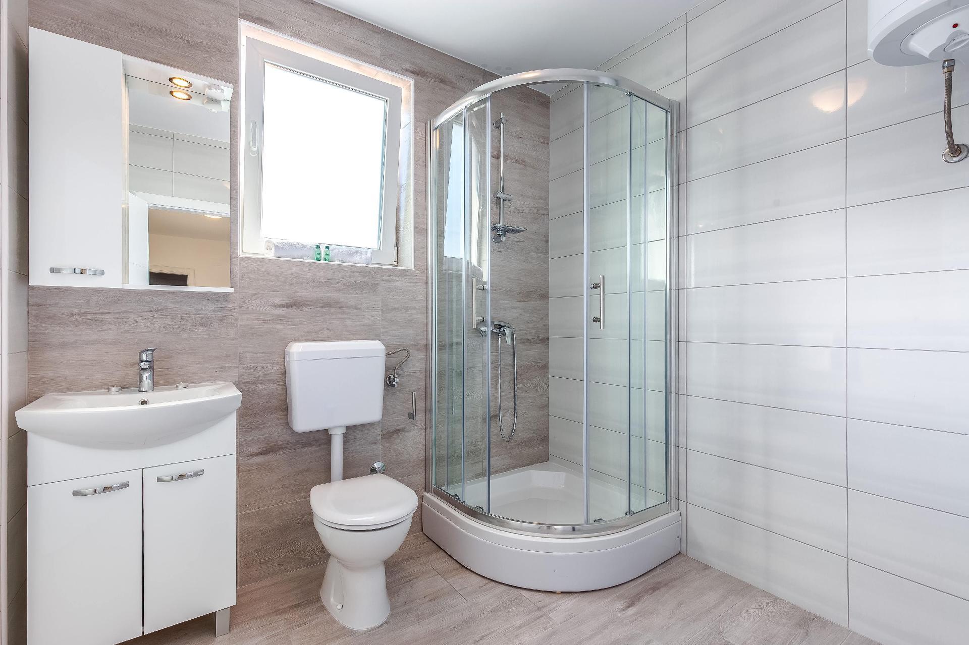 This apartment is located on the third floor and has three bedrooms – one with a double bed and a balcony with beautiful sea views, one with a double bed, and one with two box-spring beds. This apartment also has two bathrooms with shower and toilet, and a separate toilet. There is air conditioning in the living room, as well as in the hallway. From the living room, you have a balcony with stunning sea views.
