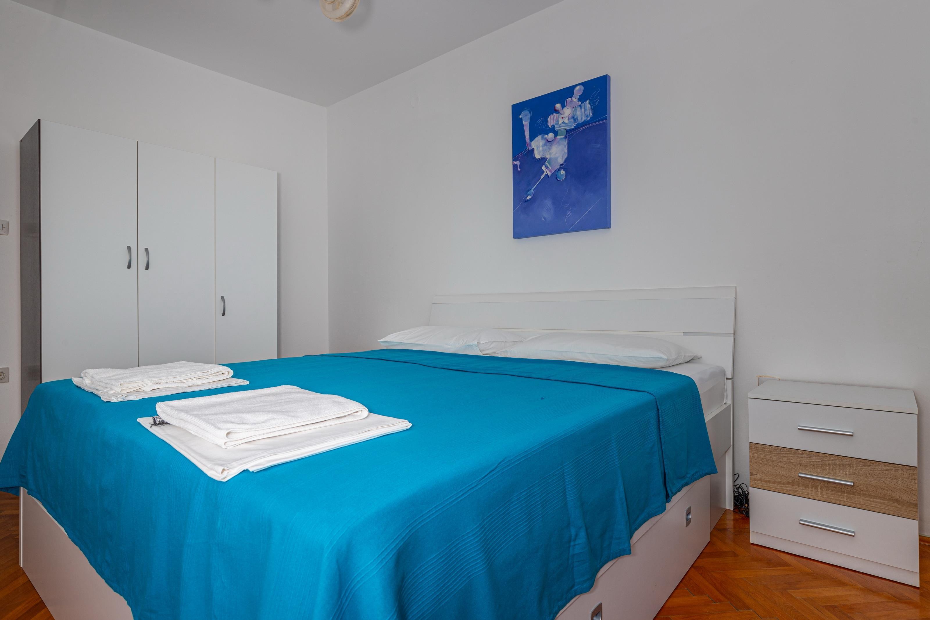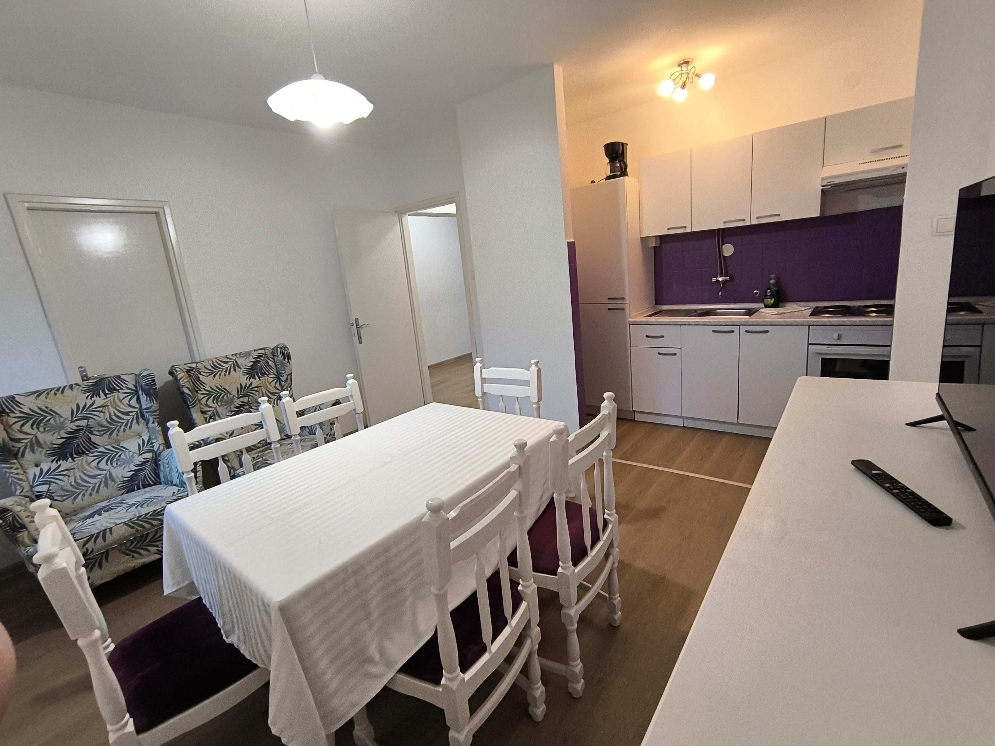 Apartment can accommodate 5 guests. Beds are situated in 2 sleeping rooms, but also in the living room, within 62m2. Guests can use a private balcony to enjoy the warm summer evenings. The apartment offers the sea view. Food can be prepared using barbecue which is shared with other guests too.