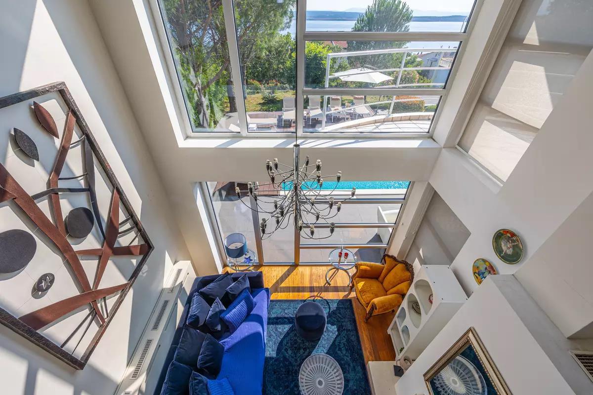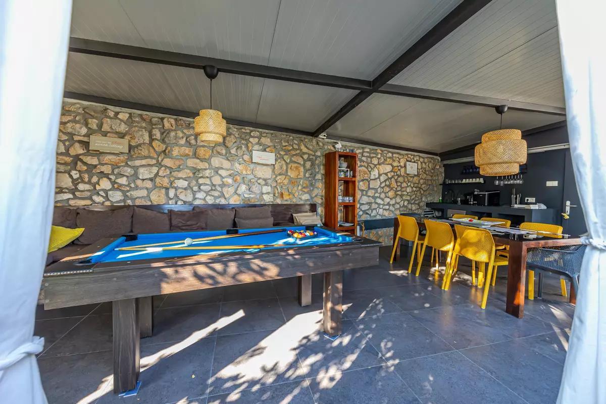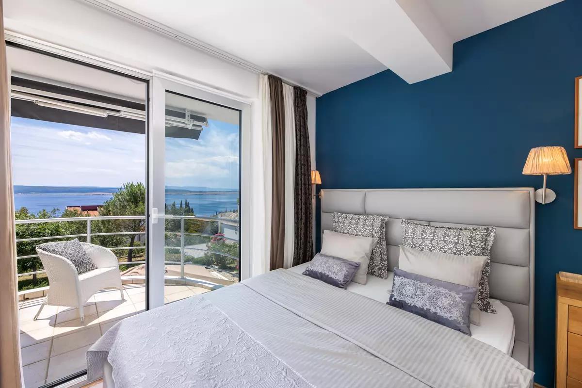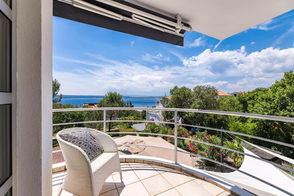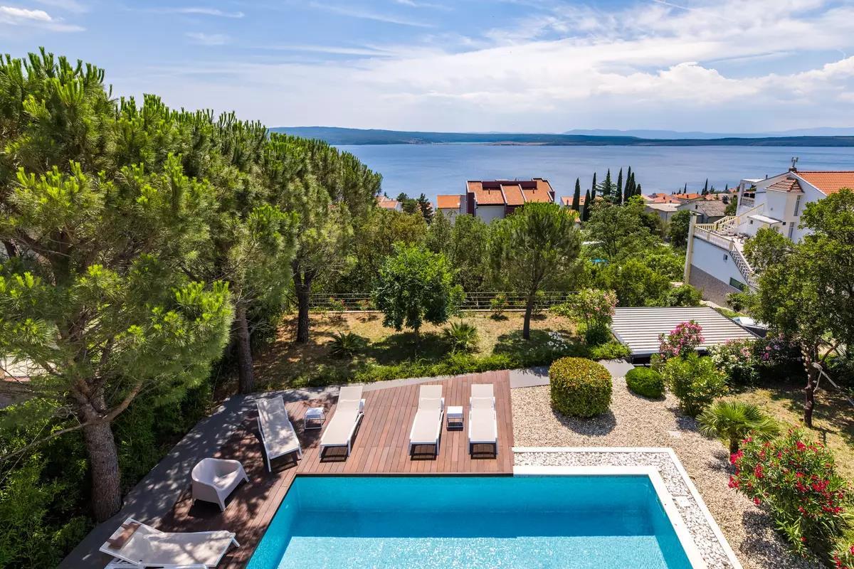 This high quality furnished villa is located in the quiet district of Dramalj/Crikvenica. Dramalj is a quiet place which belongs to the municipality of Crikvenica.The villa is equipped with many extras, with the outside area undoubtedly being the heart of this holiday villa.The rooms are divided over two floors and the top floor.Ground floor:On the ground floor there is a cozy fireplace room which is connected to a billiard room. From here you have direct access to the pool area. A few steps lead to the back of the ground floor where there is a TV room, a separate toilet and the dining/kitchen area.The kitchen leads to another terrace and the garden with a grill. A very interesting internal staircase leads from the living room to the first floor.1st floor:There are three bedrooms (one of which has a balcony) and three bathrooms.Top floor:The fourth bedroom is on the top floor and also has its own balcony.Outside area:In the outside area of ??this wonderful holiday home there is a private garden with barbecue, two terraces (one on the garden side and the other on the pool side), a summer arbor on the sea side, a whirlpool and a 37 m² swimming pool.DETAILED DESCRIPTION:Living area:Separate living room, dining room and kitchen are in one room, terrace, sea view, laminate flooring, carpeting, tiles, satellite TVKitchen:Kitchen, dishes, kitchen towels, electric stove, hotplates: 4, oven, fridge with freezer compartment, filter coffee machine, kettle, dishwasherBedroom:Double room with double bed, laminateDouble room with double bed, balcony, laminateDouble room with double bed, laminateDouble room with double bed, balcony, laminateBathroom:Bathroom with toilet, showerBathroom with toilet, bathtubBathroom with toilet, showerSeparate toilet with wash basinBalcony/terrace:Own balcony, covered, seating, balcony size: 6 m², own terrace, sea view, one floor below, seating, loungers, parasol, terrace size: 75 m²More information:Barbecue available, parking on the property, own swimming pool, swimming pool size: 37 m², outdoor shower, pets allowed, daily fee for pets: per day: 15.00 euros, air conditioning included in the price, fan available, bed linen available, towels available, hairdryer, Internet via W-LANPLEASE NOTE:Due to the longer cleaning time that is necessary for this large property, check-in is only possible from 4:00 p.m. on the day of arrival. Check-out is by 10:00 a.m.This villa is located in a quiet and idyllic area and is therefore not suitable for party holidaymakers and youth groups.