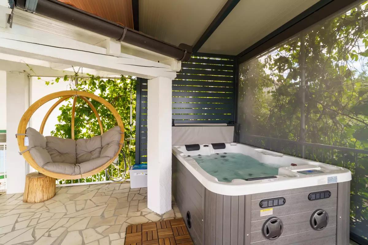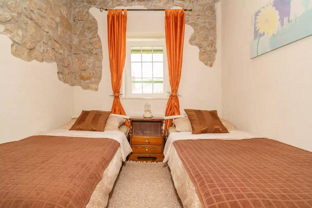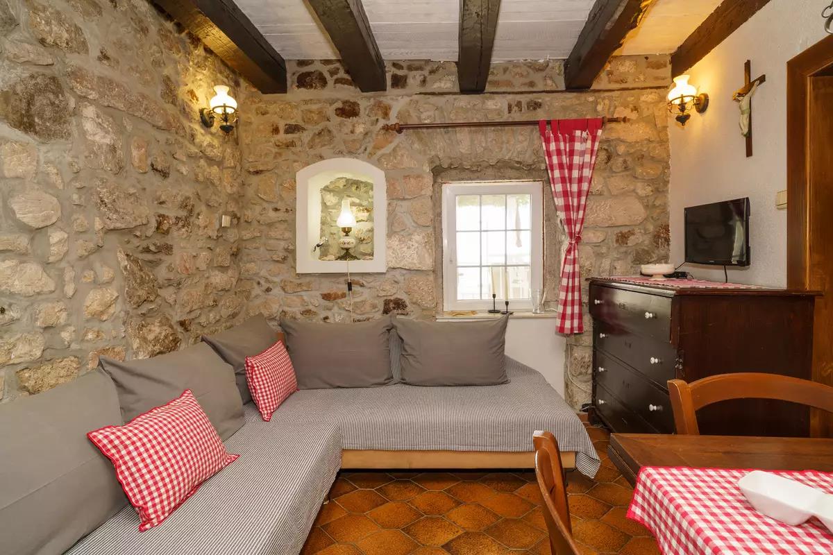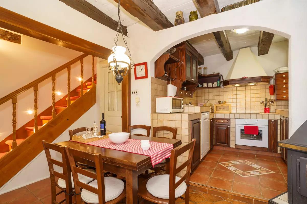 This fenced house for 4-5 people is located in Dramalj, a small fishing village near Crikvenica.This semi-detached house, which was built in 1900 and renovated in 2011, offers you an unforgettable view of the Kvarner Bay and the island of Krk.Since this holiday home is surrounded by green nature, you can be sure of a quiet stay here. The property on which the house is located is completely fenced, so that parents with small children can relax in peace.The house consists of a living-dining room with kitchen in one room, three bedrooms, a bathroom, a beautiful terrace and private parking.Living area:Living / dining room and kitchen are in one room, terrace, tiles, satellite TVKitchen description:Kitchen, dishes, kitchen towels, electric / gas cooker combined, hot plates: 4, oven, refrigerator with freezer, filter coffee machine, microwave, dishwasherBedroom:Double room with double bed, sea view, parquetDouble room with separate beds, sea view, parquetSingle room, sea view, parquetBathroom:Bathroom with toilet, showerBalcony / terrace:Private terrace, covered, sea view, seating, loungers, terrace size: 25 m²Beautiful terrace and private parking.Barbecue, parking on the property, hot tub, pets allowed, climate included in the price, bed linen available, towels available, washing machine in apartment, internet via W-LAN,There is no heating.500 m to the sea, sandy beach 2500 m, fine pebble beach 600 m, pebble beach 500 m, rocky beach 600 mconcrete beach 600 m, center 3000 m, restaurant 800 m, supermarket 1800 m, diving center 2500 m, busy street 300 m