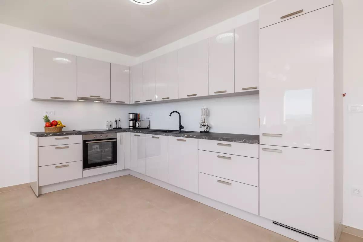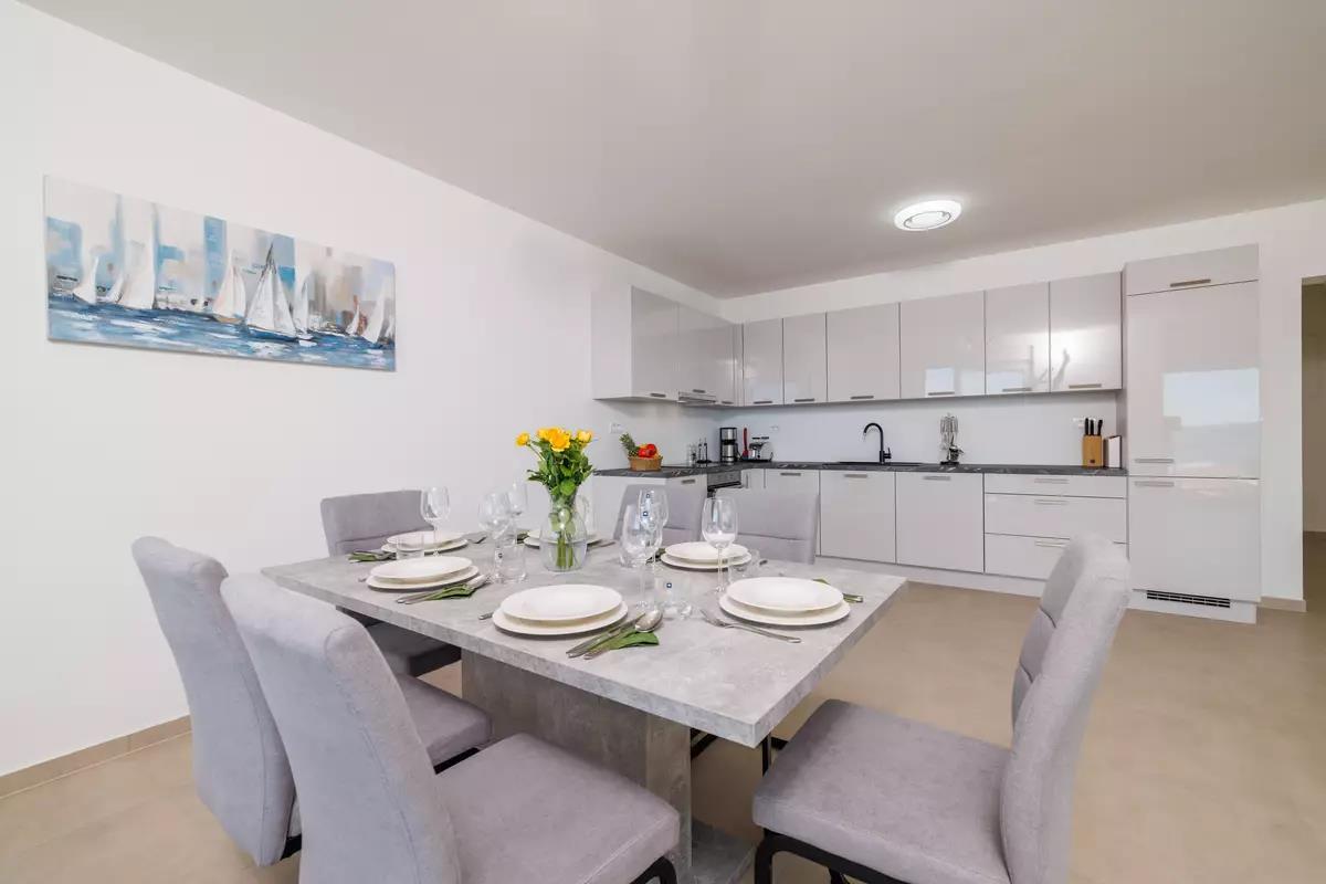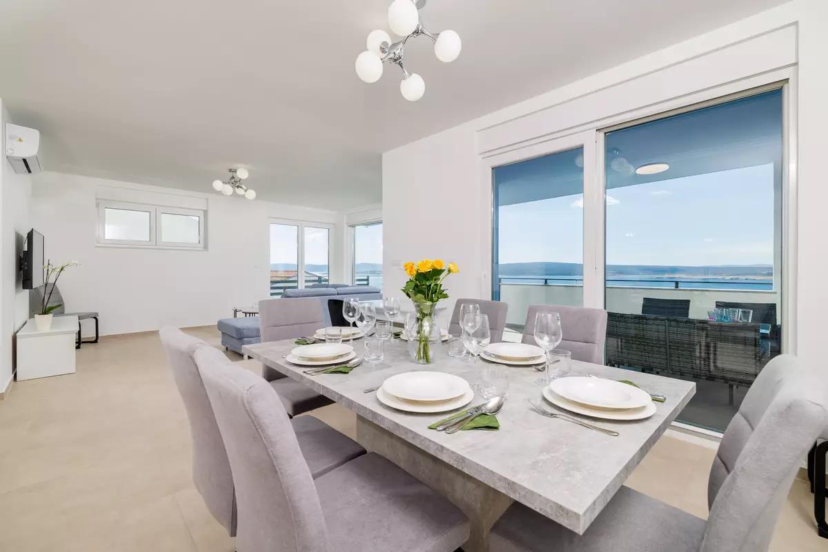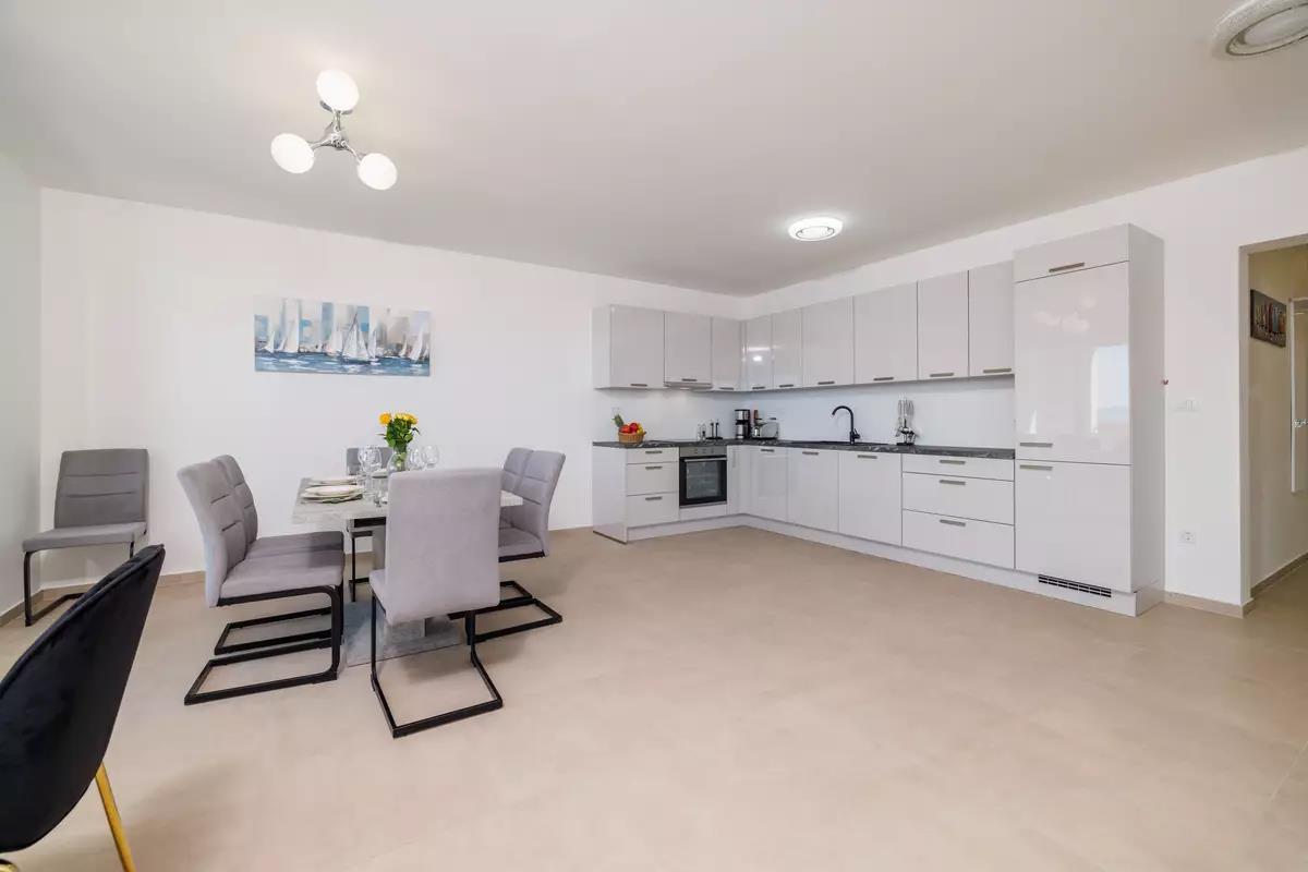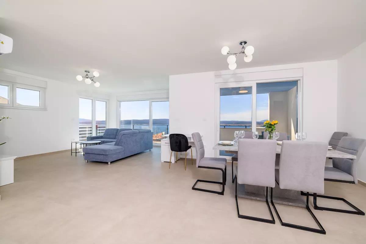 Newly built holiday apartment for 6 people in Crikvenica, Dramalj.Comfortable and modern holiday apartment offers a wonderful holiday for four to six people. The holiday home is divided into a large living and dining area with kitchen, three air-conditioned bedrooms, two bathrooms and a separate toilet.From the living area you can access the large, furnished balcony which offers a fantastic sea view.There are 2 private parking spaces reserved for guests of this holiday apartment.As an additional feature, the holiday apartment offers 4 air conditioning units, floor heating and WiFi.FurnishingLiving areaLiving/dining room and kitchen are one room, balcony, sea view, tilesKitchenCrockery, kitchen towels, electric stove, hotplates: 4, oven, refrigerator with freezer compartment, filter coffee machine, toaster, dishwasherbedroomDouble room with double bed, balcony, sea view, tilesDouble room with double bed, sea view, tilesDouble room with double bed, tilesbathroomBathroom with toilet, showerBathroom with toilet, showerseparate toiletBalcony & terracePrivate covered balcony, sea view, seating, balcony size: 27 m²Further informationBarbecue not allowed, parking space on the property, pets are allowed, heating, air conditioning included in the price, bed linen available, towels available, internet via WiFiTo the sea 200 m, sandy beach 2.5 km, fine pebble beach 600 m, pebble beach 600 m, rocky beach 200 m, reserved sunbathing areas 400 m, center 3.5 km, restaurant 600 m, supermarket 700 m, boat mooring 3.5 km, diving center 2.5 km, busy road 500 m