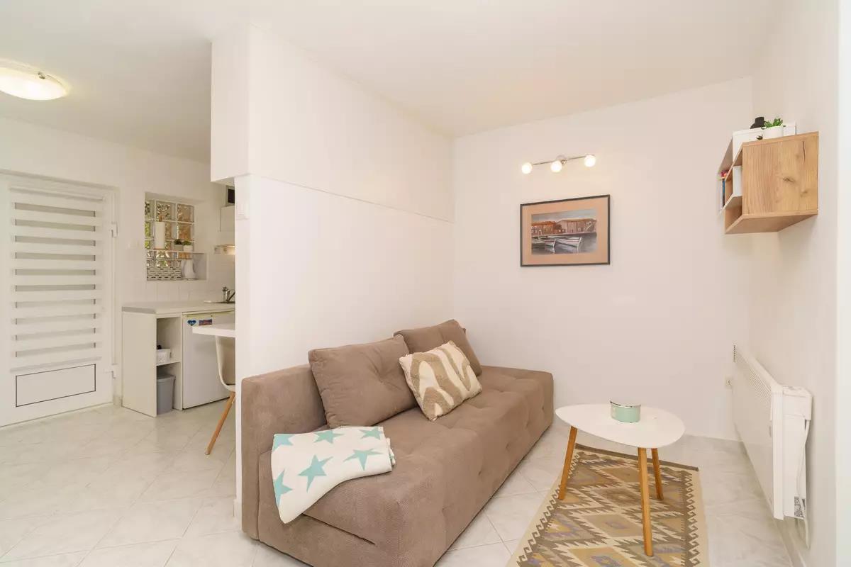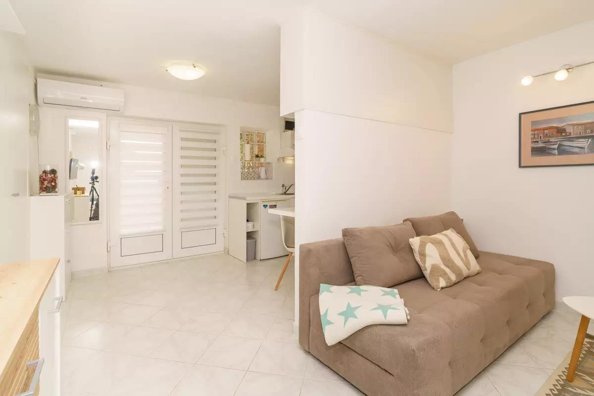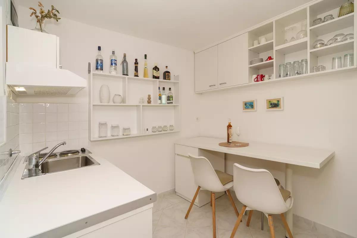 Very well-kept holiday apartment, just 5 minutes walk from the beach and the sea.The apartment is a studio apartment and consists of a living/bedroom with kitchen and dining area in the same room and a bathroom.A beautiful terrace which is covered can be reached directly from the kitchen.Ideal for a relaxing holiday for two.The parking space is on the property of the house.FacilitiesLiving areaLiving room, bedroom and dining room are one room, sofa bed for two people, open bedroomTerrace, tilesKitchenCrockery, kitchen towels, electric stove, hotplates: 4, refrigerator with freezer compartment, pads coffee machine, kettleBathroomBathroom with toilet, showerBalcony & terraceOwn terrace, covered, seating, terrace size: 5 m²Further informationGarden for use, grill, parking on the property, pets not allowed, air conditioning included in the price, bed linen provided, towels providedTo the sea 350 m, sandy beach 1.3 km, fine pebble beach 350 m, pebble beach 350 m, rocky beach 380 m, concrete beach 350 m, center 2 km, restaurant 480 m, supermarket 750 m, boat mooring 2 km, diving center 1.3 km, busy road 200 m