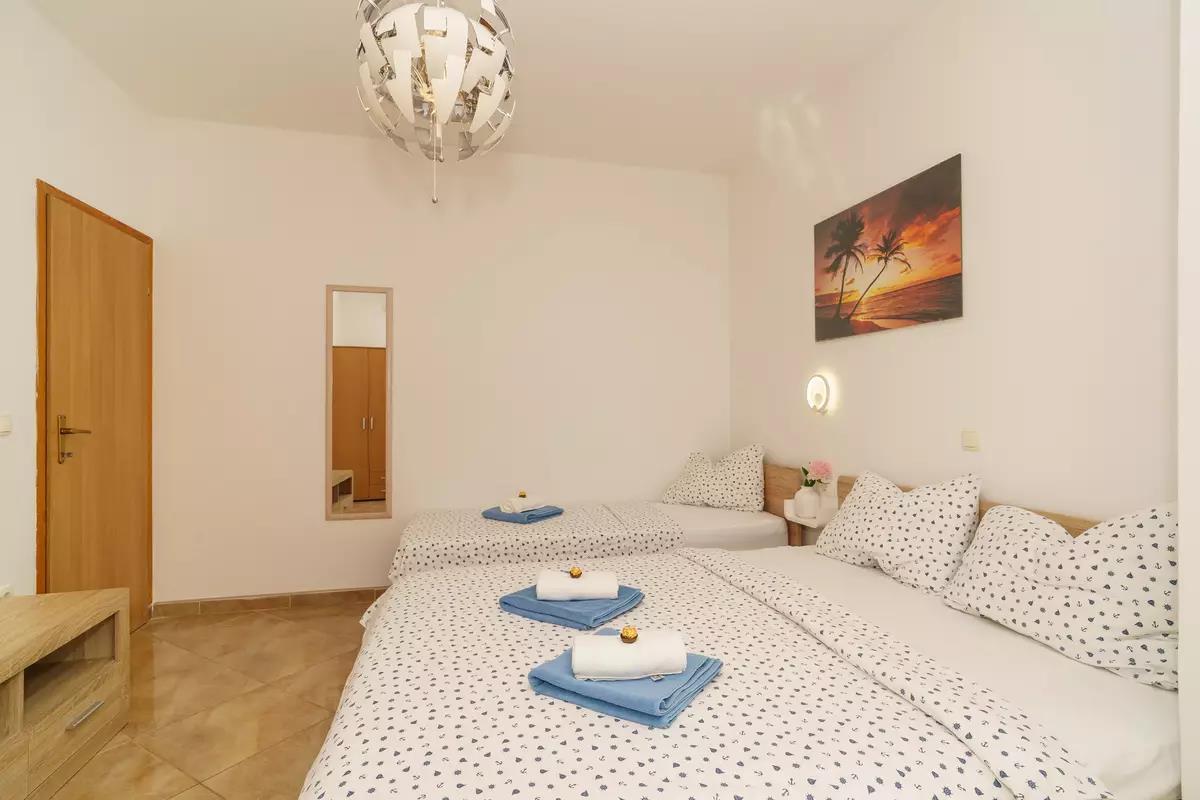 Holiday apartment with stunning sea views in Dramalj – ideal for 2 to 3 peopleThis cozy holiday apartment in Dramalj offers everything you need for a relaxing holiday on the Croatian Adriatic coast. It is ideal for two people, but also has room for a third person. The separate bedroom is tastefully furnished and invites you to relax.From the living and dining area, you can enjoy a wonderful view of the sea – a perfect place to start the day with breakfast or enjoy the sunset in the evening. The kitchen is fully equipped, allowing you to easily self-cater even on vacation.The bathroom has a shower and is modern and well-maintained. Air conditioning and free Wi-Fi provide additional comfort during your stay. Private parking is available directly on site.An outdoor barbecue is also available for use and invites you to enjoy convivial evenings. The apartment is in a quiet location, just a few minutes' walk from the beach. Shops and restaurants are within easy walking distance.Enjoy relaxing days with a sea view, Mediterranean flair, and the warm atmosphere of Dramalj – we look forward to your visit.AmenitiesLiving AreaDining area and kitchen are in one room, tiled floorsKitchenDishes, kitchen towels, electric stove, 2 hotplates, oven, refrigerator with freezer, coffee machine, kettleBedroomBedroom with double bed, single bed, access to balcony/terrace, sea view, tiled floorsBathroomBathroom with toilet, showerBalcony & TerracePrivate balcony, partially covered, sea view, seating, balcony size: 6 m²Further InformationBarbecue available, private parking on site, pets not allowed, air conditioning included in the price, owner lives in the same house, bed linen provided, towels provided, Wi-Fi internet access