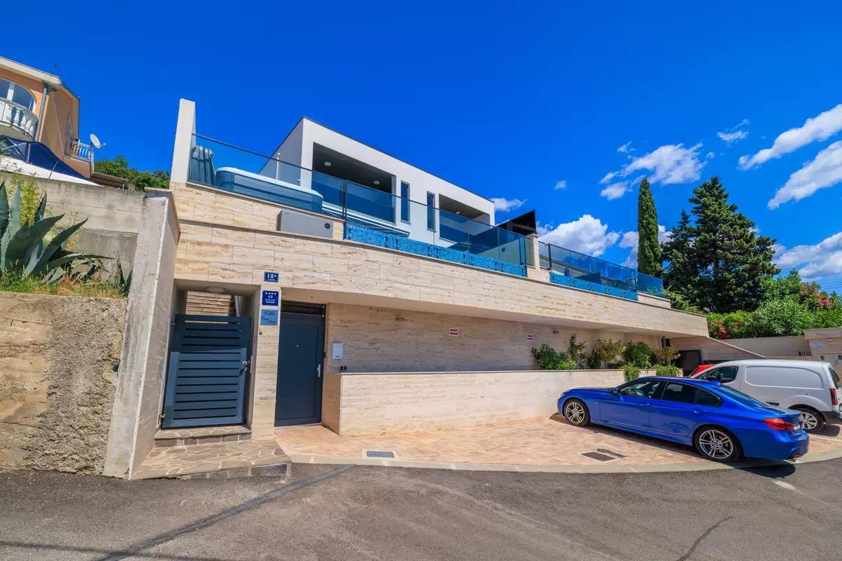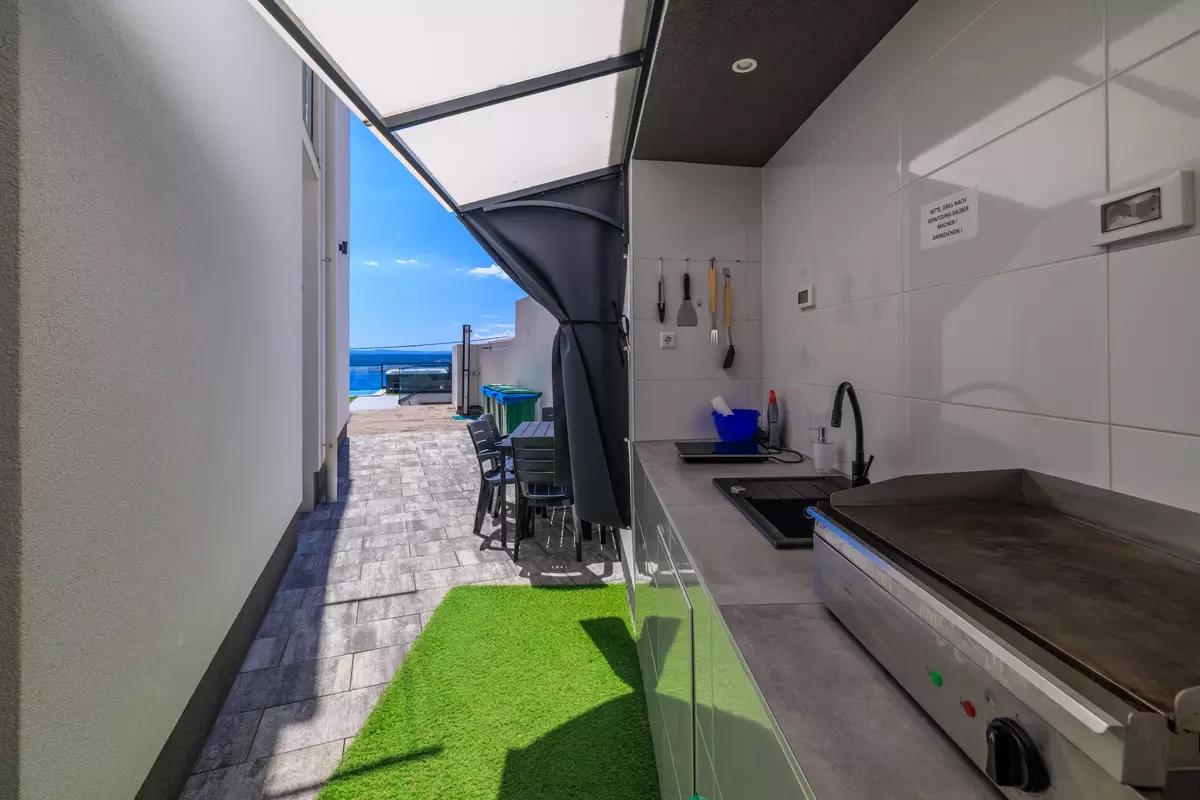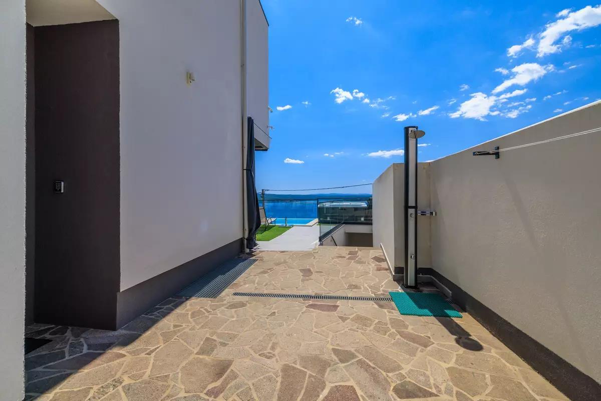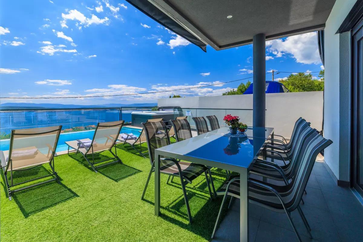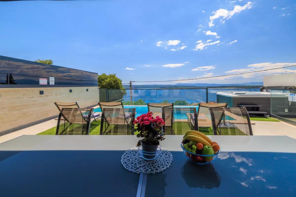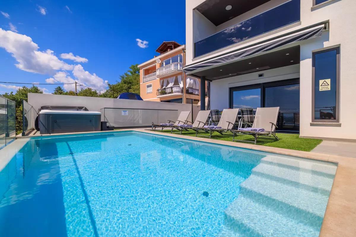 Experience a dream vacation in our exclusive holiday villa in Dramalj on the Crikvenica coast – the perfect retreat for those who value comfort, privacy, and Mediterranean flair. The spacious villa with four air-conditioned bedrooms offers ample space for families or groups of friends. Two of the bedrooms have private balconies with stunning sea views, ideal for relaxing mornings or romantic sunsets. Four stylishly appointed bathrooms and an additional guest toilet ensure the highest level of comfort.The tastefully furnished interior of the villa welcomes you with a light-filled living room that invites you to linger, as well as a fully equipped kitchen where culinary ideas become reality.The outdoor area is a real highlight: a heated pool, a whirlpool with sea views, and a covered summer kitchen with a barbecue area create ideal conditions for relaxing days outdoors. The Mediterranean garden offers not only privacy but also a dreamlike backdrop for unforgettable vacation moments.Entertainment is also provided: a private recreation area with a pool table, darts, and chess invites you to spend sociable evenings. Free Wi-Fi is available, as is private parking on site. Enjoy the beauty of the Croatian Adriatic in a setting that combines tranquility, style, and joie de vivre. Your perfect getaway begins here – we look forward to welcoming you.AmenitiesLiving AreaLiving/dining area and kitchen are in one room, tiled floor, satellite TVKitchenDishes, kitchen towels, electric stove, 4 hotplates, oven, refrigerator with freezer, coffee maker, kettle, microwave, toaster, dishwasherBedroomBedroom with double bed, tiled floor, balconyBedroom with double bed, tiled floor, balconyBedroom with double bed, tiled floorBedroom with double bed, tiled floorBedroom with double bed, tiled floorBathroomBathroom with toilet, showerBathroom with toilet, showerBathroom with toilet, showerGuest toiletBalcony & TerracePrivate balcony, covered, sea view, seating, balcony size: 20 m²Private terrace, seating, loungers, terrace size: 40 m²Further InformationGarden for use, barbecue available, private parking on site, swimming pool (32 m²), whirlpool, outdoor shower, pets not allowed, air conditioning included in the price, bed linen provided, towels provided, hairdryer, washing machine in the accommodation Wi-Fi InternetDistancesSea 880 m, sandy beach 2.5 km, fine pebble beach 950 m, pebble beach 950 m, rocky beach 900 m, concrete sunbathing areas 880 m, town center 3 km, restaurant 800 m, supermarket 400 m, boat mooring 3.2 km, diving center 2.5 km