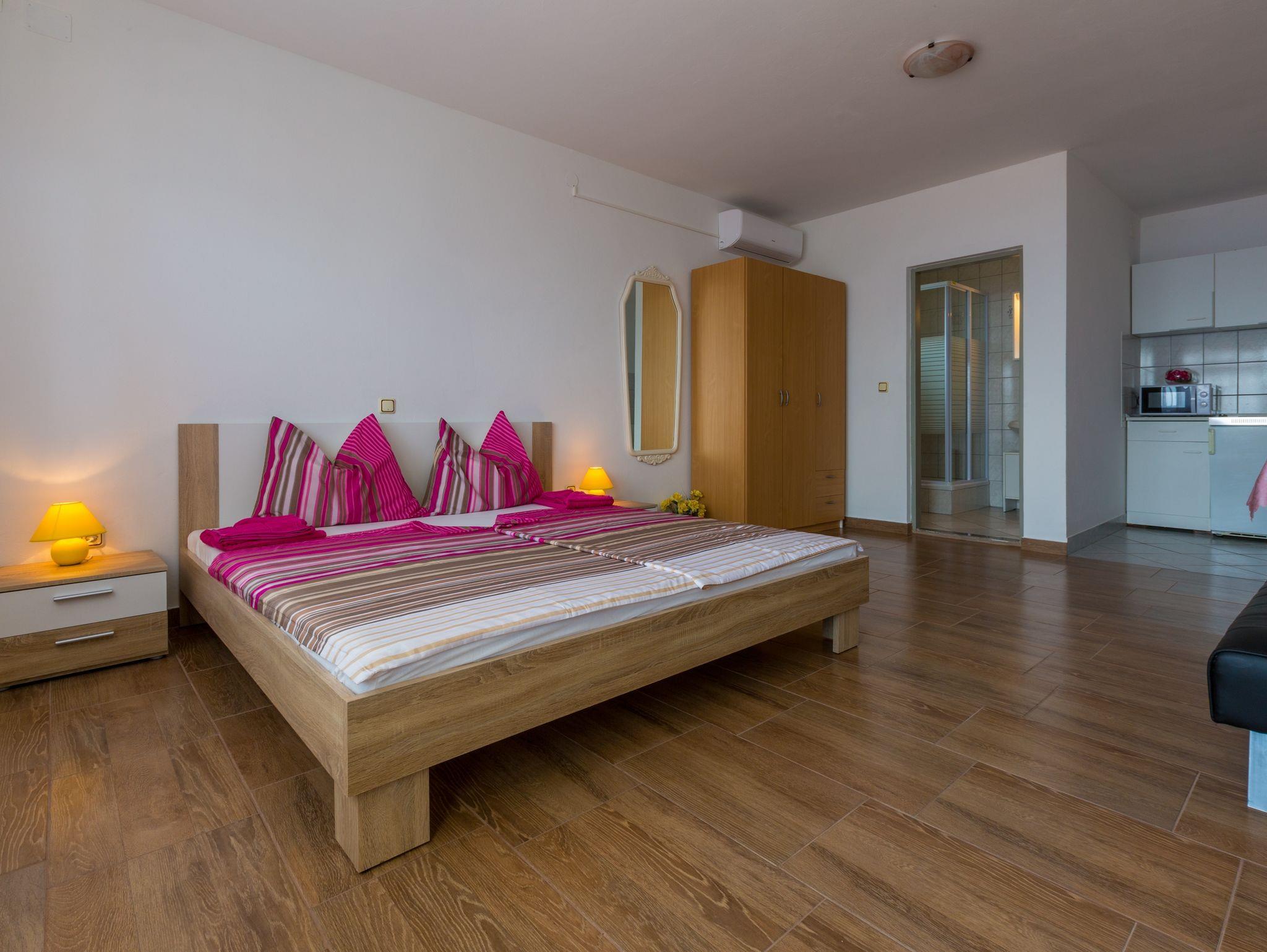 Studio bietet Platz für 2 Gäste. Die Betten sind in Schlafzimmern, die es 1 gibt, innerhalb einer Gesamtfläche von 30m2, angeordnet. Die Gäste haben einen eigenen Balkon zur Verfügung, auf der sie in warmen Sommernächten genießen können. Das Studio-Apartment bietet Meerblick. Es ist erlaubt, Speisen auf dem Gemeinschafts-Grill vorzubereiten. Während ihres Aufenthalts können Gäste das gemeinsam zur Nutzung stehende Schwimmbad benutzen. Über den Balkon der gebuchten UNterkunftseinheit gehen auch andere Gäste oder Vermieter. IM PREIS INBEGRIFFEN: Kurtaxe, Endreinigung, Pool, Parkplatz, Internet, Kinderbett. VERBINDLICHE ZUSÄTZLICHE KOSTEN: Aufzahlung für Kurzaufenthalte (prozentualer Zuschlag pro Nächtigungsanzahl: 30% - 1, 20% - 2, 10% - 3). UNVERBINDLICHE ZUSÄTZLICHE KOSTEN: Klimatisierung (7,00 € pro Nacht). Die Verfügbarkeit zusätzlicher Dienstleistungen in Ihrem reservierten Termin und die Preise derselben (falls nicht aufgeführt) müssen im Voraus überprüft werden. Zusätzliche Dienstleistungen die in der Zahlungsaufforderung nicht aufgeführt sind werden direkt beim Vermieter bezahlt, angenommen der Gast nutzt auch diese.