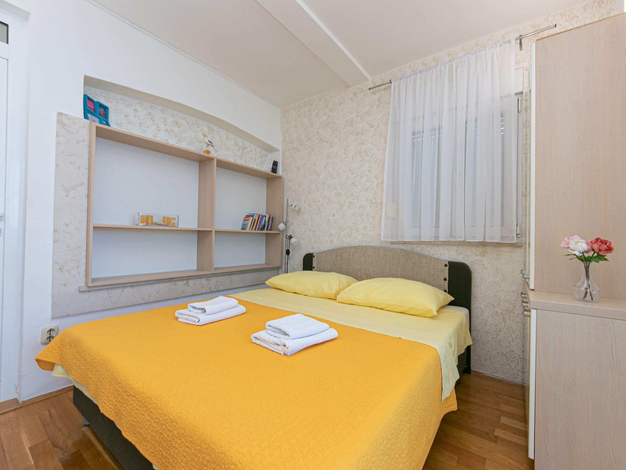 Ferienwohnung bietet Platz für 4 Gäste. Die Betten sind in Schlafzimmern, die es 1 gibt, und in Esszimmer, innerhalb einer Gesamtfläche von 22m2, angeordnet. Die Gäste haben eine eigene Terrasse zur Verfügung, auf der sie in warmen Sommernächten genießen können. Das Apartment bietet Meerblick. IM PREIS INBEGRIFFEN: Kurtaxe, Endreinigung, Klimatisierung, Parkplatz, Internet. VERBINDLICHE ZUSÄTZLICHE KOSTEN: Aufzahlung für Kurzaufenthalte (prozentualer Zuschlag pro Nächtigungsanzahl: 30% - 1, 20% - 2, 10% - 3). Die Verfügbarkeit zusätzlicher Dienstleistungen in Ihrem reservierten Termin und die Preise derselben (falls nicht aufgeführt) müssen im Voraus überprüft werden. Zusätzliche Dienstleistungen die in der Zahlungsaufforderung nicht aufgeführt sind werden direkt beim Vermieter bezahlt, angenommen der Gast nutzt auch diese.