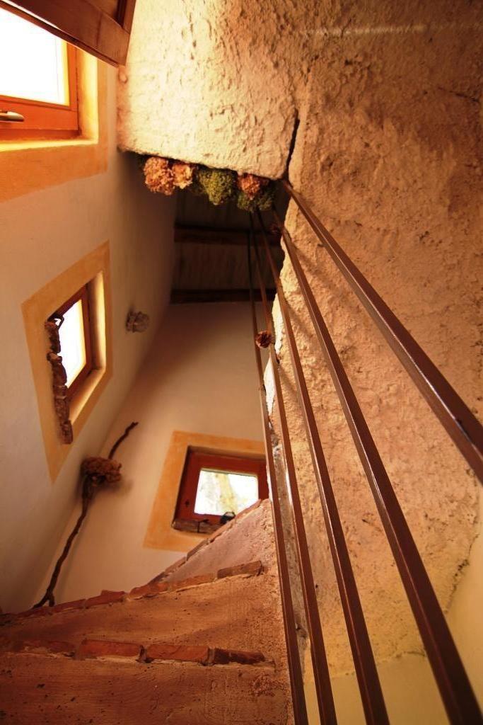 The living space of 80m² is spread over two floors and includes a living and dining space with an integrated open kitchen, two bedrooms, three bathrooms and a storage room with a washing machine. The living room on the ground floor provides a comfortable sofa, a TV and a dining table with four chairs. The large stone fireplace stove built into the wall enhances the rustic country house atmosphere and provides homely warmth on cooler evenings. The kitchen next to it is equipped with a hob, oven, fridge with freezer compartment, kettle, toaster and coffee machine. There is a convenient bathroom on the ground floor with a shower, a washbasin with a wall mirror, a hairdryer and a toilet. Wide, rustic, wooden stairs lead to the upper floor with the two bedrooms and the two further bathrooms. The first bedroom is furnished with a double bed (200 x 200cm), the second with four single beds (90 x 200cm), and this room also benefits from a wall-mounted flatscreen TV. The two bathrooms are fitted the same as the one on the ground floor. Plenty of bed linen and towels are provided and the reliable wireless Internet connection can be used free of charge.