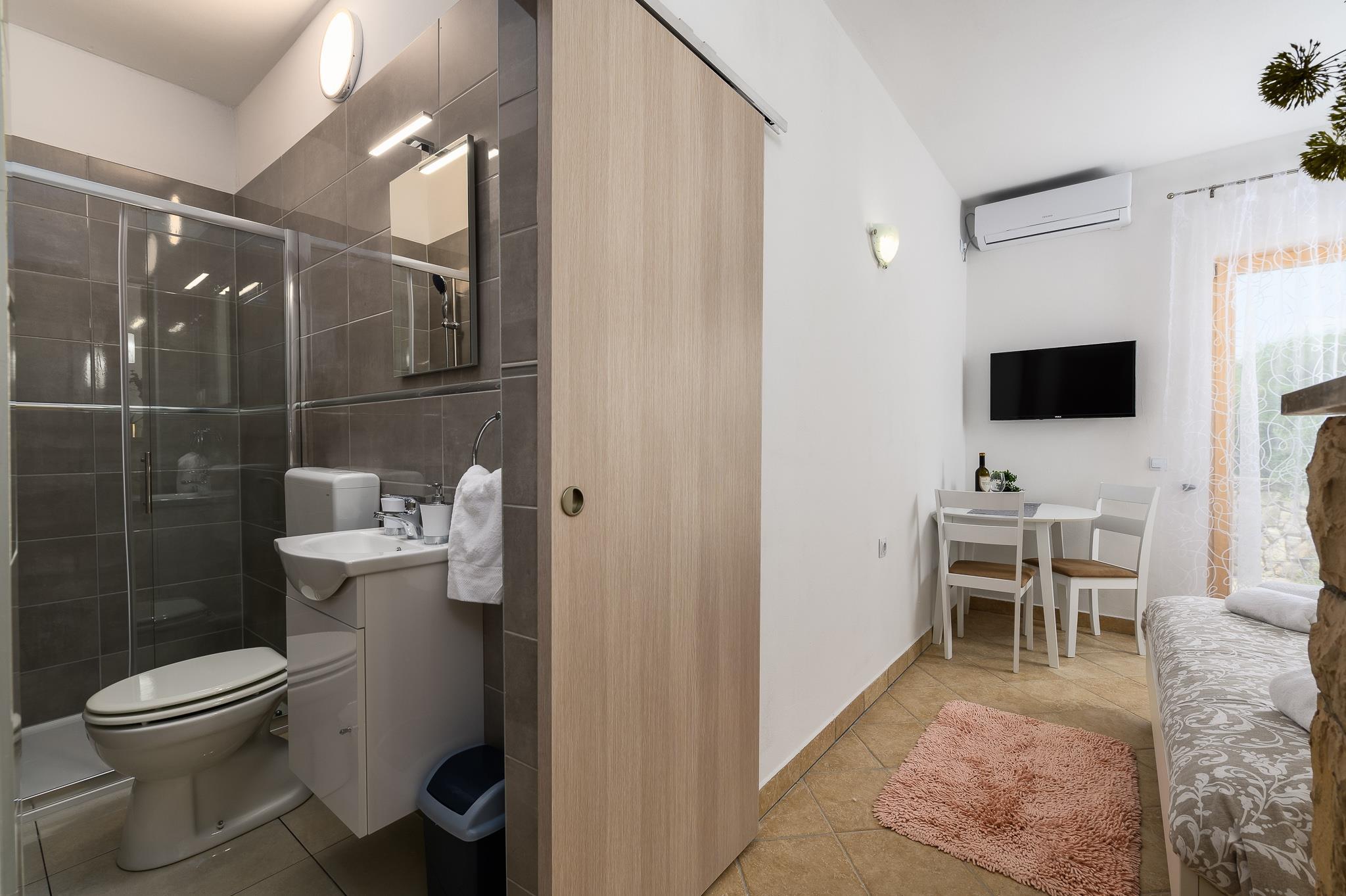 Studio flat can accommodate 2 guests. Beds are situated in 1 sleeping rooms, within 25m2. Guests can use a private terrace to enjoy the warm summer evenings. The studio offers the sea view. Food can be prepared using barbecue which is shared with other guests too. Shared pool is on disposal during stay. This accommodation unit welcomes pets at an additional charge.