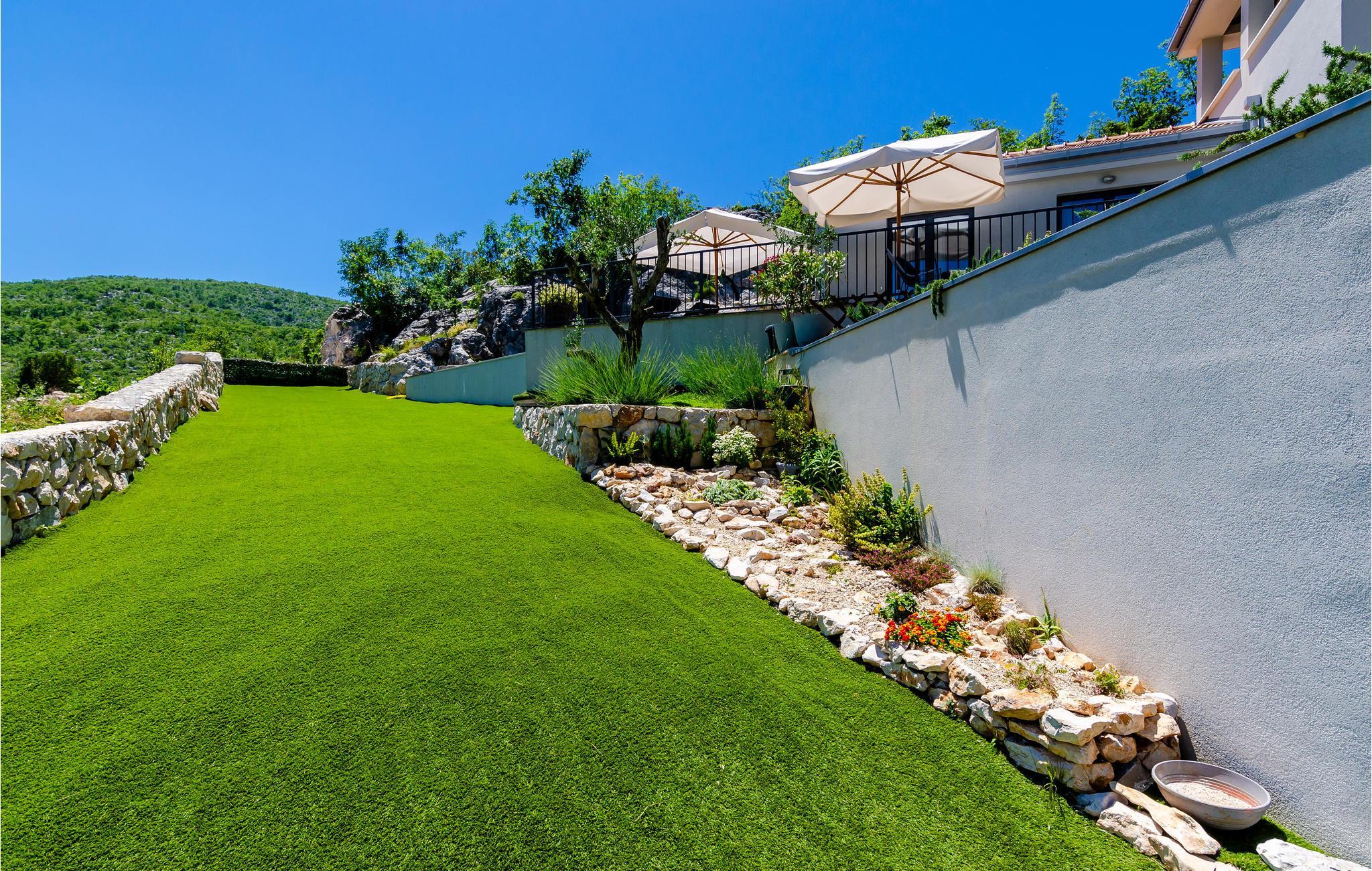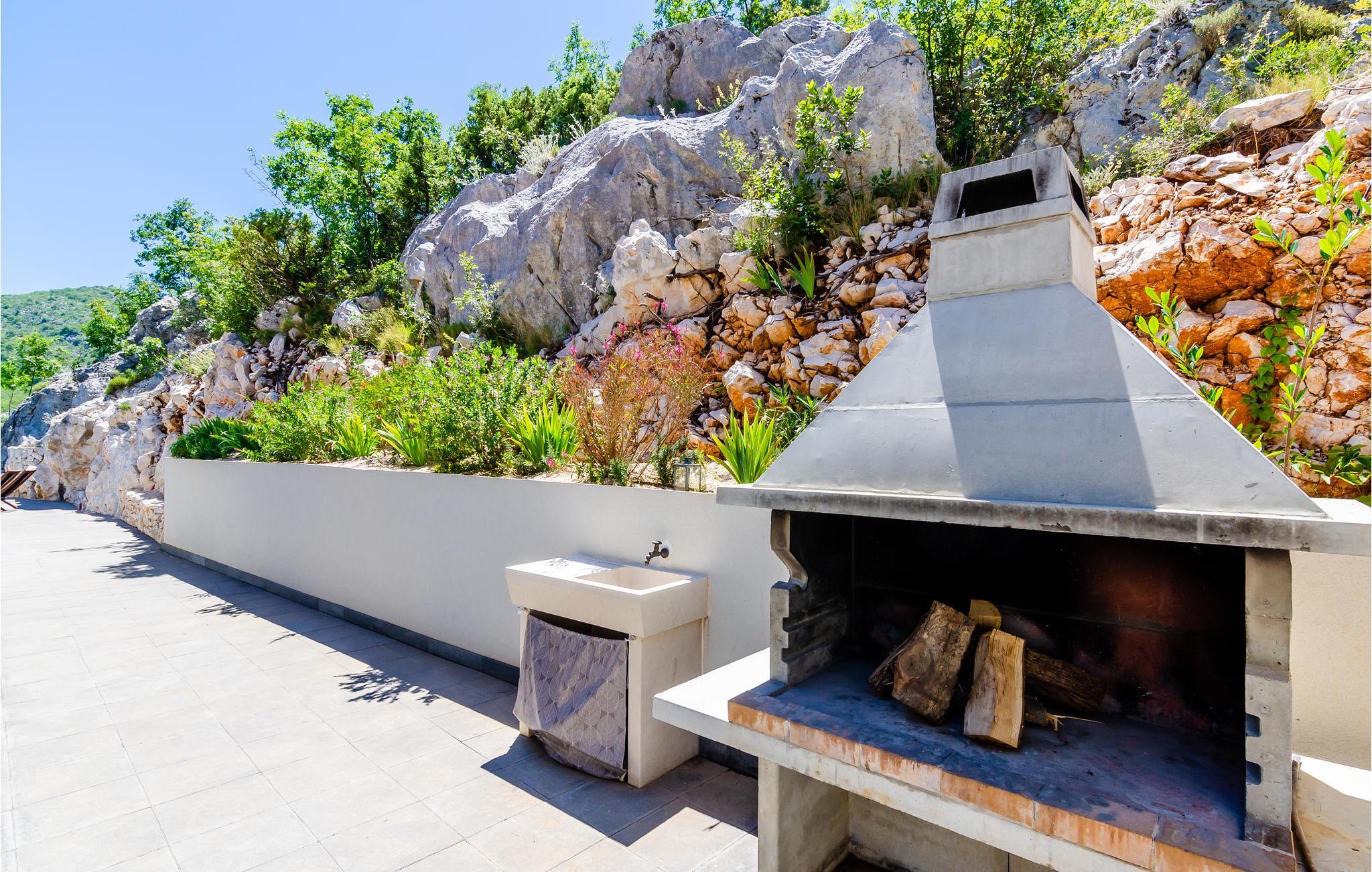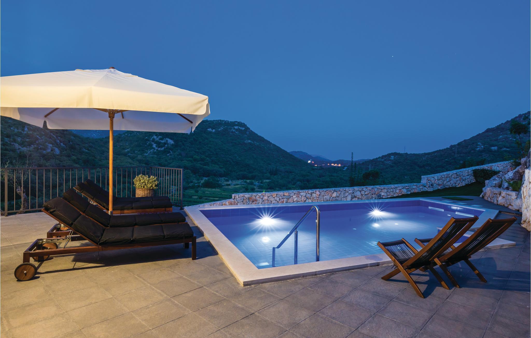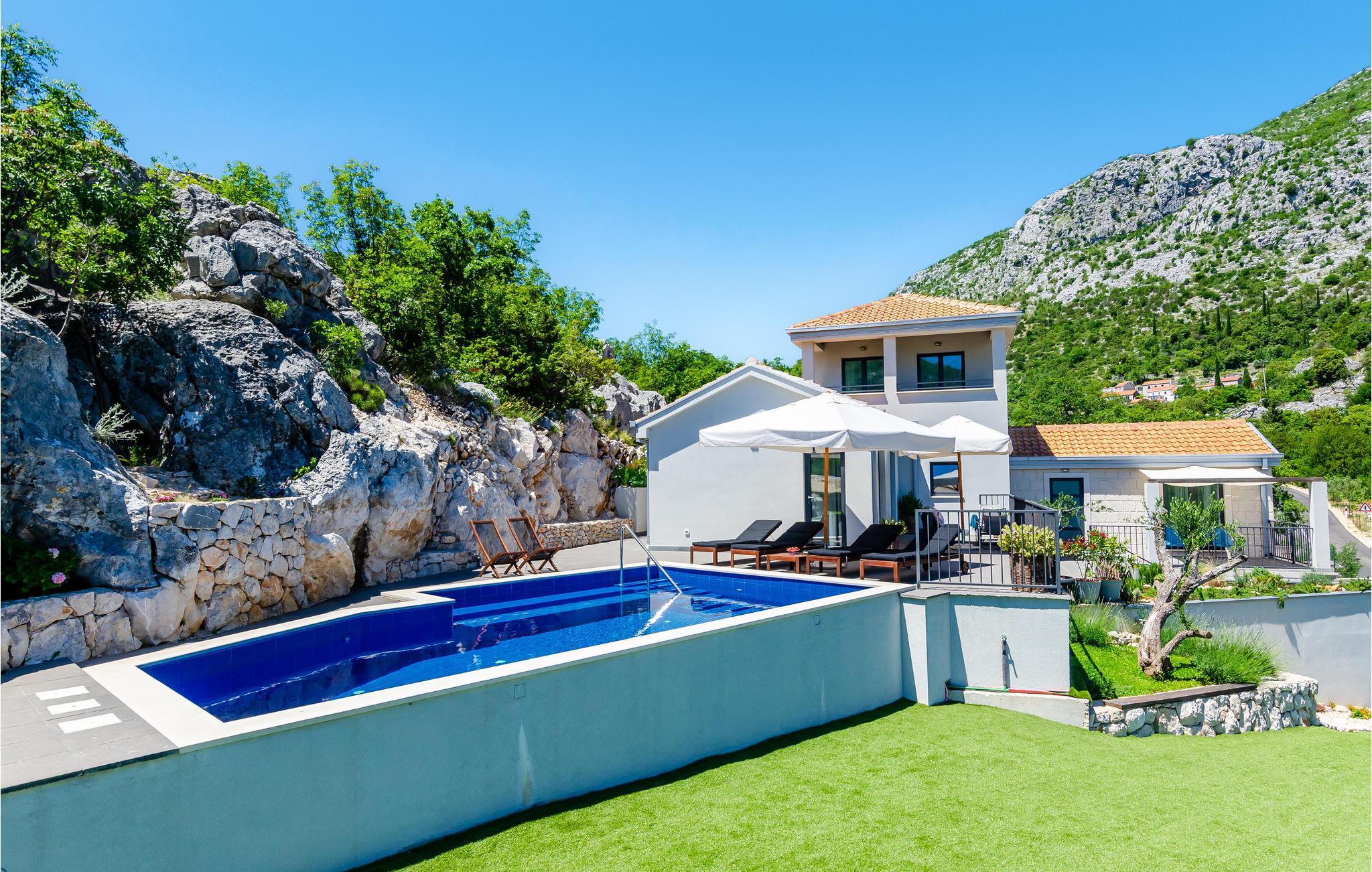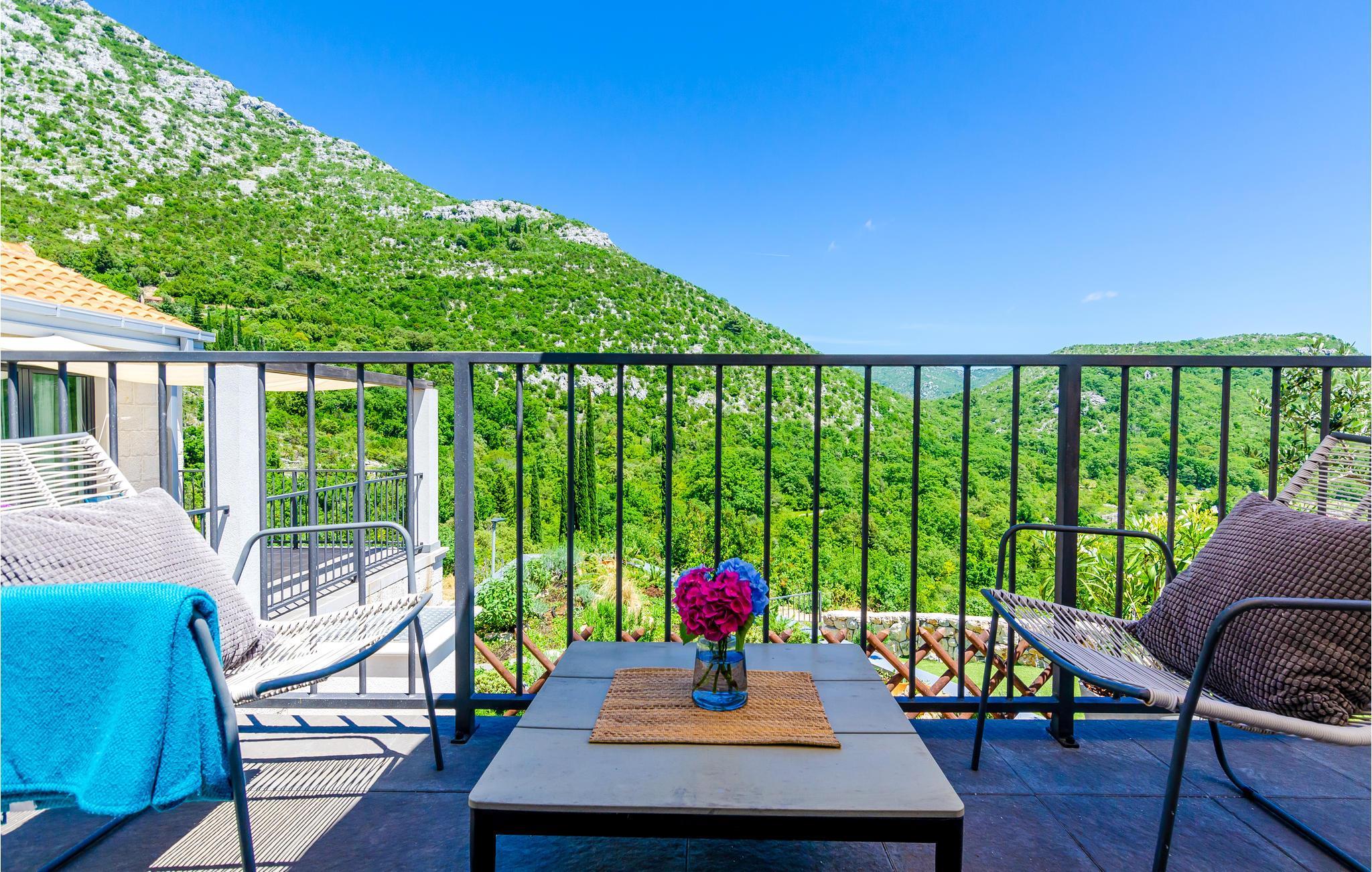 Dieses schöne Steinhaus befindet sich im Hinterland von Dubrovnik. Es ist modern ausgestattet und dekoriert, und ein großer Pool und ein wunderschön angelegter Garten verleihen ihm zusätzlichen Charme. Im Untergeschoss des Hauses liegt eine kleinere Wohnung, die sich aus einem Wohn und Schlafzimmer als auch einem Baderzimmer zusammensetzt und über eine Außentreppe mit dem Haupthaus verbunden ist. Dieses verfügt über einen gerümigen Wohn- und Essbereich mit Küche, 3 Schlafzimmern, zwei Badezimmern und Toilette. Davon sind ein Schlaf- und Badezimmer im 1.Stock. Im Hinterbereich des Hauses steht eine überdachte Terrasse zur Verfügung, die auch eine Grillmöglichkeit bietet. Das Ferienhaus liegt etwas abseits des Ortes und bietet einen schönen Ausblick auf die Landschaft.