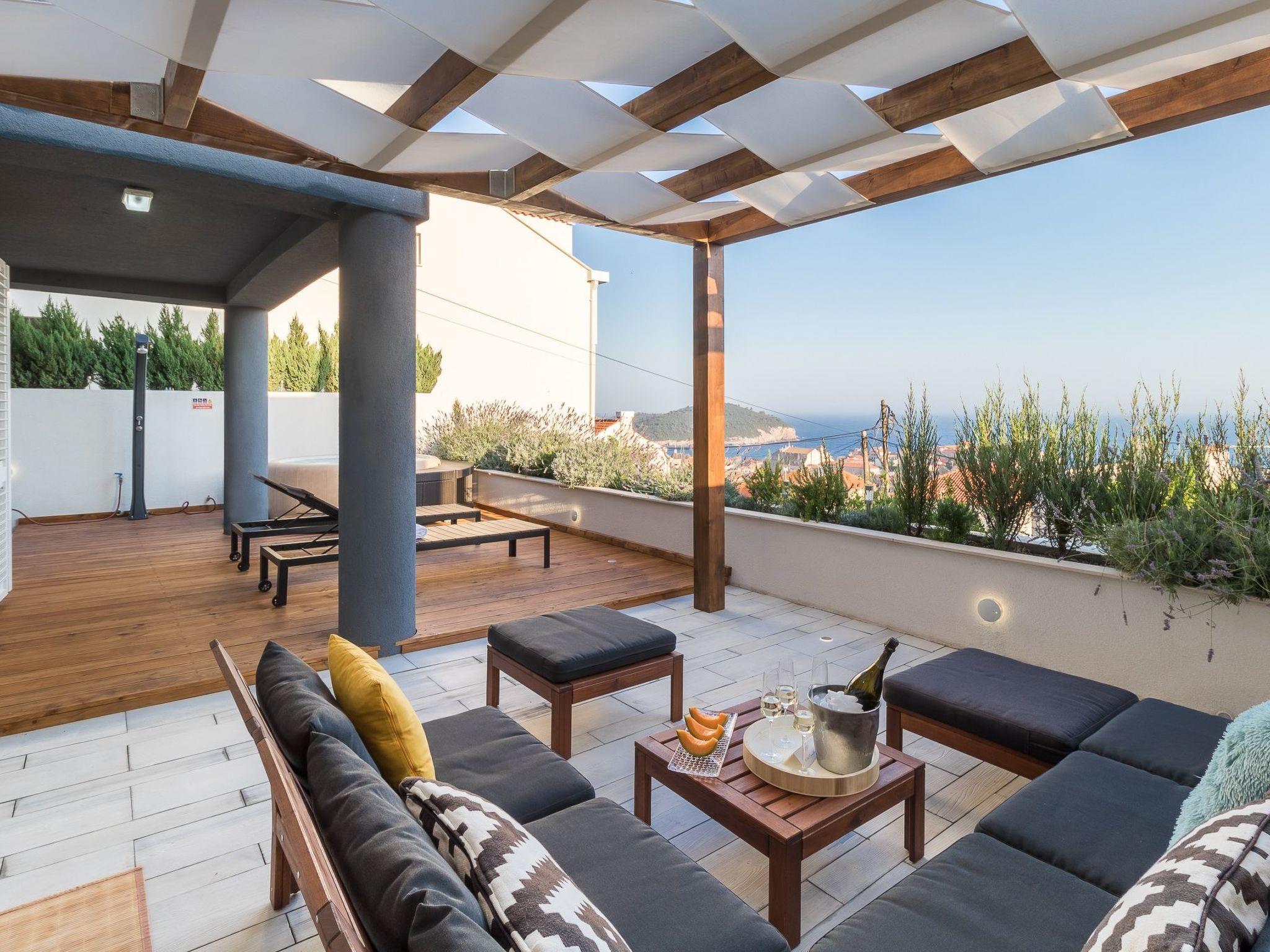 The outdoor area with terrace, comfortable garden furniture and jaccuzi has an area of 120 m².