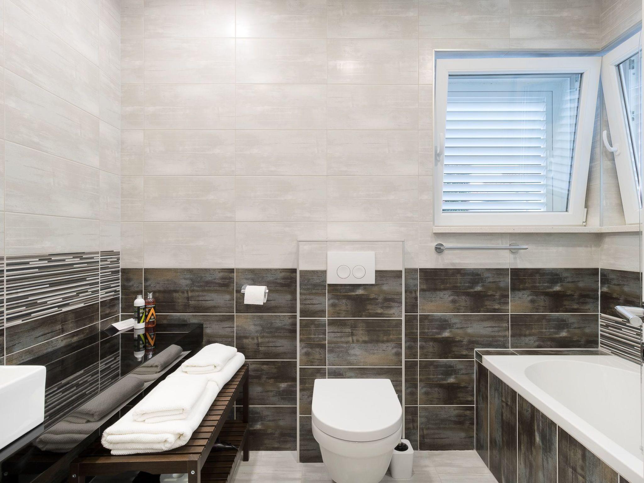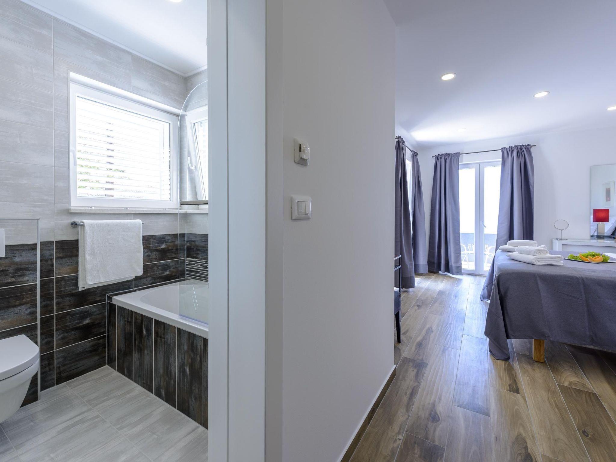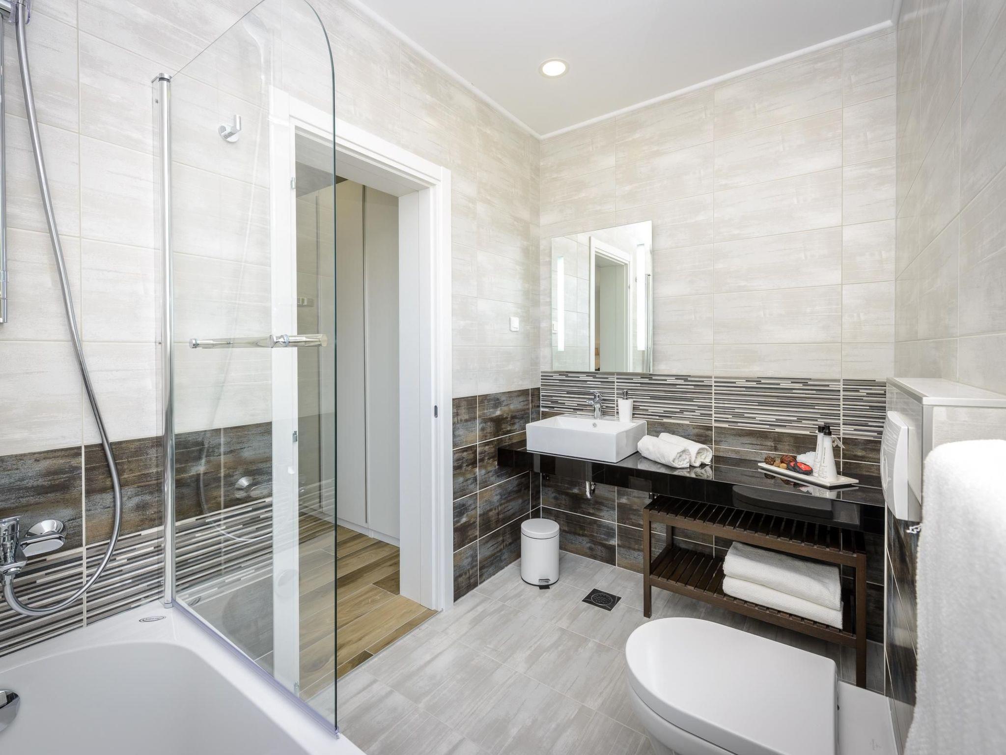 This modern and spacious holiday flat is spread over two floors and has a living/dining room with open-plan kitchen, four bedrooms and three bathrooms. The living/dining room is furnished with a sofa bed for a maximum of one child or teenager, a dining table, a smart TV and a fully equipped kitchen with a cooking island, all appliances and sufficient cutlery and crockery. The bedrooms all have a double bed measuring 180 cm x 200 cm. Two bedrooms have an en-suite bathroom. Two bathrooms are equipped with a shower, a washbasin and a toilet. The third bathroom has a bath, washbasin and toilet. There is also a fourth separate toilet. The master bedroom with en-suite bathroom with bathtub has a balcony with views of the old town and the sea and an LED TV.