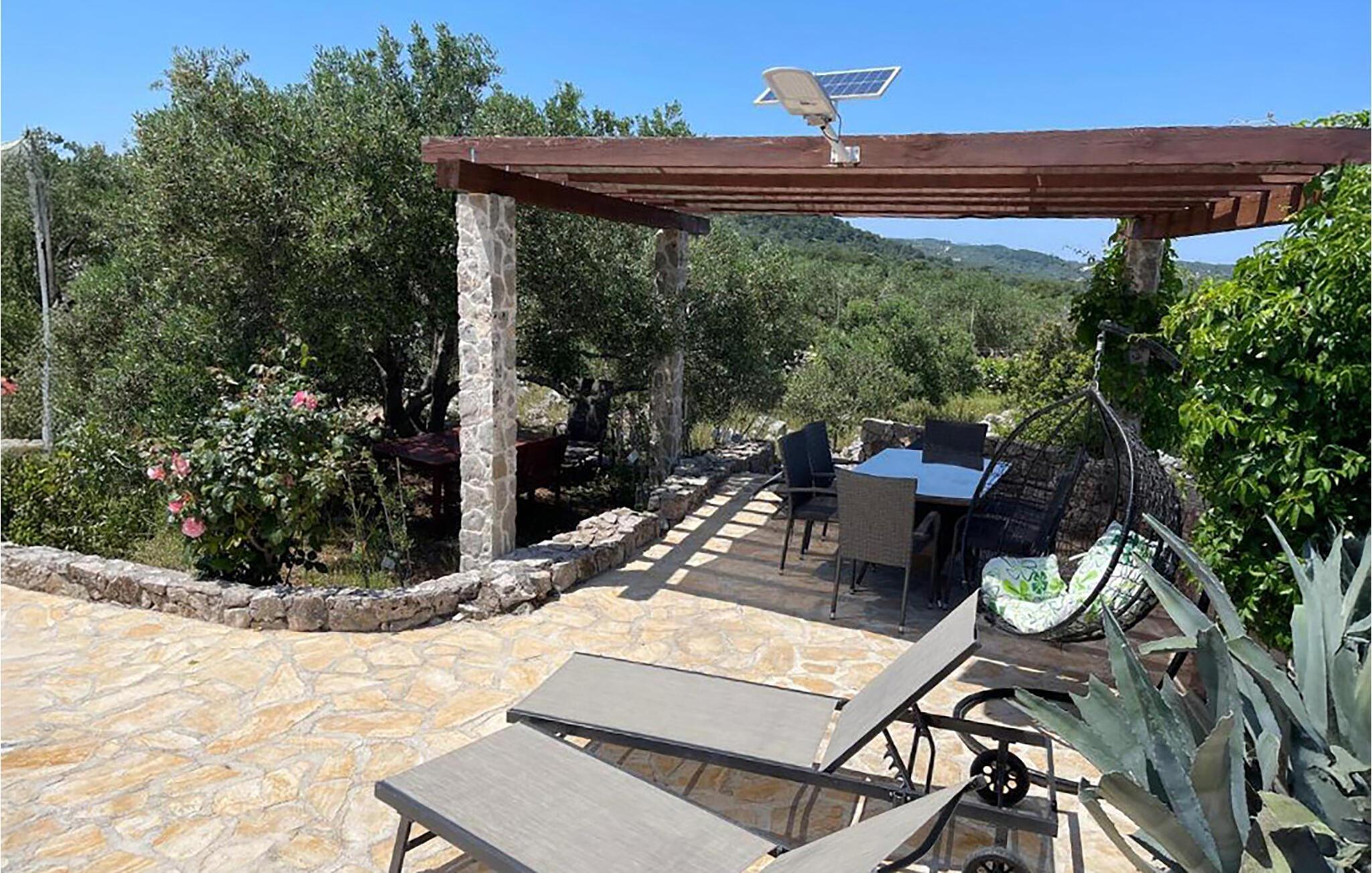 Draußen erwartet Sie ein mediterran gestalteter Garten mit Terrassenflächen, Sonnenliegen und überdachtem Essbereich. Entspannen Sie im Hängesessel, genießen Sie den Blick auf das kristallklare Meer und lauschen Sie den Klängen der Natur. Die umliegende Landschaft mit Olivenbäumen und Steinmauern bietet ein idyllisches Ambiente für ruhige Stunden.