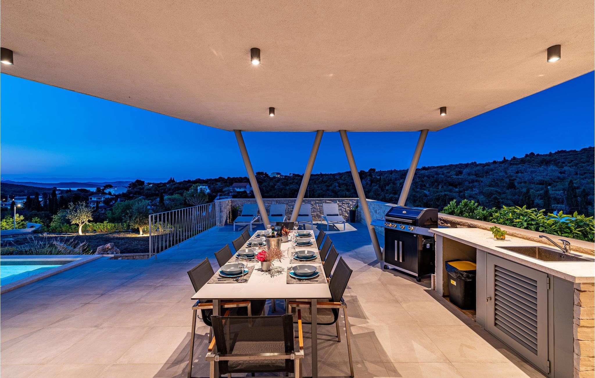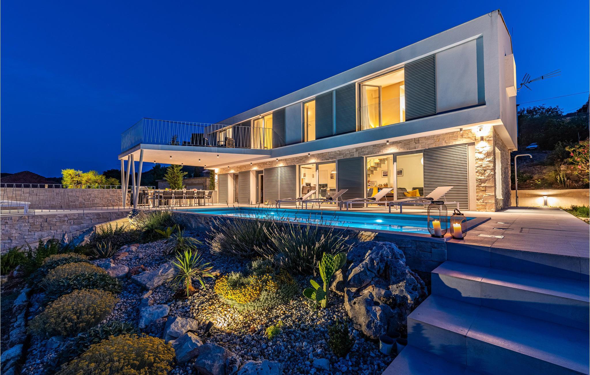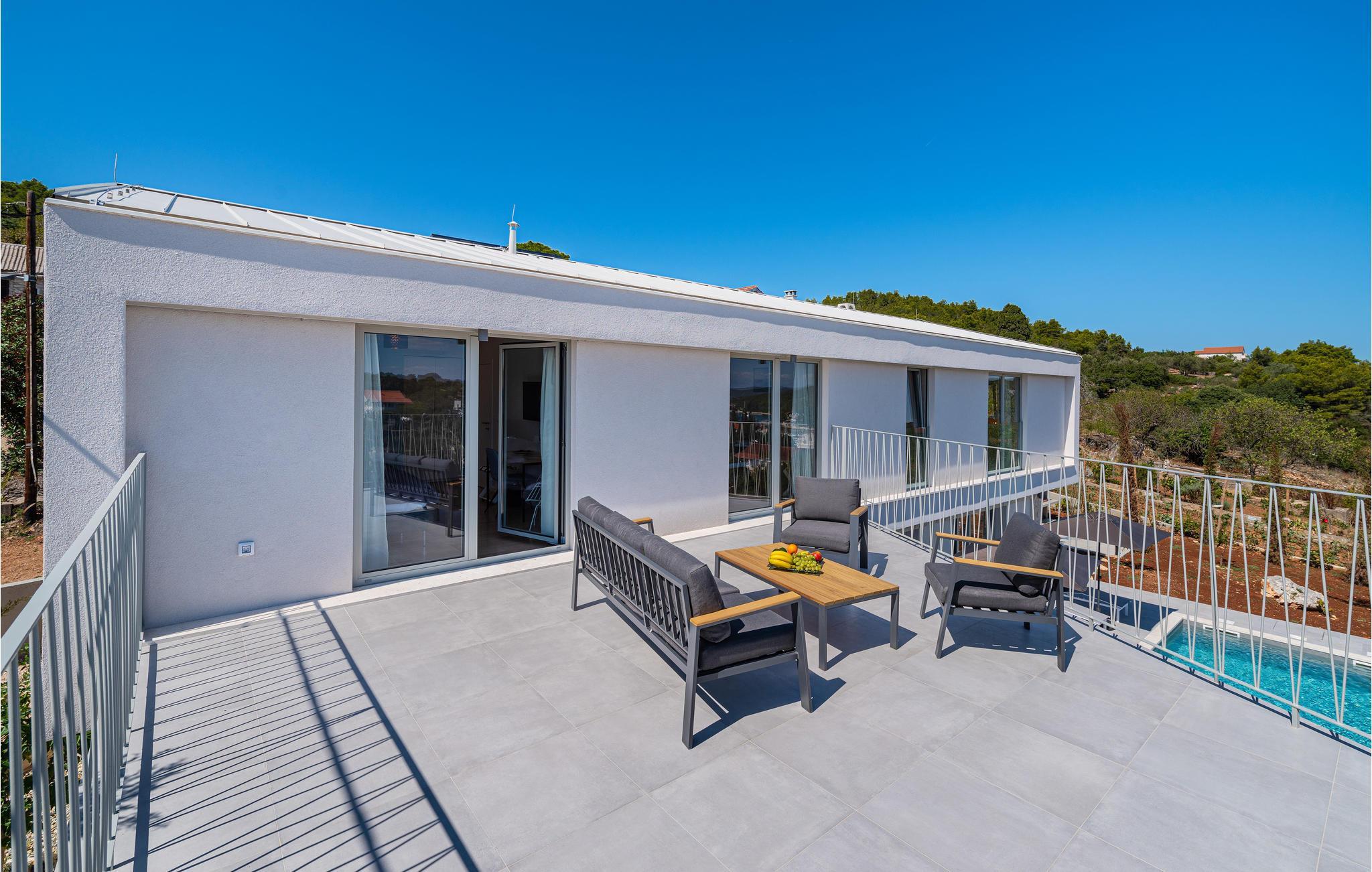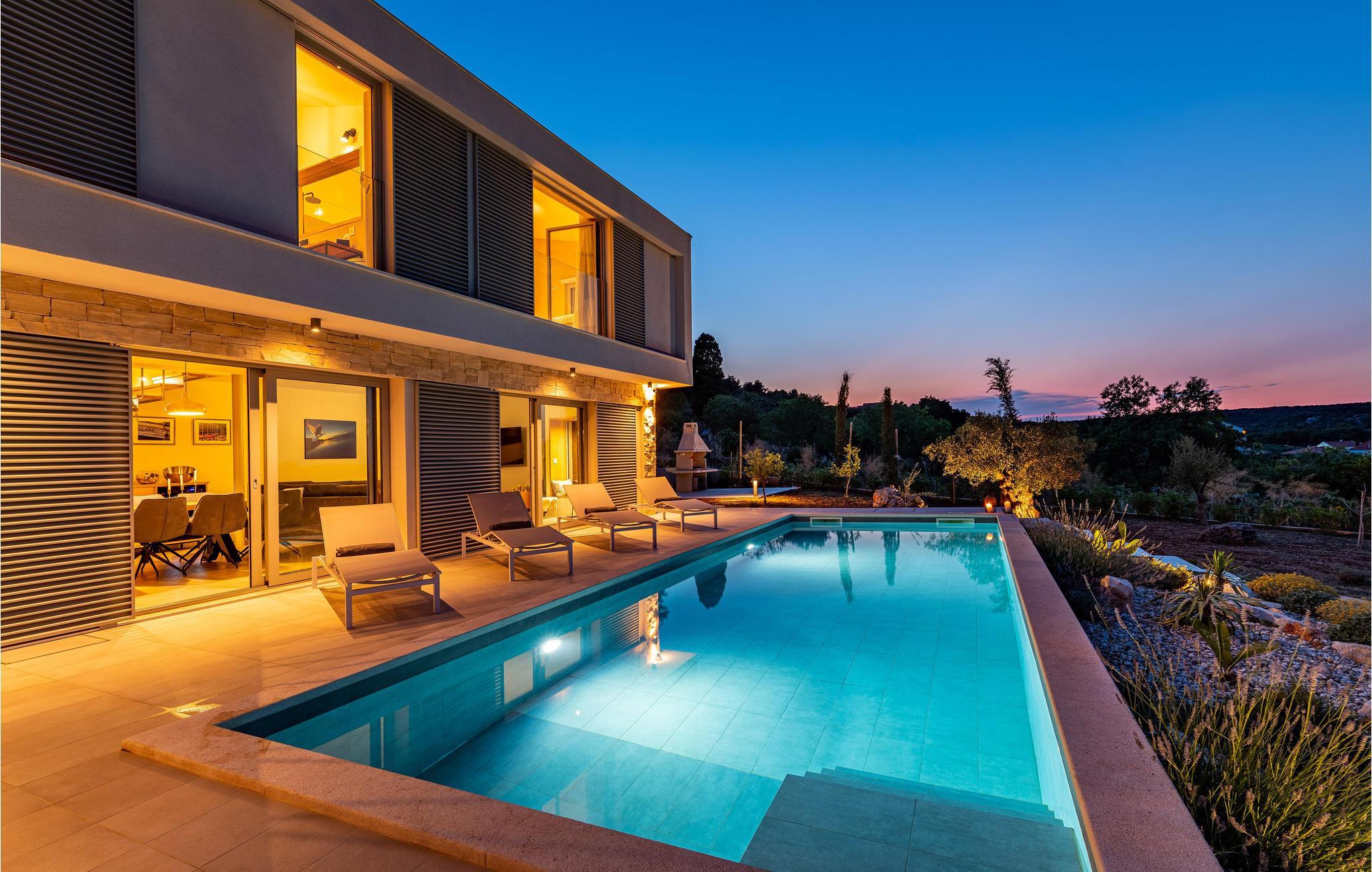 Diese außergewöhnliche Villa mit moderner Architektur lädt Sie zu einem unvergesslichen Urlaub ein. Der offene Wohnraum im Erdgeschoss kombiniert Küche, Esszimmer und Wohnzimmer zu einem luftigen Ambiente, das direkt auf die Sonnenterrasse mit Pool führt. Jede Etage bietet Ihnen eine eigene Terrasse, auf der Sie die ruhige Umgebung genießen können. Der Pool verspricht Erfrischung an heißen Tagen, während die Kinder im Garten spielen. Abends bereiten Sie Grillspezialitäten im Freien zu und lassen den Tag entspannt ausklingen.