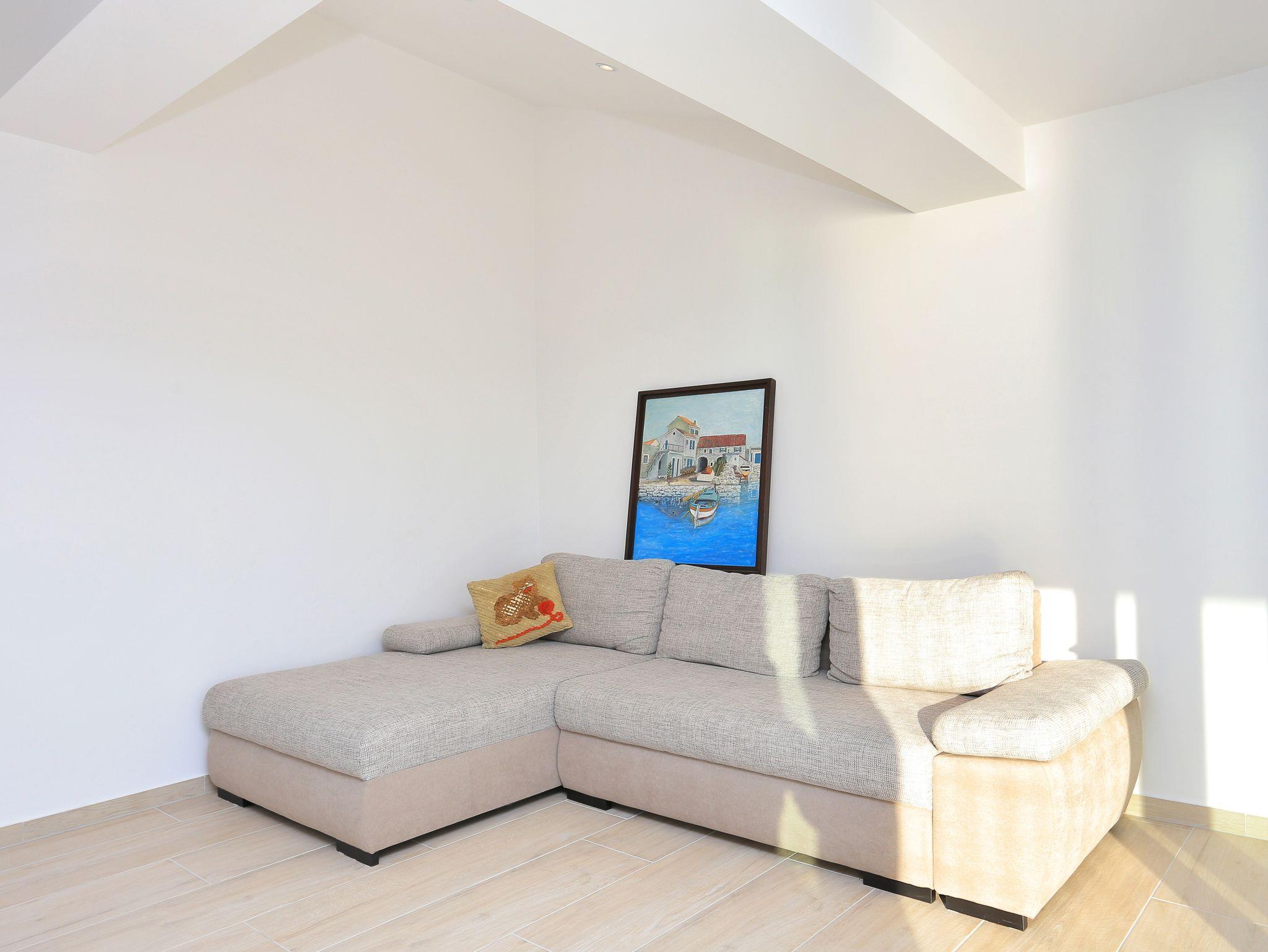 Ferienwohnung bietet Platz für 4 Gäste. Die Betten sind in Schlafzimmern, die es 1 gibt, und in Wohnzimmer, innerhalb einer Gesamtfläche von 47m2, angeordnet. Die Gäste haben eine eigene Terrasse zur Verfügung, auf der sie in warmen Sommernächten genießen können. Das Apartment bietet Meerblick. Es ist erlaubt, Speisen auf dem Gemeinschafts-Grill vorzubereiten. IM PREIS INBEGRIFFEN: Kurtaxe, Endreinigung, Parkplatz, Internet. VERBINDLICHE ZUSÄTZLICHE KOSTEN: Aufzahlung für Kurzaufenthalte (prozentualer Zuschlag pro Nächtigungsanzahl: 30% - 1, 20% - 2, 10% - 3). UNVERBINDLICHE ZUSÄTZLICHE KOSTEN: Klimatisierung (0,80 € pro Stunde), Wäschewaschen (5,00 € Waschen). Die Verfügbarkeit zusätzlicher Dienstleistungen in Ihrem reservierten Termin und die Preise derselben (falls nicht aufgeführt) müssen im Voraus überprüft werden. Zusätzliche Dienstleistungen die in der Zahlungsaufforderung nicht aufgeführt sind werden direkt beim Vermieter bezahlt, angenommen der Gast nutzt auch diese.