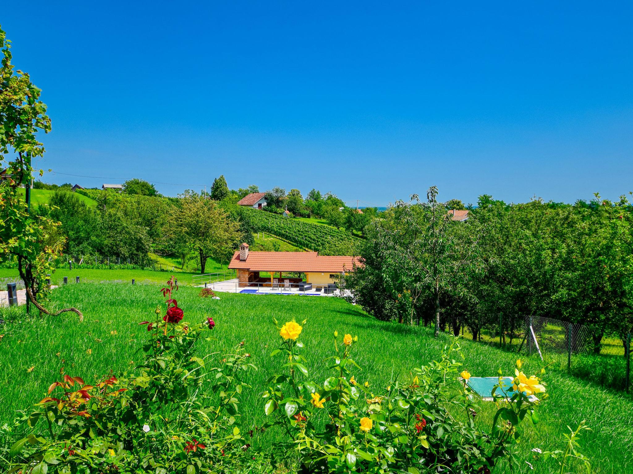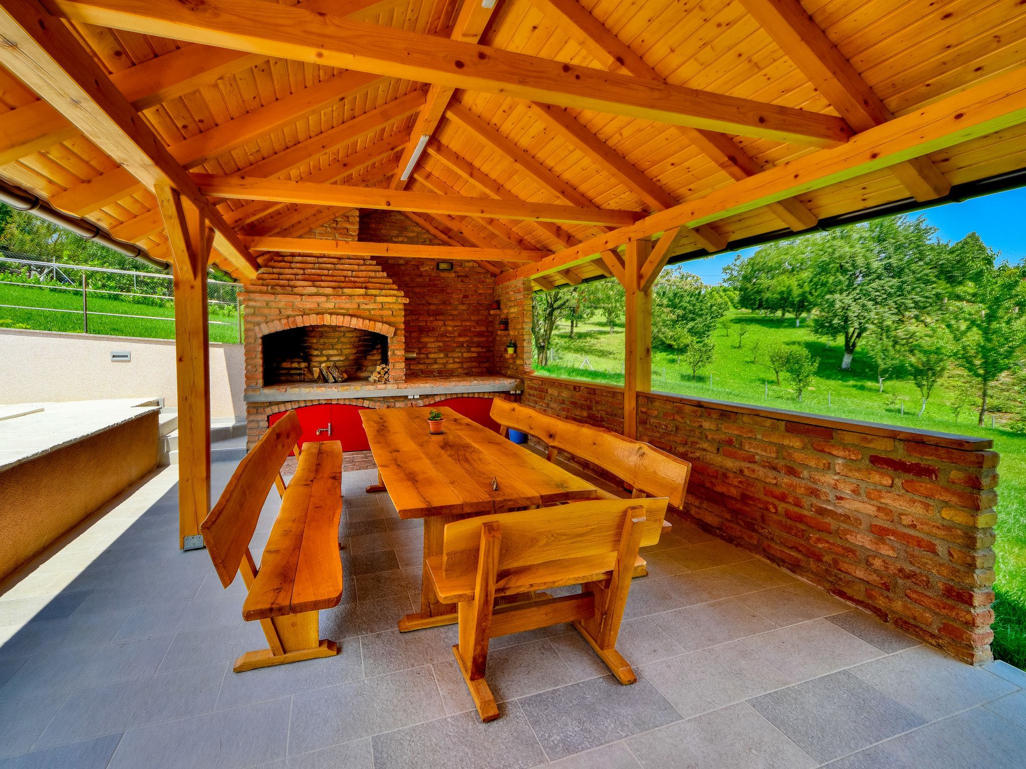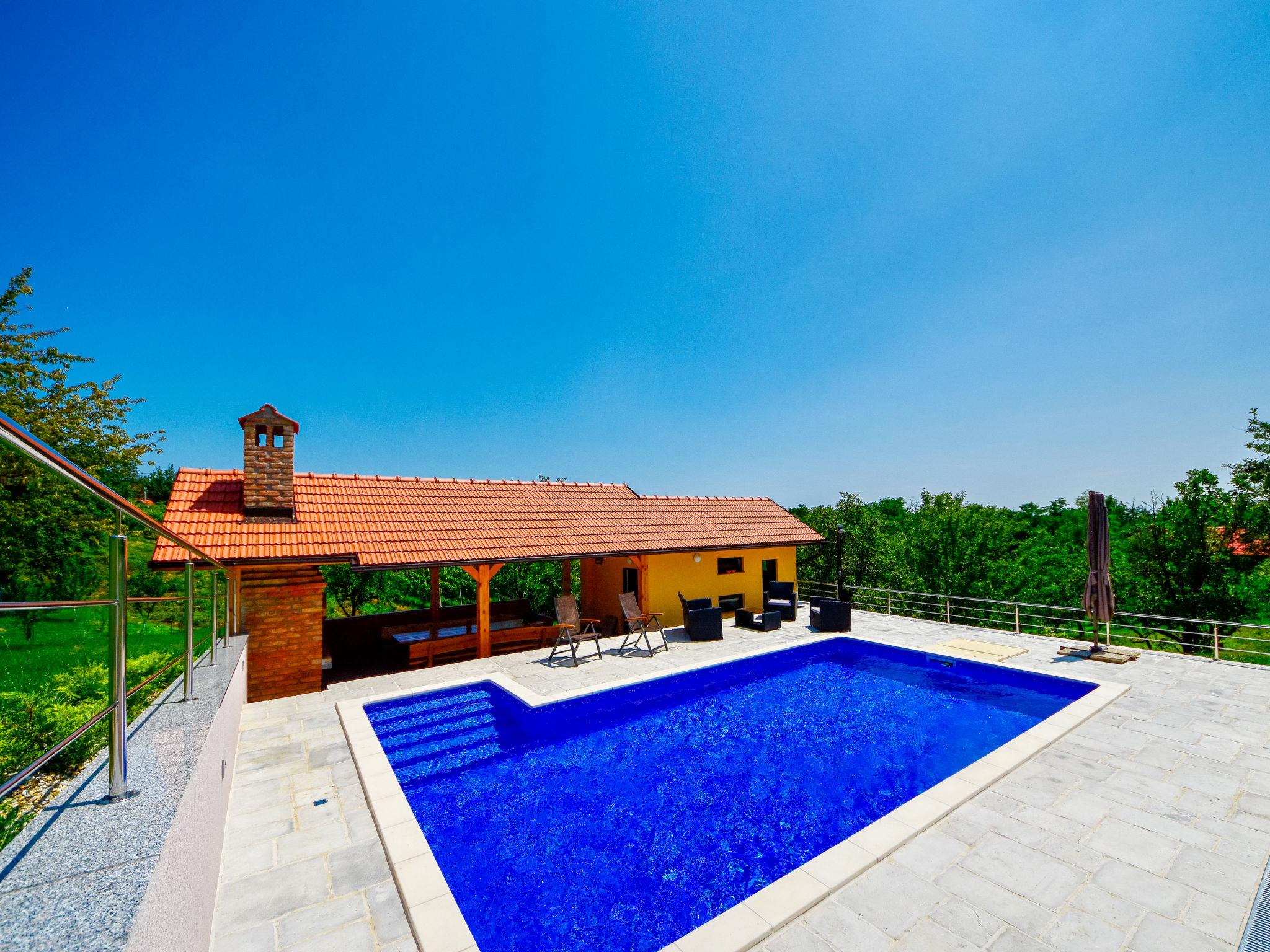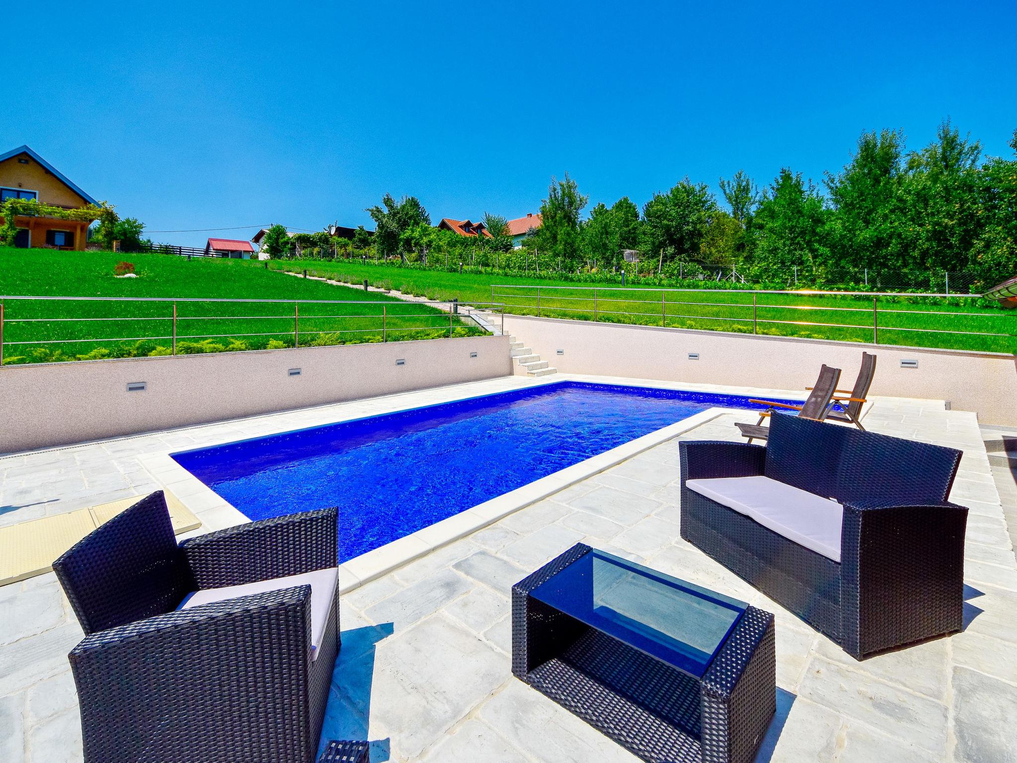 Single-family house "Madera", 2 storeys. In the hamlet Stancic 9 km from the centre of Dugo Selo, 35 km from the centre of Zagreb, in a quiet, sunny, elevated position, in a cul-de-sac, in the countryside. Private: property 2'500 m2 (fenced) with lawn 1'500 m2 flowers, swimming pool angular (9 x 4 m, depth 150 cm, seasonal availability: 01.Jun. - 30.Sep.) with internal staircase. Outdoor shower, pool house with WC and cooking stove, terrace (38 m2), garden furniture, barbecue. In the house: internet access, burglar alarm system. Parking (for 3 cars) at the house on the premises. Shop 2.5 km, supermarket 5 km, restaurant 9 km, bus stop 6.2 km. Please note: airfield 35 km from the property. Pool house (oven, dishwasher, freezer, beverage refrigerator).