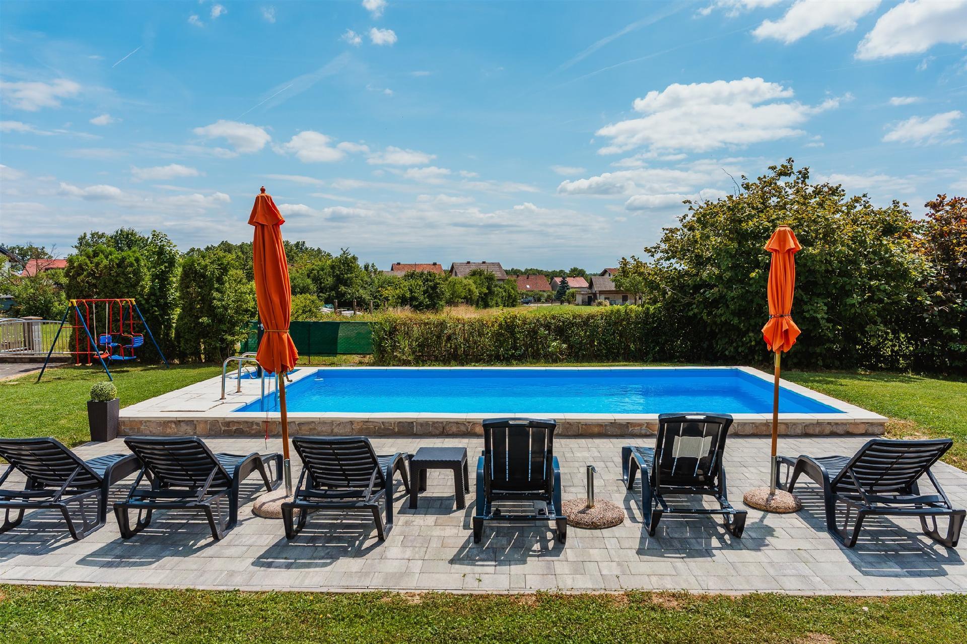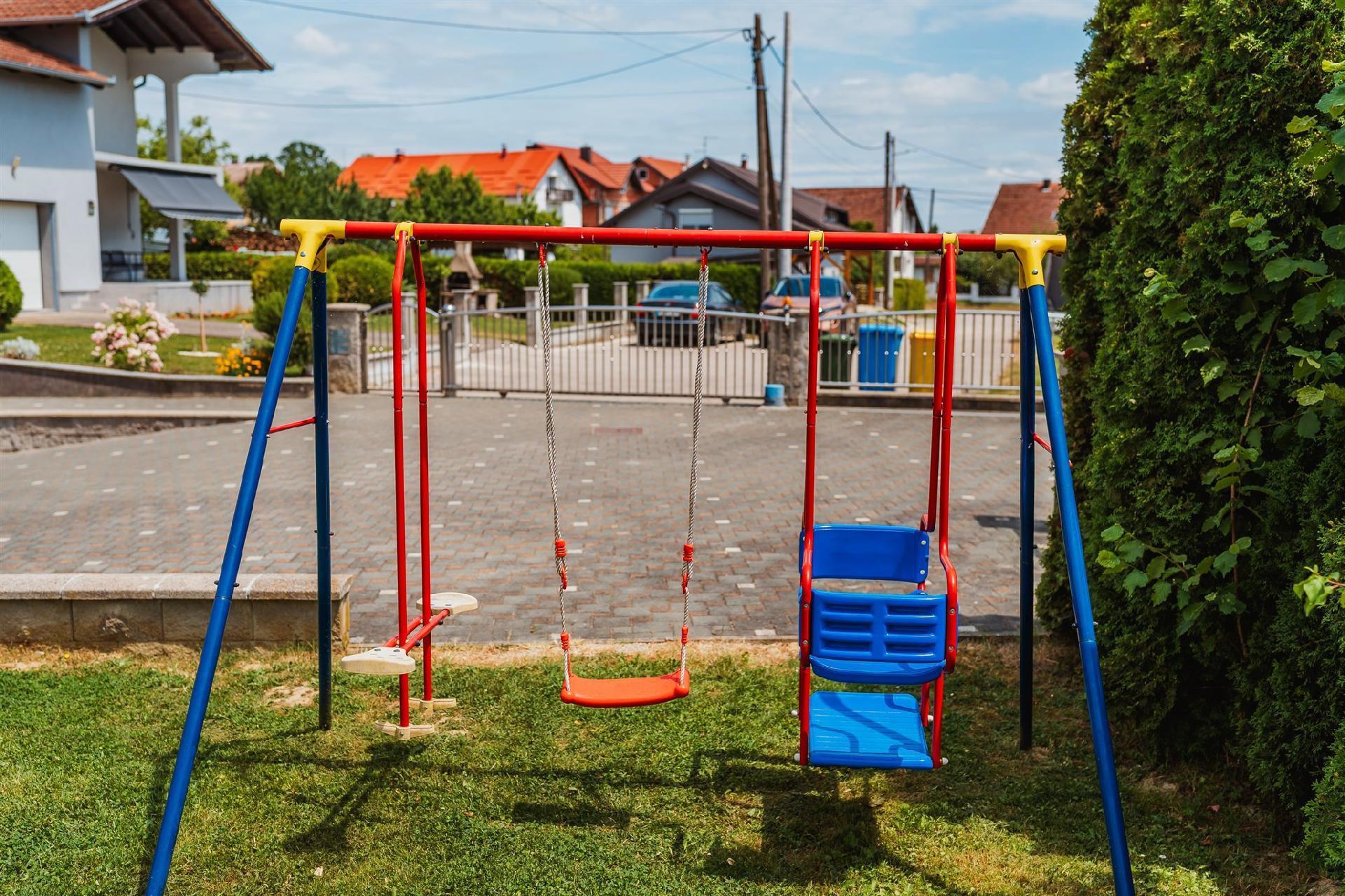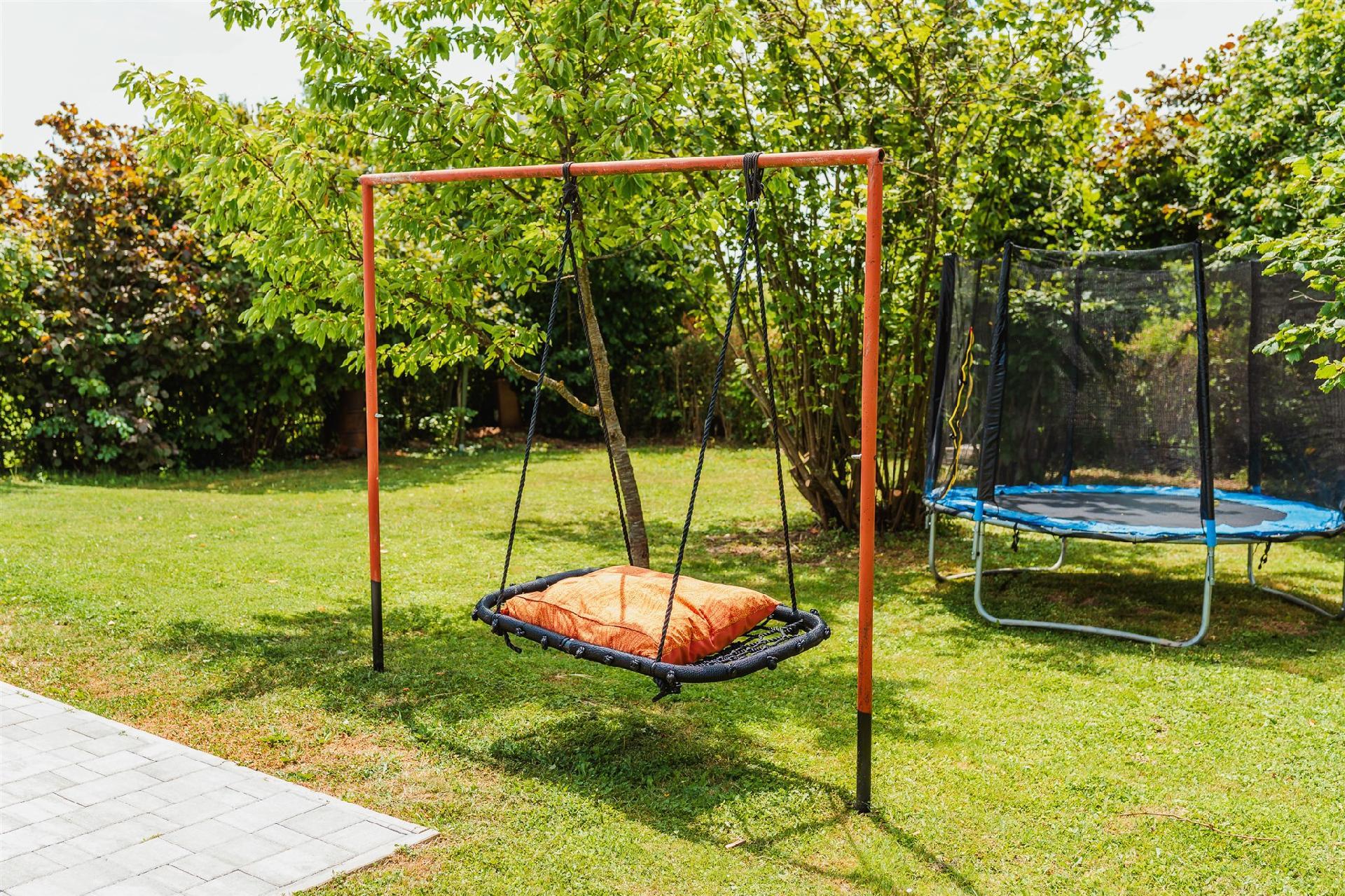 Outdoors, enjoy the pool and spacious terraces, perfect for sunbathing or relaxing in the shade. A barbecue is available for culinary enthusiasts, while children are delighted by swings, slides, and a trampoline – guaranteed hours of fun in the fresh air.