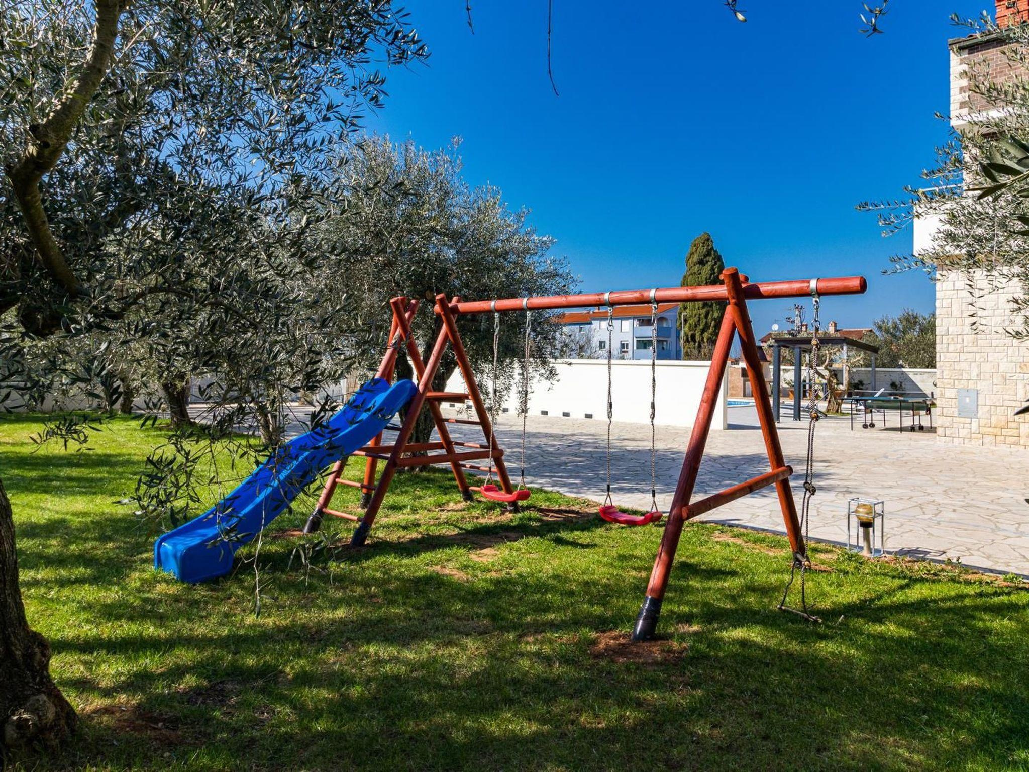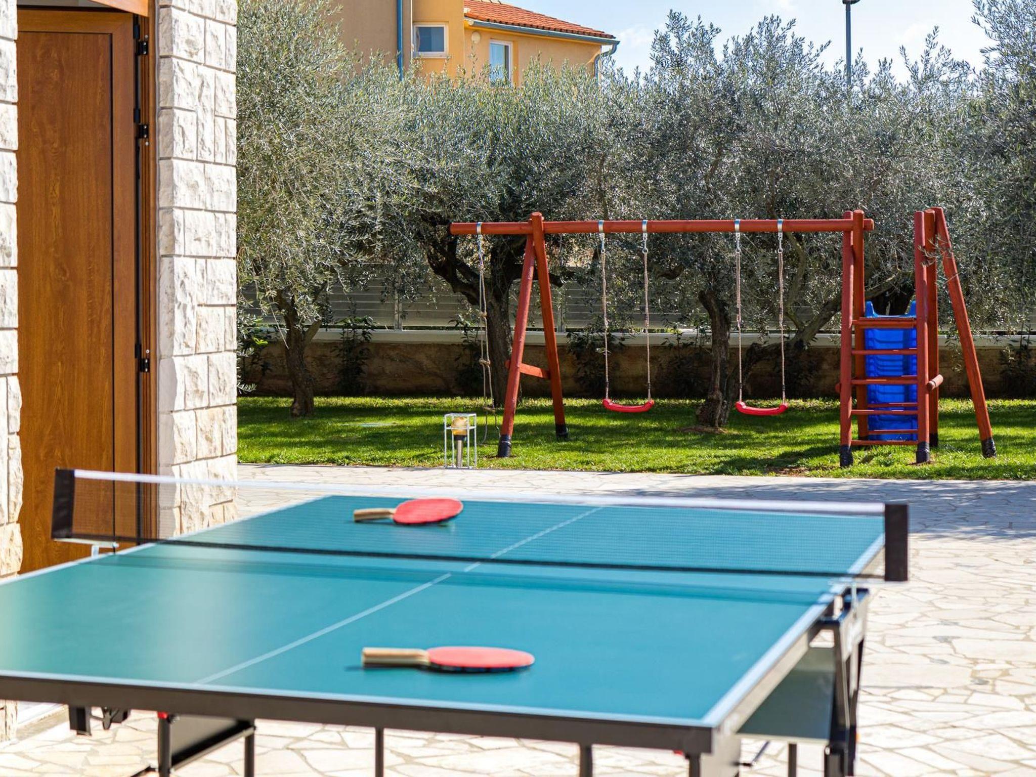 The yard is adorned with olive trees that provide a little shade for the children’s playground, and while the children are playing on the playground, some can frolic in the pool, and tennis fans can enjoy table tennis outside. The pool has the possibility of heating.