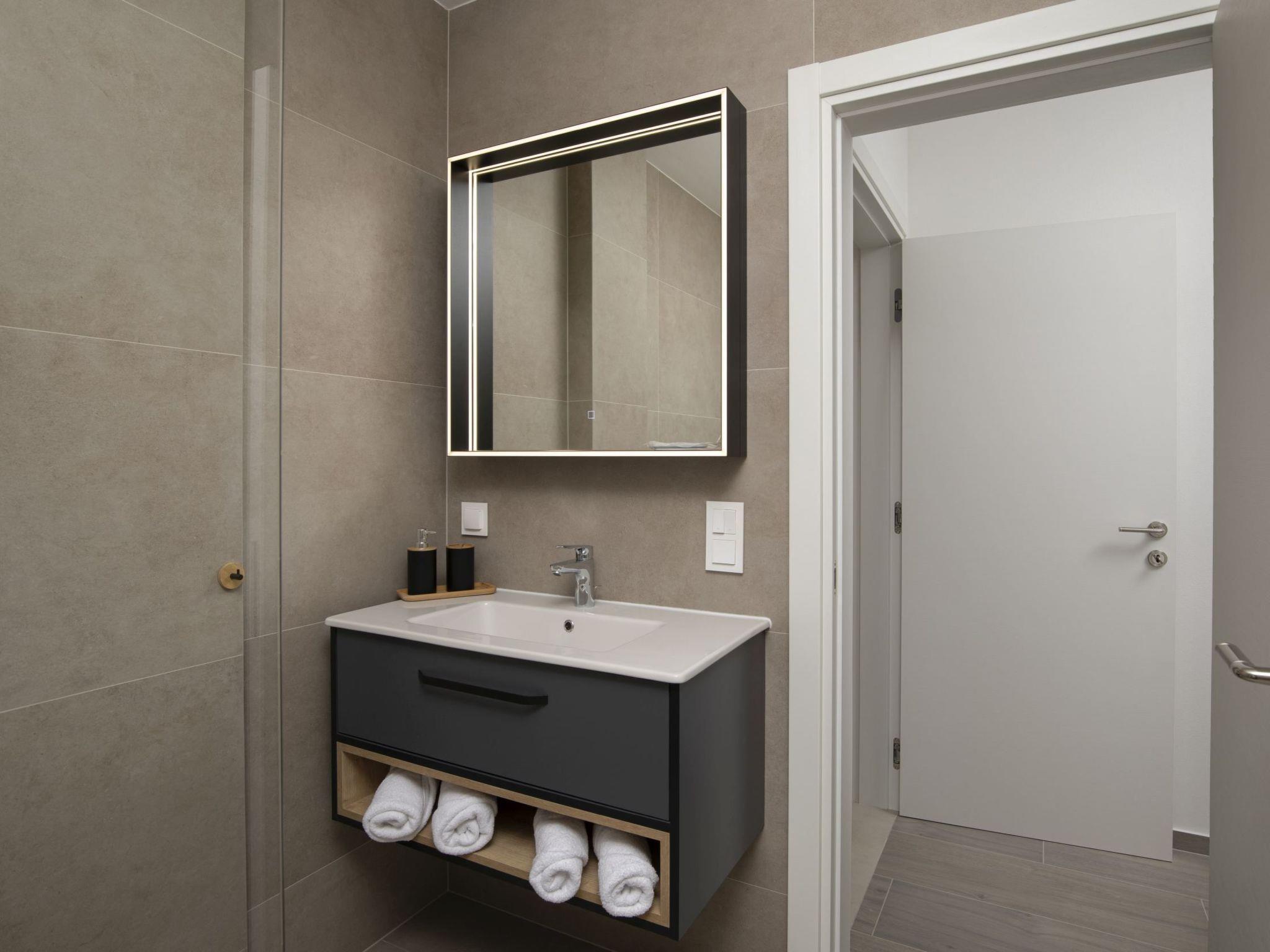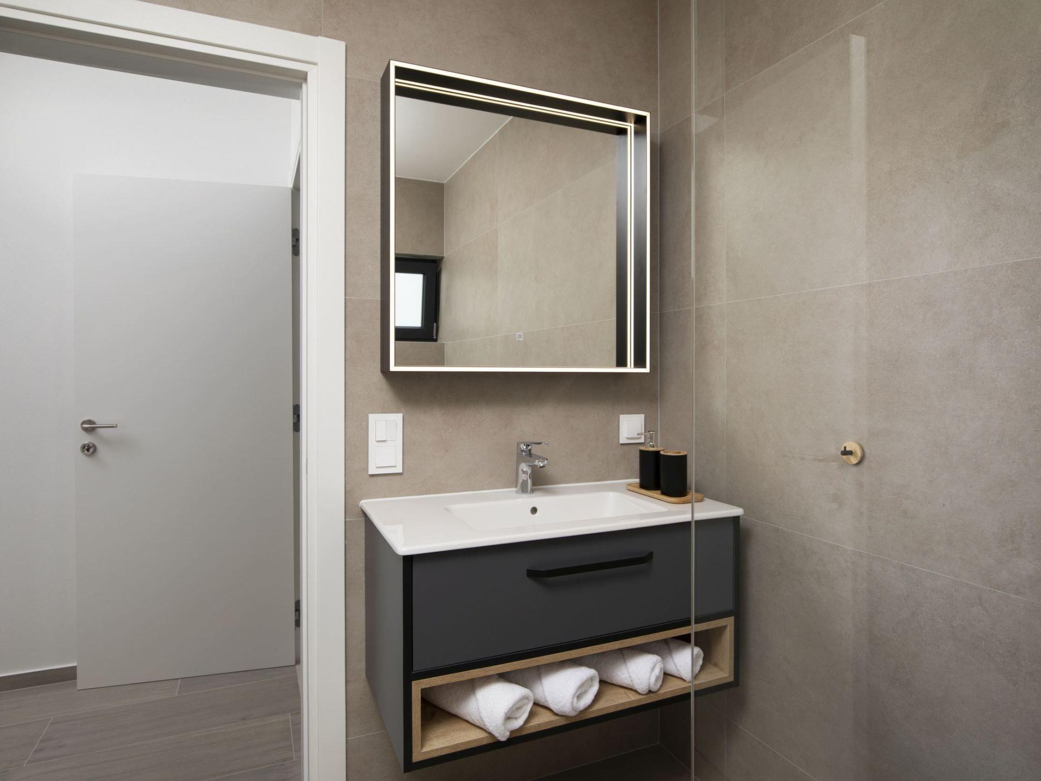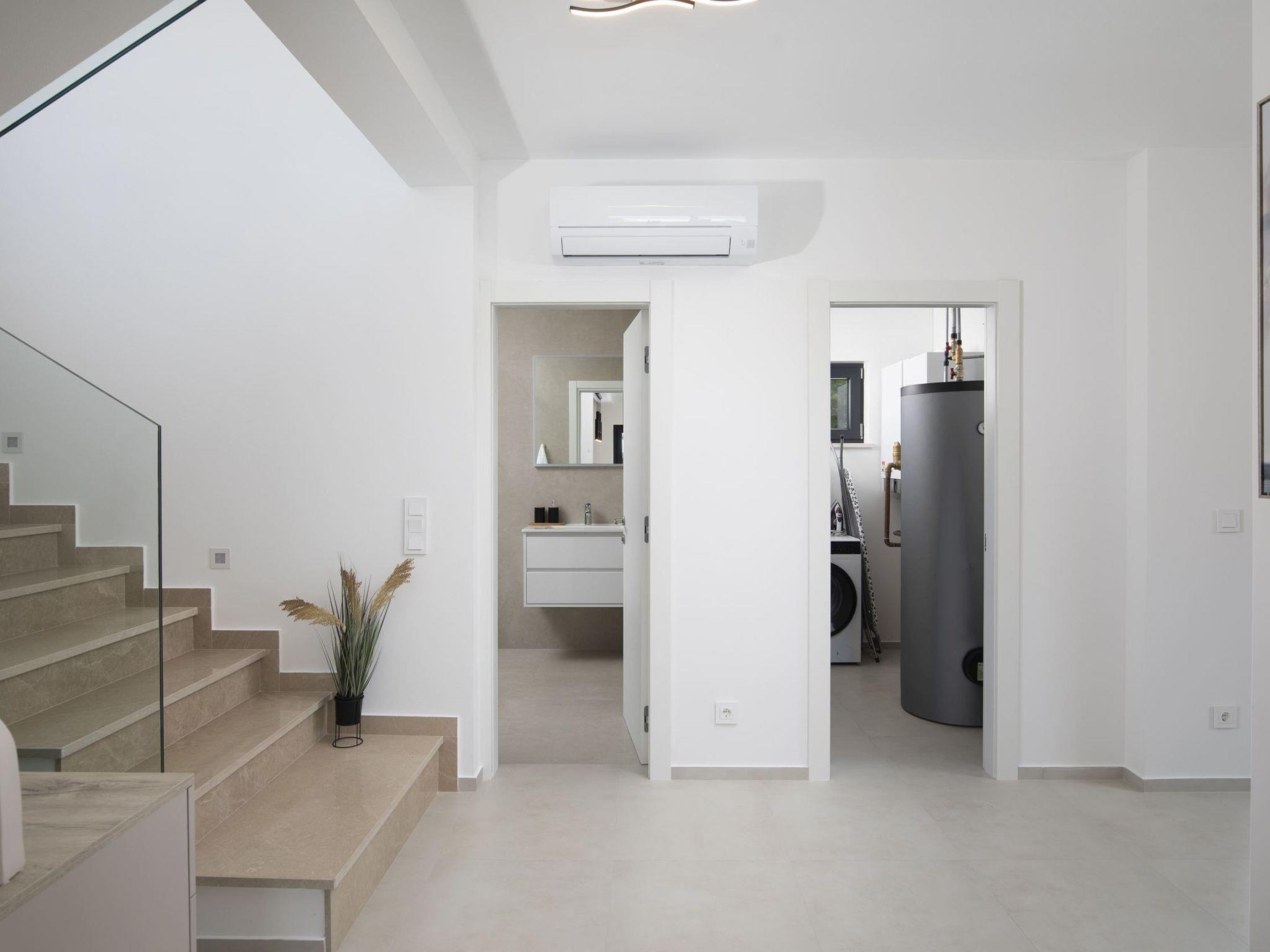 Upstairs, each of the three bedrooms features air conditioning, en-suite bathrooms with walk-in showers, and flat-screen TVs. One bedroom offers a private balcony, while the other two share a second balcony, perfect for morning coffee or evening relaxation.