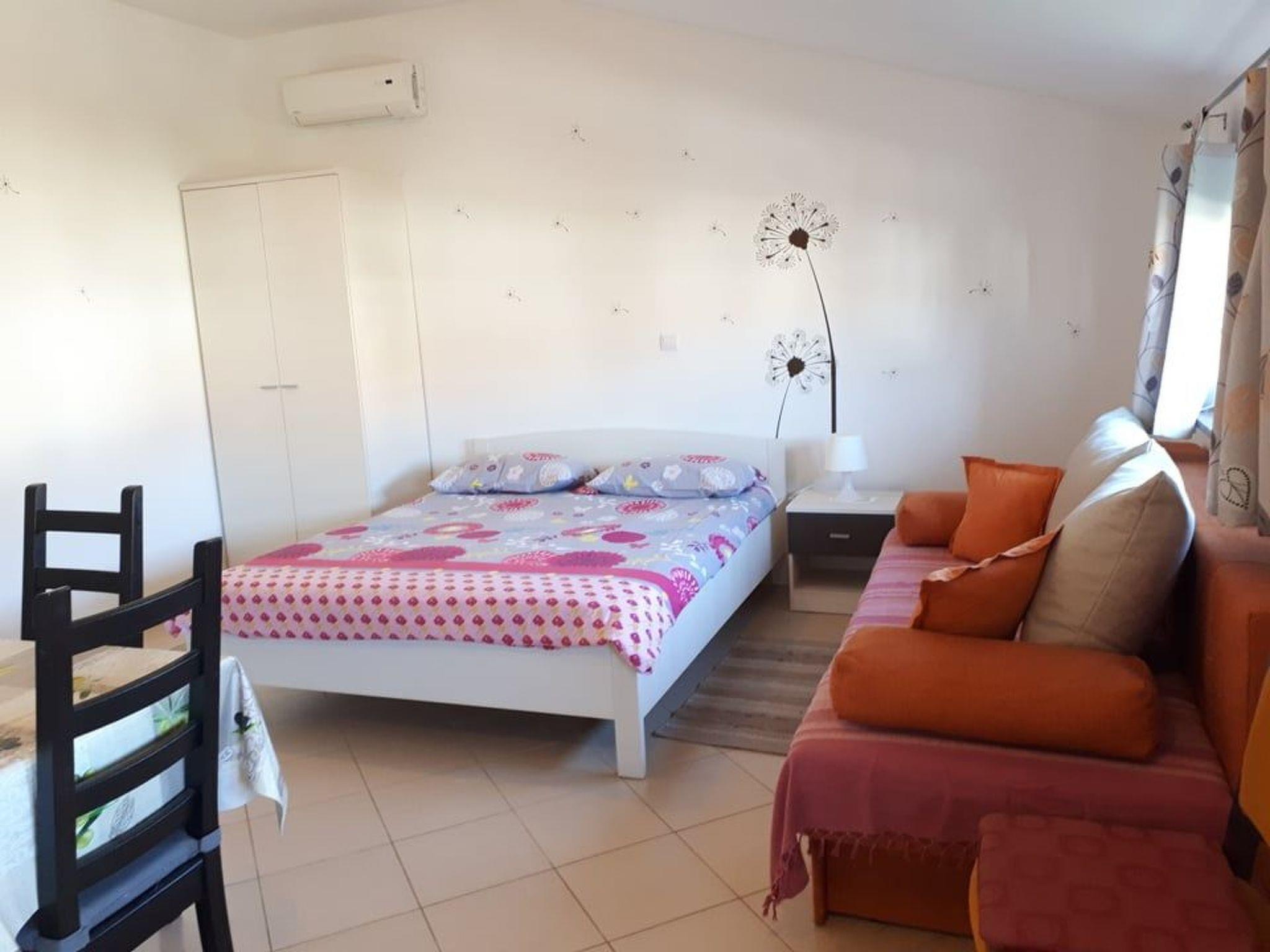 This studio apartment is located on the second floor of a residential building. It has a double bed, a kitchenette with a dining table and a sofa, air conditioning, a TV and Wi-Fi internet, and a bathroom with a shower.