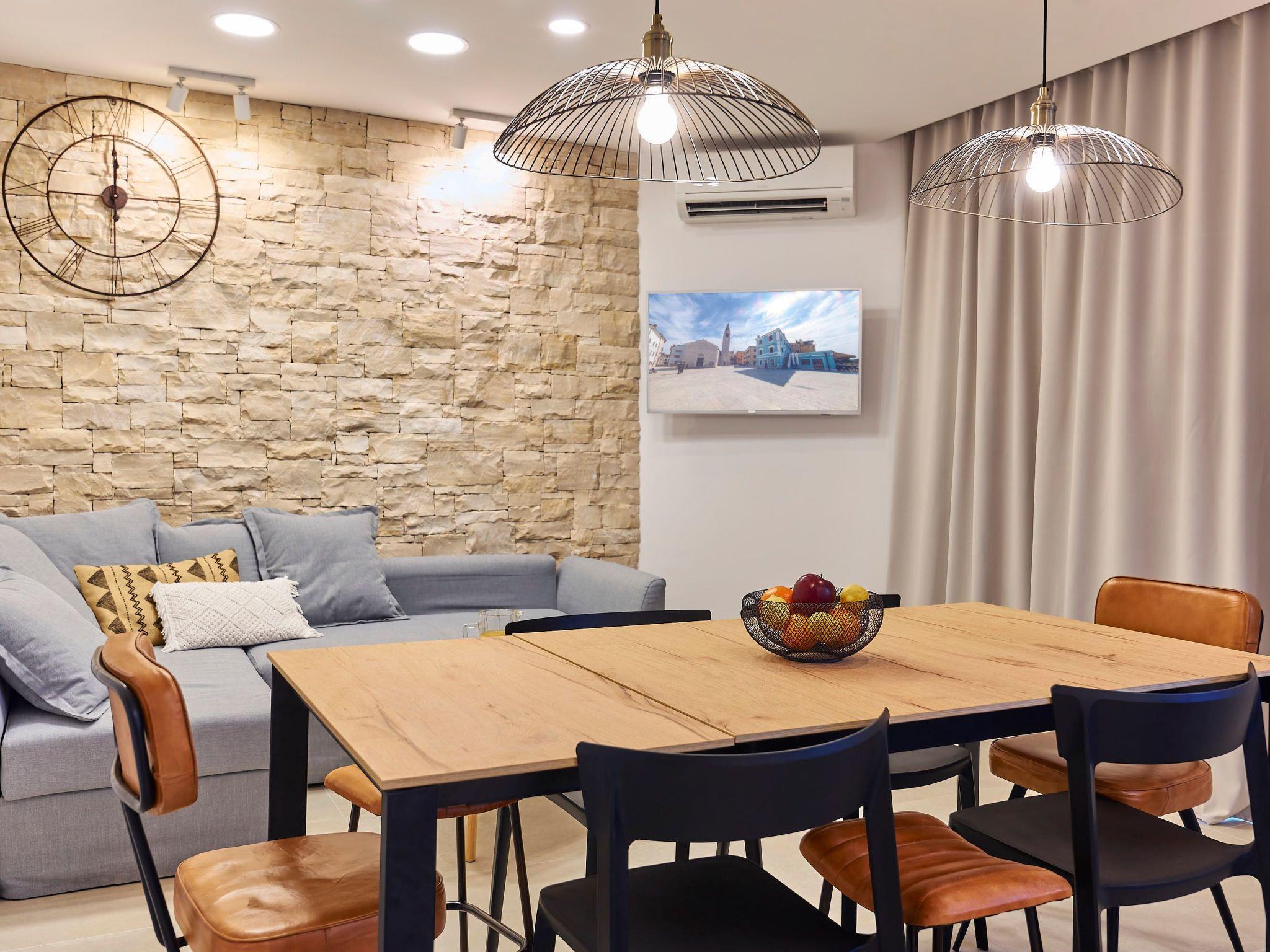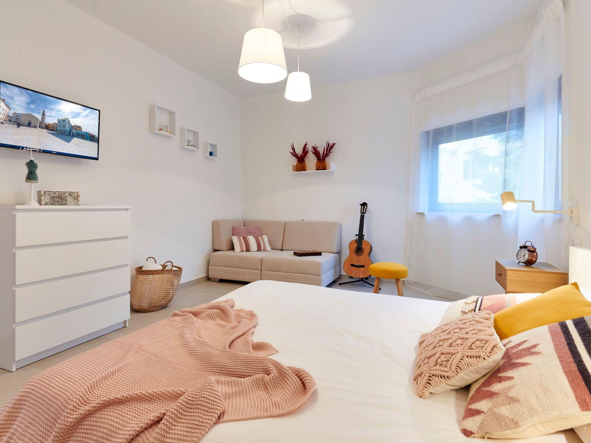 The unique style of this designer villa is the combination of modern and traditional Mediterranean interior design features, lending it a warm and cosy feeling. The villa boasts a living space of a generous 150m², spread across two floors. It can accommodate up to eight guests and is recommended for families with children or three couples. The ground floor consists of an open plan living and dining area with a fully equipped kitchen. This bright and airy space is equipped with air conditioning and SAT TV and offers the perfect environment where you and your friends can rest, watch TV, prepare and eat long holiday meals together. The top modern kitchen is complete with dishwasher, Ceran cooktop with stainless steel extractor hood, oven, microwave, fridge with freezer compartment, kettle, toaster and coffee machine. There is also one of the three bedrooms on the ground floor (all three bedrooms have their own, private ensuite bathroom and are furnished with a 160 x 200 cm double bed, a flat screen satellite television and air conditioning units). The ensuite bathroom is equipped with a rainshower, wash basin and toilet. There is a separate guest toilet for added comfort. A staircase leads to the upper floor. Here you find the other two bedrooms, one of which in addition to the king size bed also offers a double sofa bed (this bedroom sleeps four persons). The two bathrooms on this floor have the same equipment as the one downstairs. Upon request, a travel bed can be provided for a child.