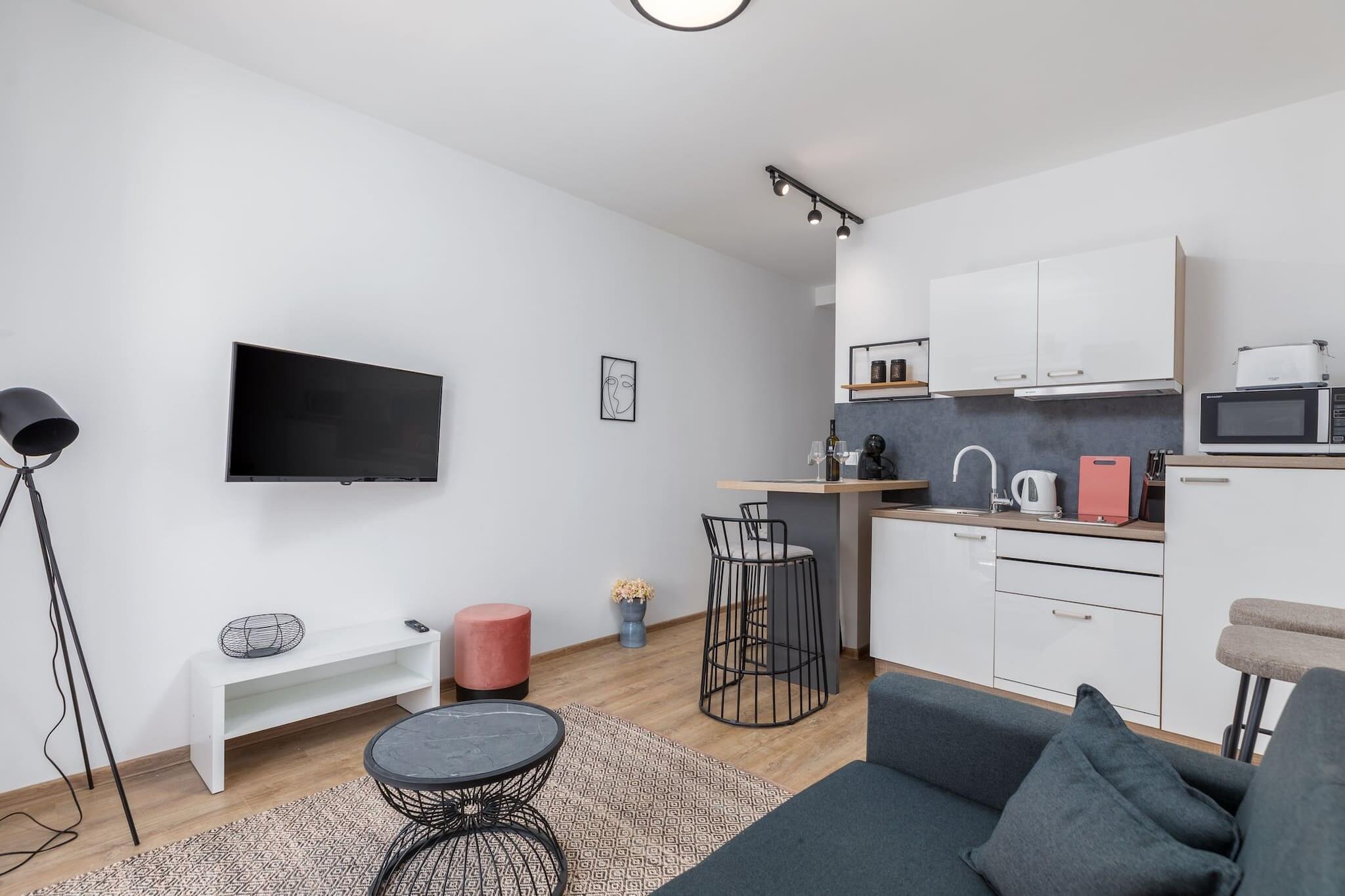 This modern apartment is ideal for families, offering a comfortable stay for up to 4 people, with a maximum of 2 adults and 2 children. The apartment includes one bedroom with a queen-sized bed, a sofa bed in the living area, a bathroom, a fully equipped kitchen, and a dining space. A spacious balcony allows guests to enjoy the fresh air. The property is fully air-conditioned, ensuring a pleasant stay year-round. Guests also have access to a large shared garden of over 2000 m² with a swimming pool, BBQ facilities, and plenty of space to relax. Baby cots are available upon request, making it convenient for families with young children. Located in Valbandon, the apartment is just 900 meters from the beach and 600 meters from a grocery store. Fažana, a small coastal town known for its beautiful architecture and family-friendly beach, is also nearby. Visitors can explore the stunning National Park Brijuni by taking a boat from Fažana. The area offers plenty of opportunities for outdoor activities, including hiking and cycling, with easy access to local cafes, restaurants, and attractions. Pula, with its historic sites and vibrant cultural scene, is a short drive away. The apartment features a well-equipped kitchen with all the necessary appliances for a self-catered stay, including a fridge, stove, and oven. Additional amenities include free Wi-Fi, air conditioning, and private open-air parking. For those with pets, the apartment welcomes animals for an additional fee, except for dangerous animals. A cleaning fee is required upon arrival, and bike storage is available for cycling enthusiasts.