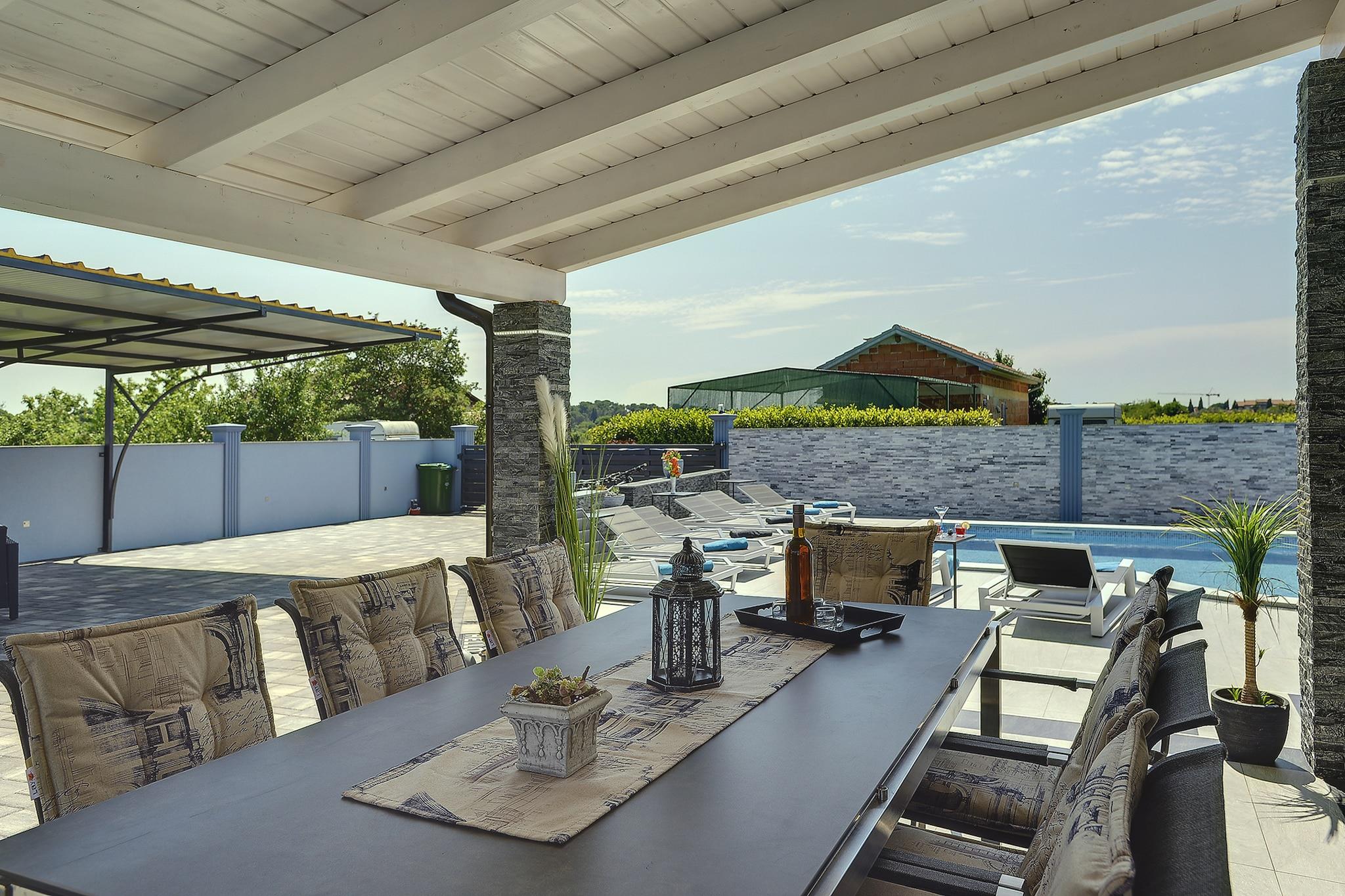 Only 1 km from the beach, this is a contemporary 4-bedroom villa in Faana and is ideal for a family or a friendly group of 8 persons. The villa has a private swimming pool with an outdoor shower and a bubble bath for an exotic vacay. Faana is sure to get you mesmerized with Istria's beauty and local produce such as amphorae, wine, and olive oil. You can walk to the supermarkets at 750 m and buy groceries. To eat at the local restaurants, you have to go to 950 m. The beach at 1 km invites you to spend long hours sunbathing and walking by the water. For a day-tour, consider visiting the historical center of Pula or the National Park Brijuni. The air-conditioned living rooms of the villa are great for a pleasant family get-together. After swimming, you can wash up in the outside shower. On the loungers by the pool, you can read a book and soak up in the sun. Later, you can go for walks in the fenced garden and enjoy barbecued meals. A children's bed is also present.