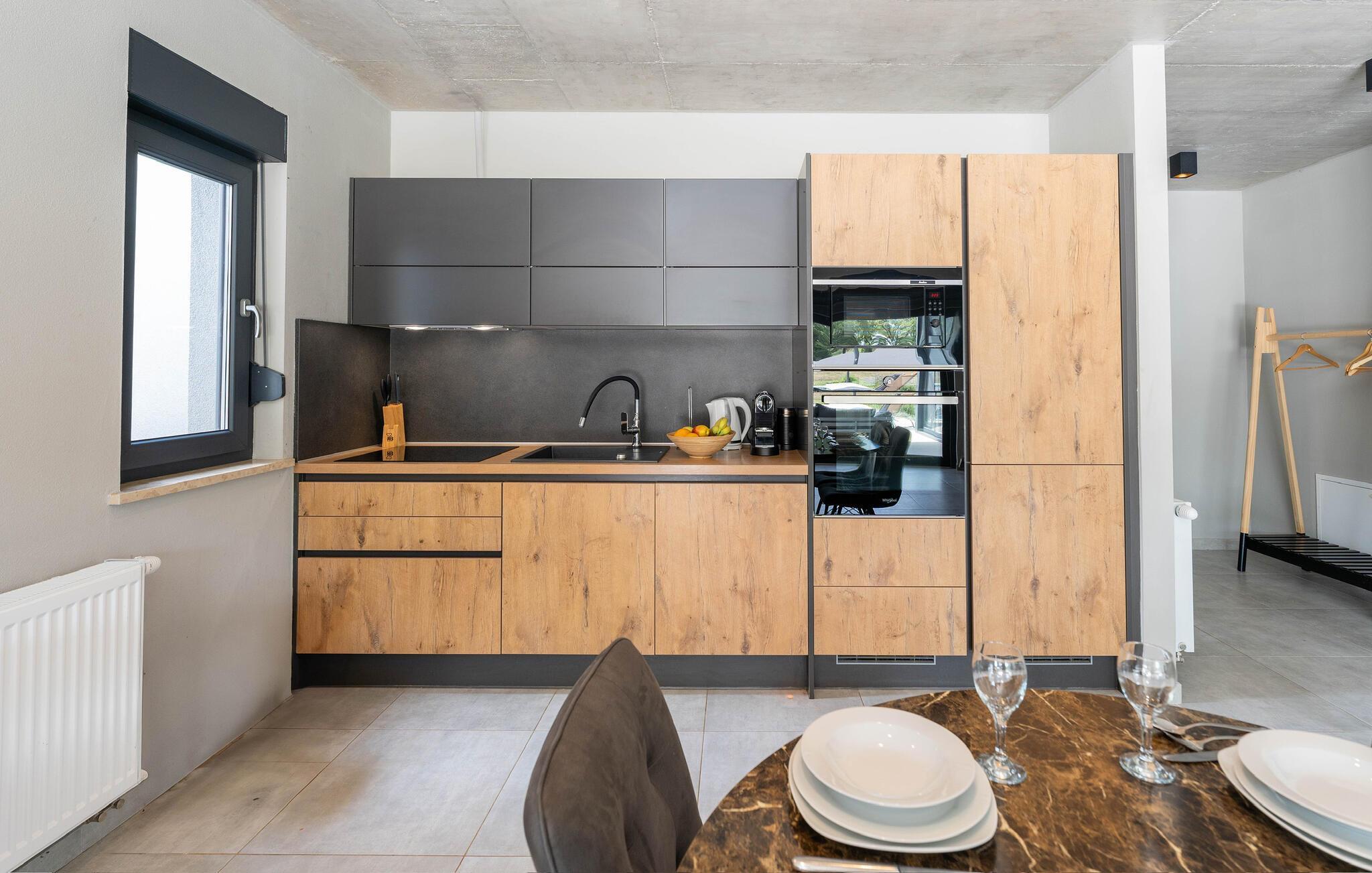 Das Innere der Villa Fran zeichnet sich durch einen eleganten modernen Stil aus. Das Wohnzimmer ist modern eingerichtet, aber die warmen Möbel, der Kamin und der wunderschöne Blick auf die schöne Umgebung durch große Glaswände sorgen für eine entspannte Atmosphäre. Vom Wohnzimmer aus erstreckt sich ein Esszimmer und eine voll ausgestattete Küche in gedämpften Tönen. Im Erdgeschoss befinden sich auch zwei geräumige, komfortable Schlafzimmer mit eigenen, elegant eingerichteten Badezimmern.